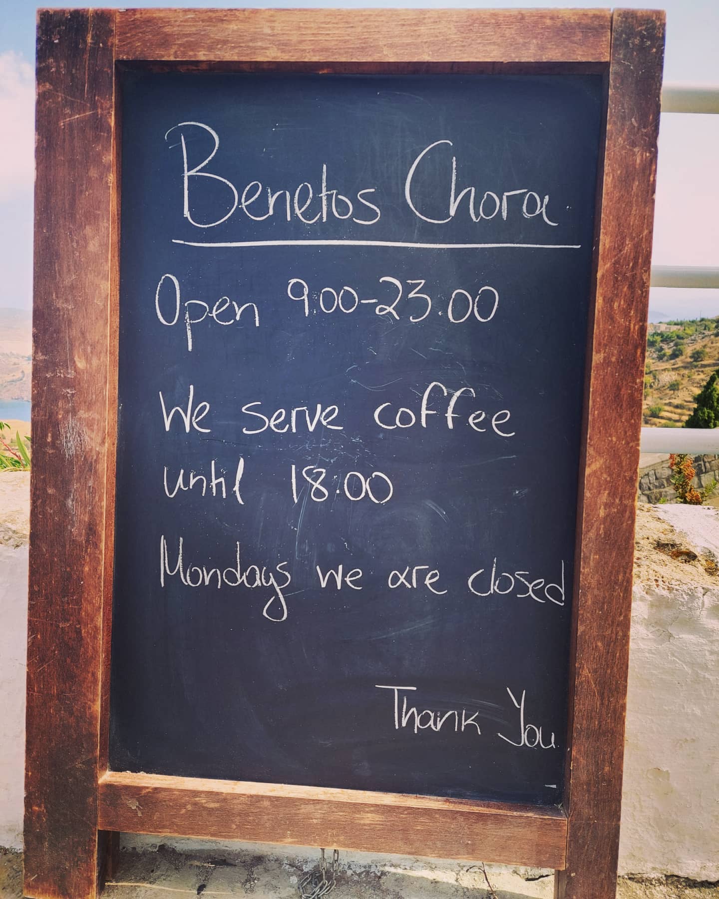 Για καφέ και brunch: Στο «Benetos Chora» (Χώρα, Τηλ. 22470 34537) φτιάχνουν ωραίο καφέ, smoothies με φρέσκα φρούτα και λαχανικά, πλούσια πρωινά και brunch και μεζέδες με ποικιλία κρασιών και επιλεγμένα αποστάγματα.