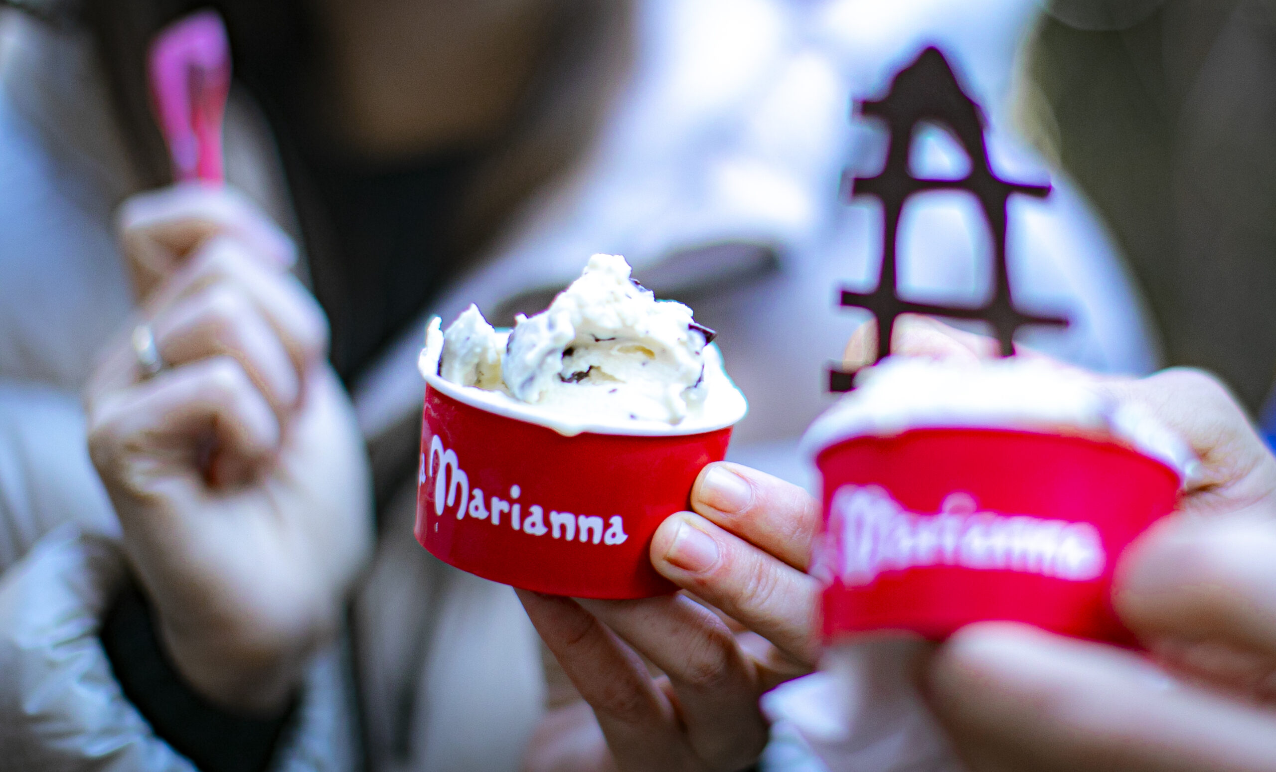 Το Μπέργκαμο δεν είναι γνωστό μόνο για την κουζίνα του, αλλά και για τη ζαχαροπλαστική. Εκεί, άλλωστε γεννήθηκε η στρατσιατέλα και συγκεκριμένα στα εργαστήρια του ιστορικού ζαχαροπλαστείου La Marianna που ιδρύθηκε το 1961. Ο «πατέρας» του λαχταριστού παγωτού και ιδιοκτήτης της γλυκιάς γωνιάς στην Άνω Πόλη είναι ο Ενρίκο Πανατόνι, ο οποίος ενώ ετοίμαζε παγωτό fiordilatte πρόσθεσε μία δόση λιωμένης μαύρης σοκολάτας. Η λιωμένη σοκολάτα σε επαφή με το παγωτό ρευστοποιήθηκε και οι λεπίδες της μηχανής του την έκοψαν σε μικρά ακανόνιστα κομμάτια. Με αυτόν τον τρόπο γεννήθηκε η στρατσιατέλα που έγινε γνωστή σε ολόκληρο τον κόσμο. Γλυκίσματα του ζαχαροπλαστείου μπορείτε να γευθείτε και στο αεροδρόμιο πριν μπείτε στο αεροπλάνο της επιστροφής.