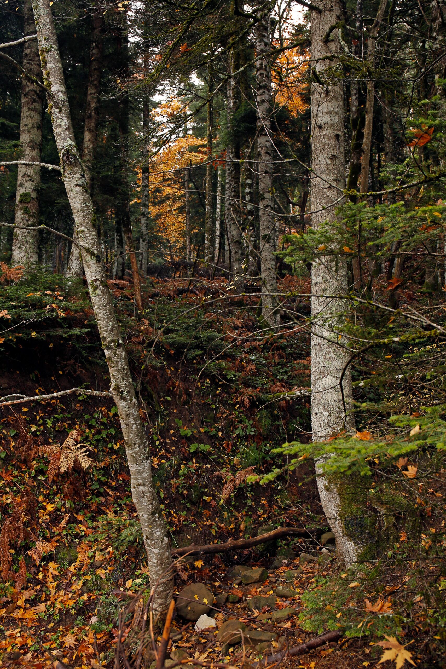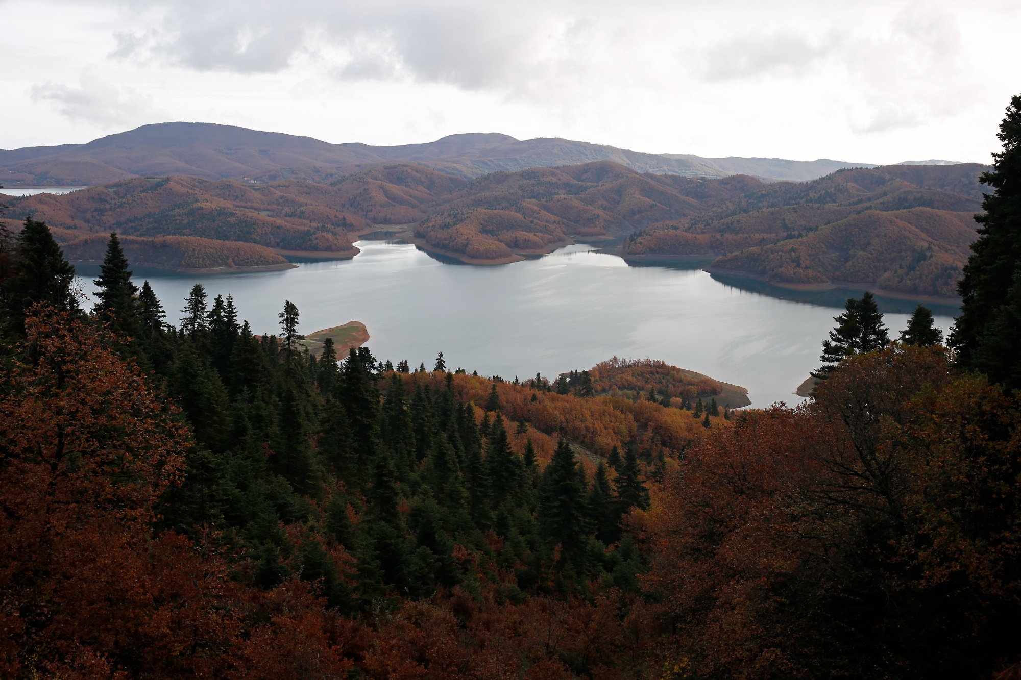 Ο δείκτης ταχύτητας του αυτοκινήτου μου δεν ξεπερνά τα 30 χιλιόμετρα ανά ώρα, καθώς έχω αποφασίσει να απολαύσω κάθε ένα από τα 50 χιλιόμετρα της διαδρομής. Μεσοβδόμαδα η κίνηση γύρω από τη λίμνη είναι ελάχιστη ενώ η πορτοκαλί και καφετιά φύση γύρω μου μοιάζει σχεδόν ψεύτικη και απόκοσμη. Σαν να είμαι κομμάτι ενός ζωγραφικού πίνακα, μελαγχολικού αλλά και αισιόδοξου, όμως τρισδιάστατου. Τα χωριά που προσπερνώ, η Καστανιά και η Μούχα, σπάνε την ομοιομορφία του χρωματιστού χαλιού, καθώς κάθονται ήσυχα στις πλαγιές γύρω από τη λίμνη. Ο καπνός από κάποιες καμινάδες προδίδει τους μόνιμους κατοίκους.
