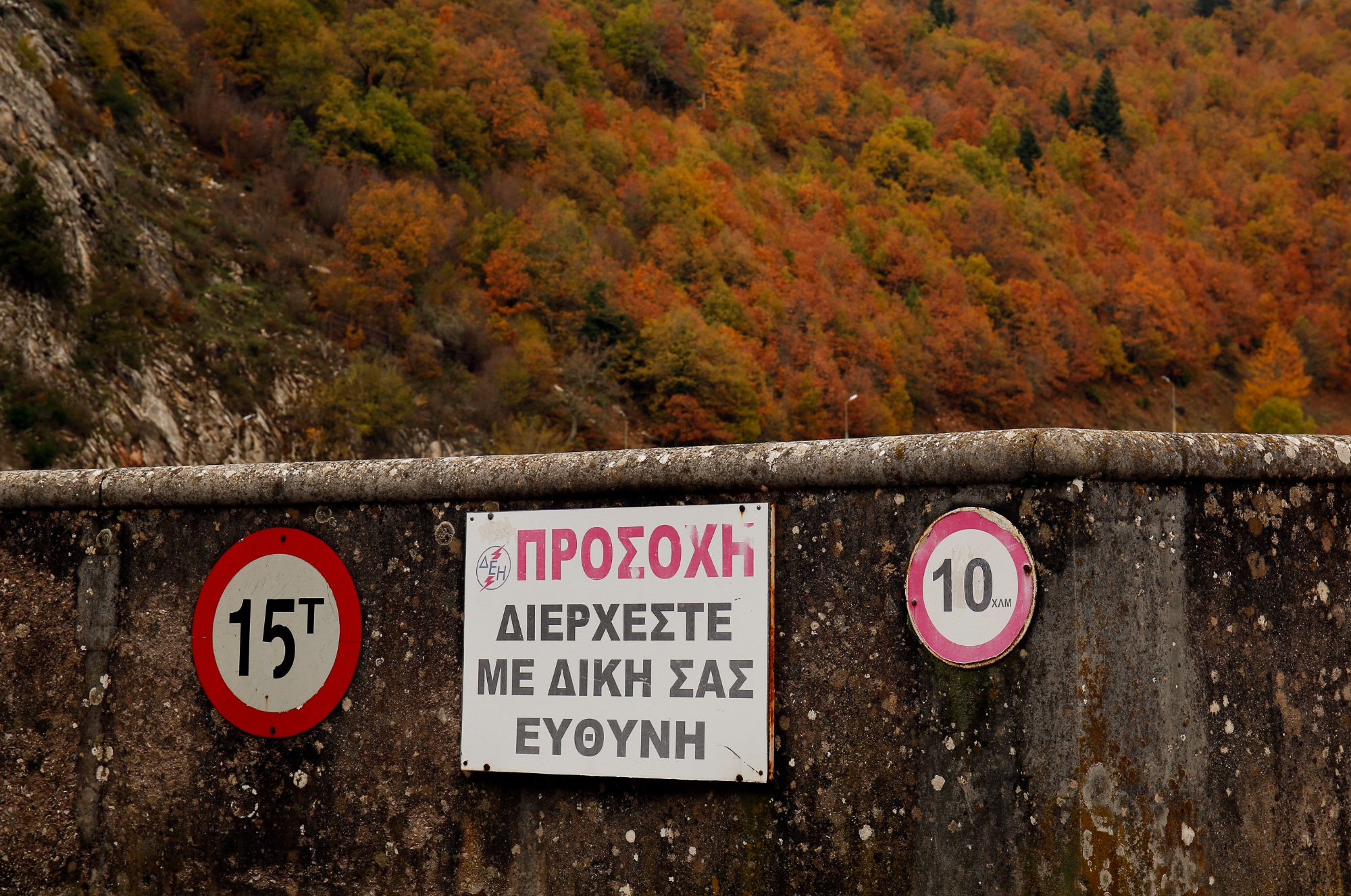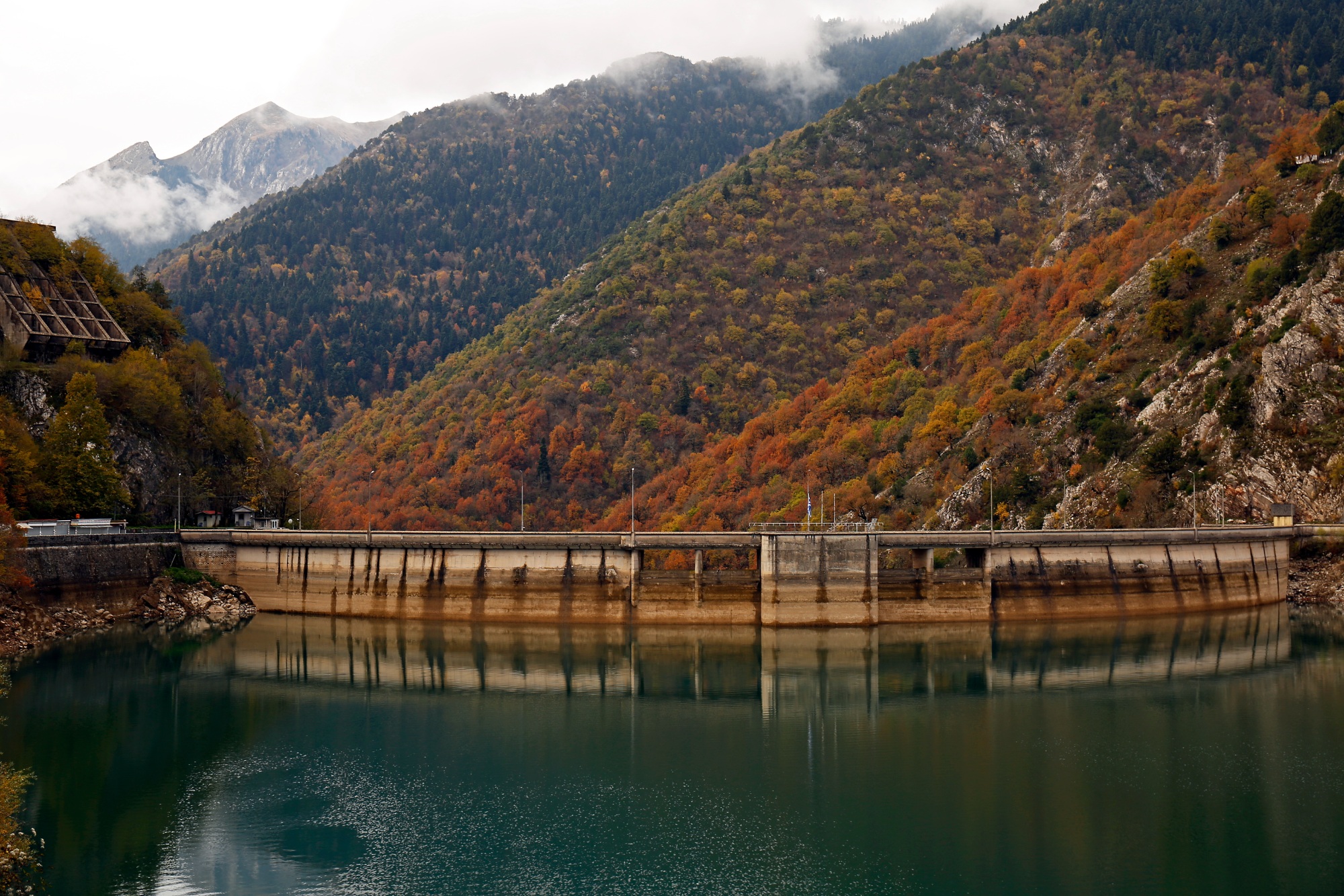 Τα τουριστικά καταστήματα στο φράγμα είναι κλειστά σήμερα. Η ησυχία είναι σχεδόν εκκωφαντική. Η συμπαγής γαλλική κατασκευή μοιάζει παράταιρη στο όλο σκηνικό, μια φουτουριστική εικόνα από το παρελθόν, η οποία συγκρατεί τους υδάτινους όγκους με μια τεκτονική αυτοπεποίθηση. Η μεγάλη ανάγλυφη πινακίδα στο ένα άκρο του φράγματος, εξηγεί με λίγα λόγια την ιστορία του. Η θέα ολόκληρης της κατασκευής από απέναντι, καθώς ο δρόμος ανηφορίζει φεύγοντας προς το Νεοχώρι, είναι συγκλονιστική.