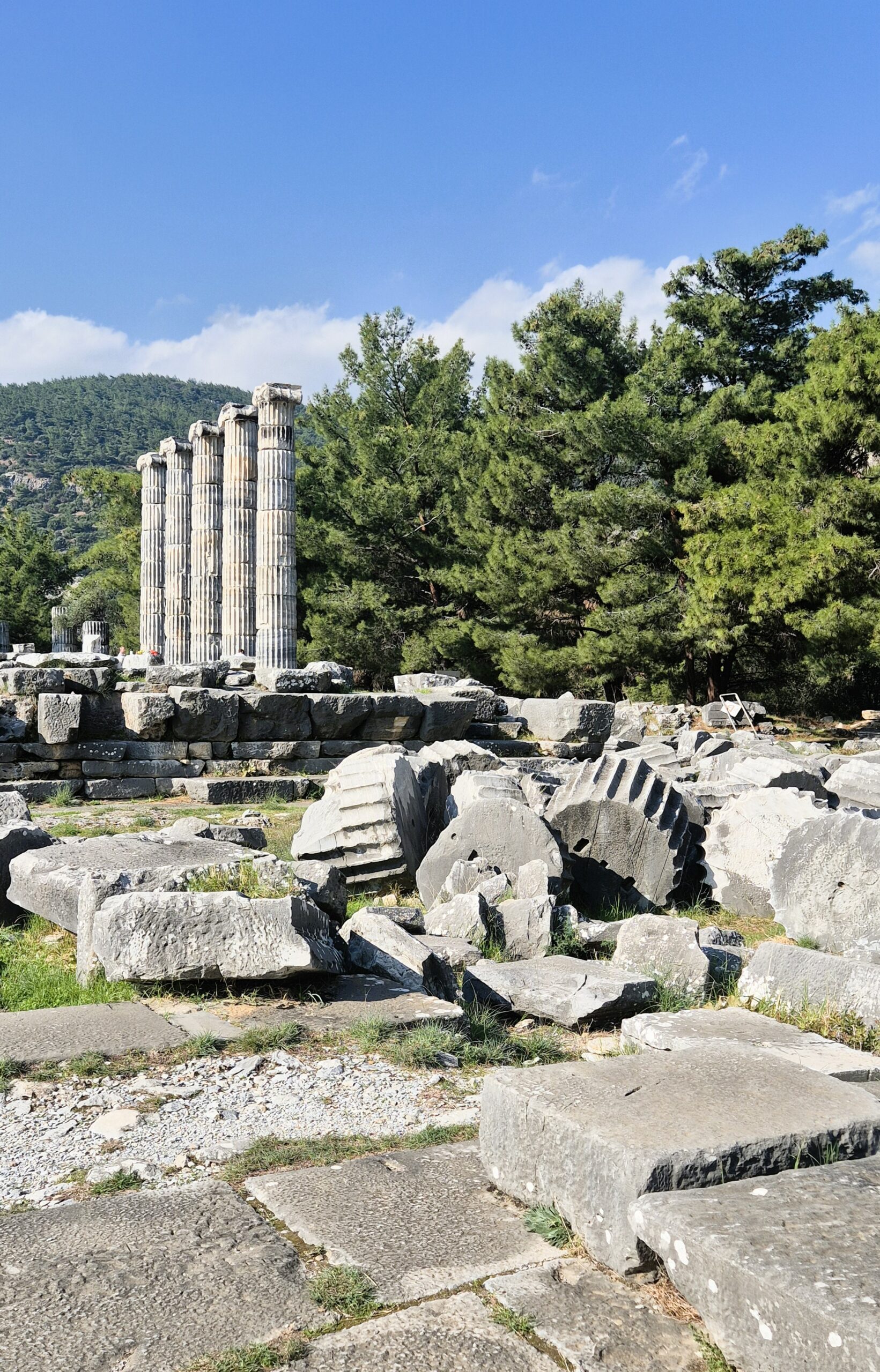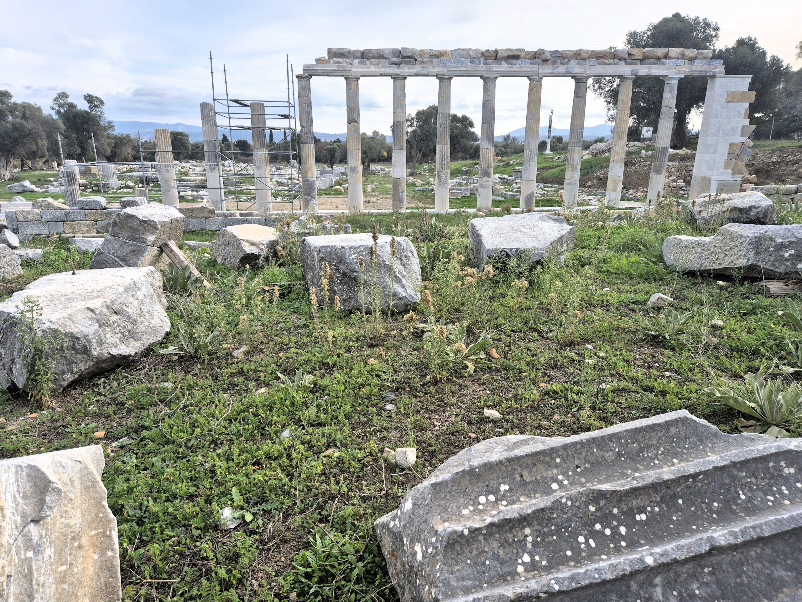 Δεσπόζει ο ναός του Διονύσου, ο μεγαλύτερος αφιερωμένος στο θεό του κρασιού, του τρύγου, του γλεντιού και της γονιμότητας ναός, σε όλο τον αρχαίο κόσμο. Για τις θεαματικές του διαστάσεις μας δίνουν μια εικόνα οι εν μέρει αναστυλωμένοι, ιωνικού ρυθμού κίονες – έντεκα στις μεγαλύτερες και έξι στις μικρότερες πλευρές του, ενώ για τις τέσσερις στοές που τον περιέβαλαν και τον πρόναο, χρειάζεται να επιστρατεύσει κανείς τη φαντασία του. Κατηφορίζοντας ανάμεσα σε υπεραιωνόβια ελαιόδεντρα με κορμούς αληθινά γλυπτά της φύσης και βαρυφορτωμένες μανταρινιές, φτάνουμε στο αρχαίο θέατρο, κατασκευή του 2ου αιώνα π.Χ., στο ρωμαϊκό ωδείο που, όπως και το βουλευτήριο, αποτελούν τα πιο καλοδιατηρημένα κτήρια της αρχαίας πόλης, ενώ ελάχιστα απομένουν από την ακρόπολη του 8ου αιώνα π.Χ. Με τις αναστηλωτικές εργασίες να συνεχίζονται και την ομορφιά της φύσης να περιβάλει εκατοντάδες τμήματα των αρχαίων κατασκευών, την αίσθηση γαλήνης και θαυμασμού έρχονται να συμπληρώσουν τα λεγόμενα του Θαλή του Μιλήσιου, που γύρω στο 600 π.Χ. πρότεινε να γίνει η Τέως πολιτική έδρα της ισχυρής ένωσης των ιωνικών πόλεων, αναγνωρίζοντας τη στρατηγική της θέση στο μέσο της έκτασης όπου απλώνονταν η Ιωνική Δωδεκάπολη.