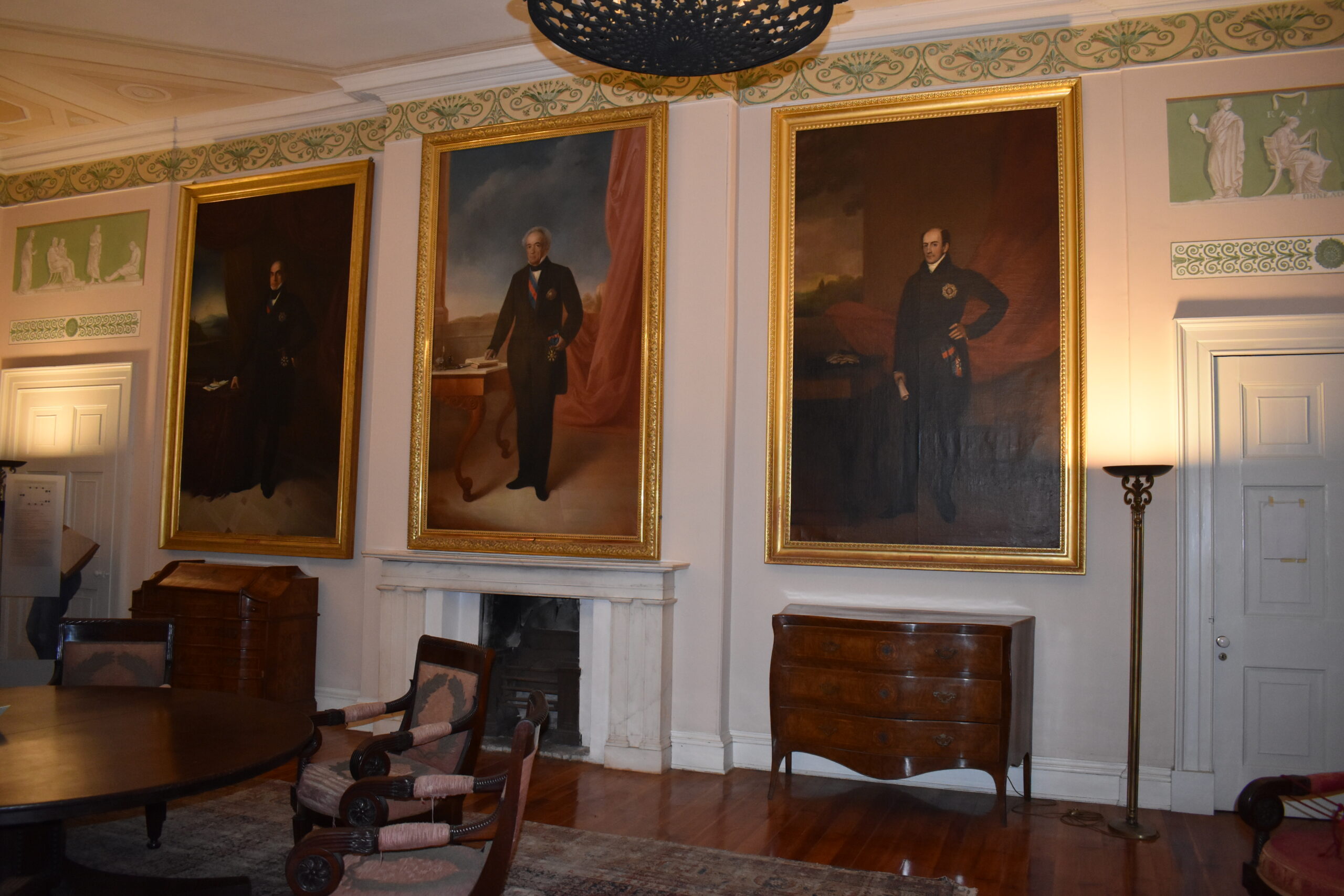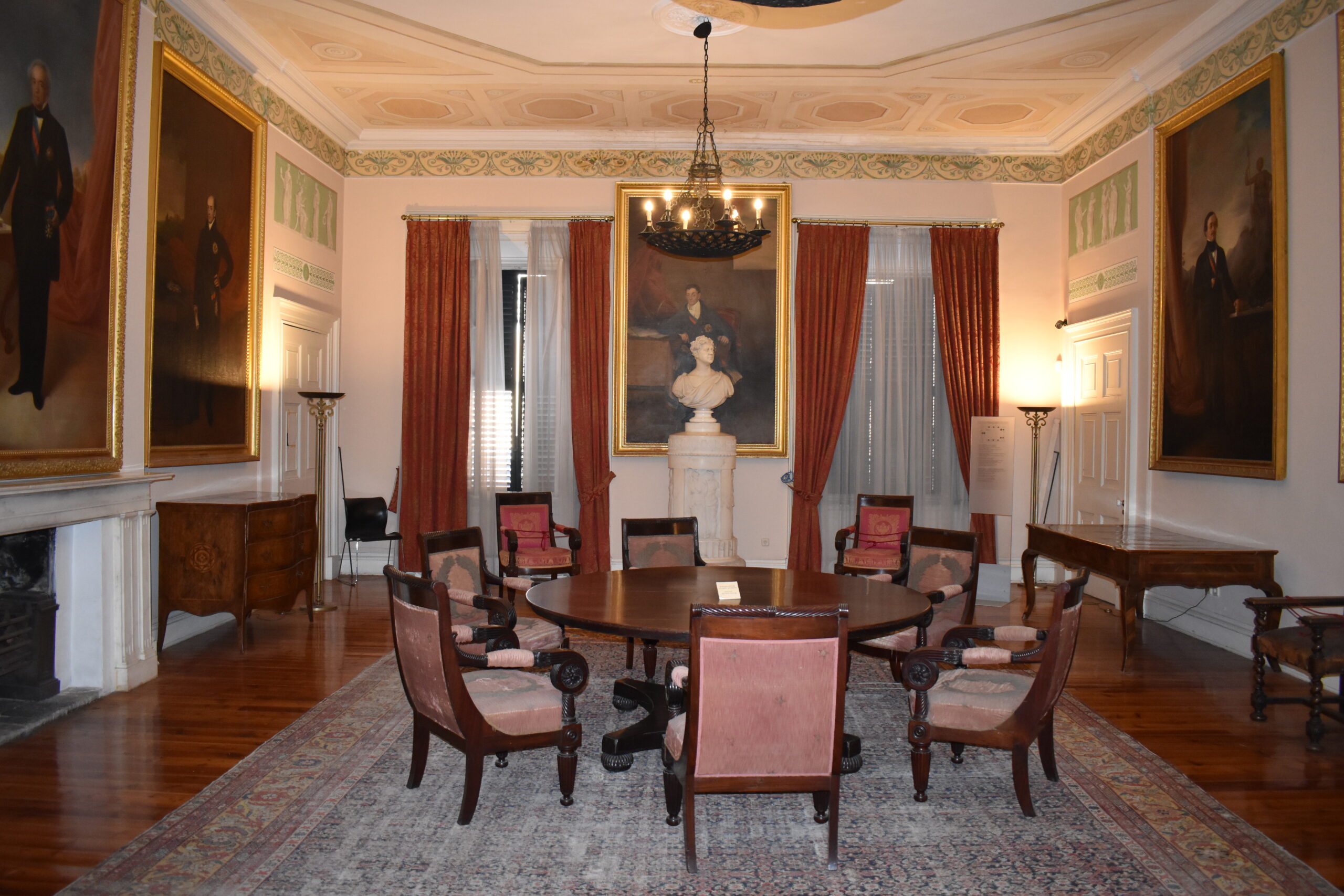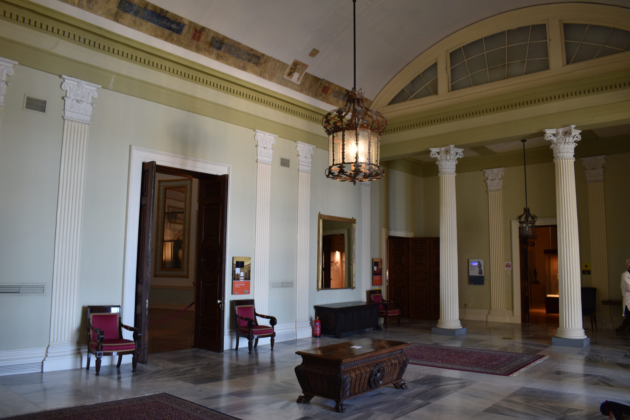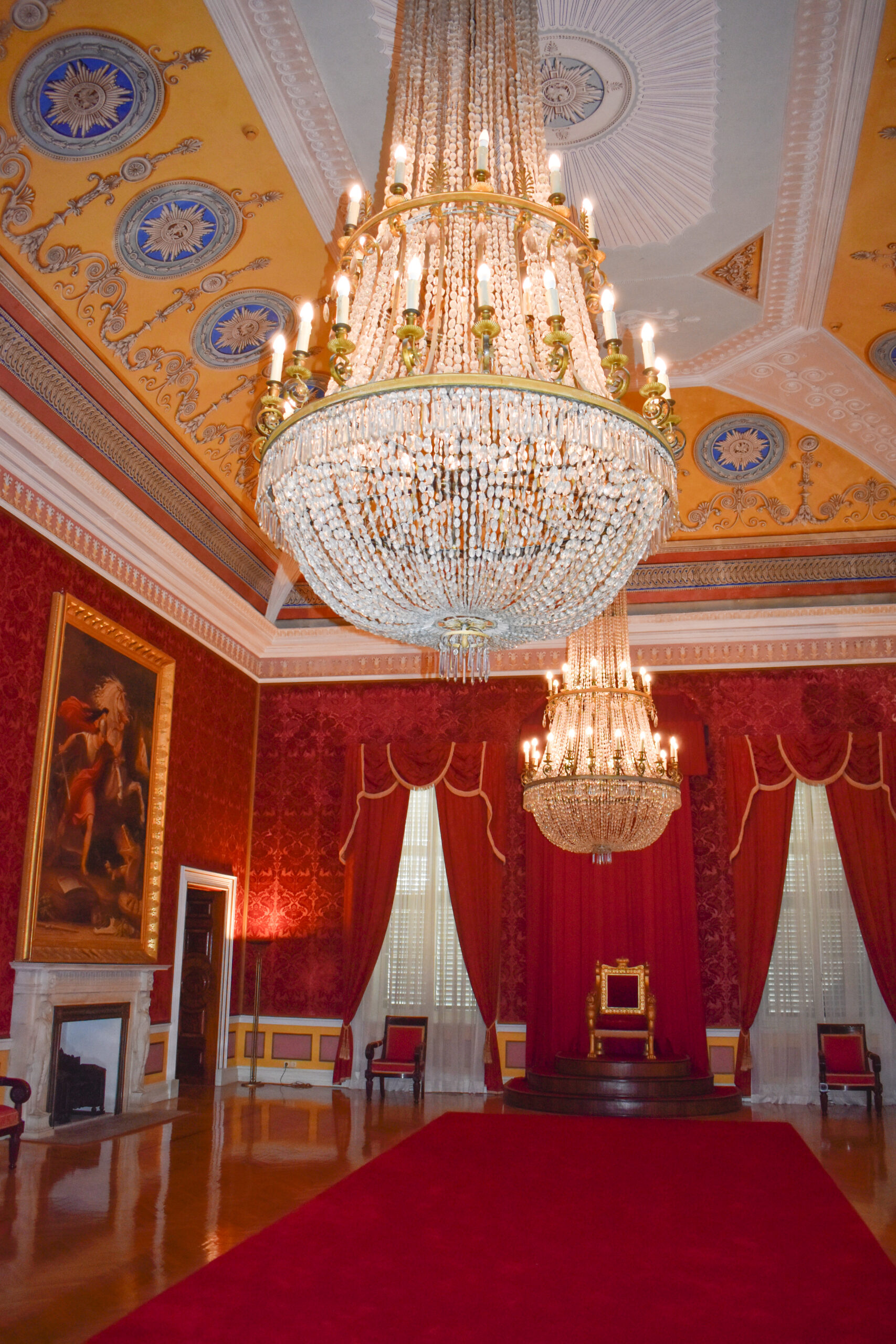 Αφήνοντας το ισόγειο, μια μνημειώδης σκάλα σας οδηγεί στον πρώτο όροφο, όπου το στυλ της διακόσμησης αλλάζει υιοθετώντας κολώνες Κορινθιακού ρυθμού. Βρίσκεστε στο πιο εντυπωσιακό τμήμα του ανακτόρου, εκεί όπου κάποτε οι τρεις επίσημες αίθουσες έσφυζαν από ζωή.