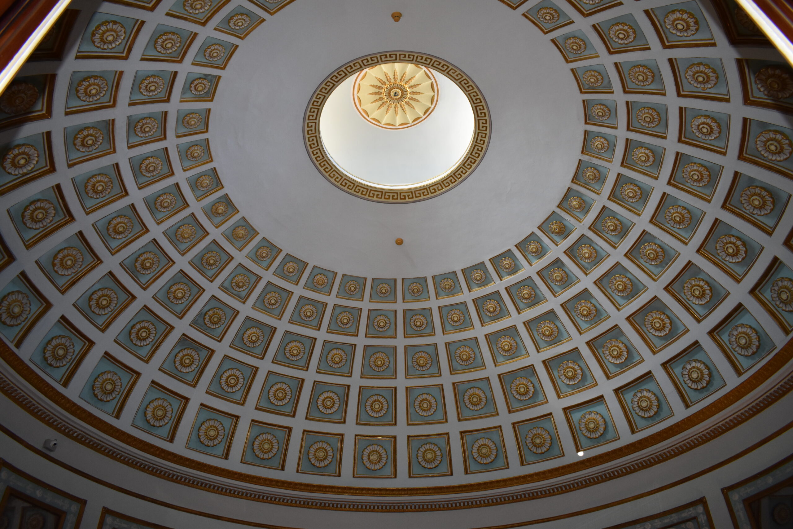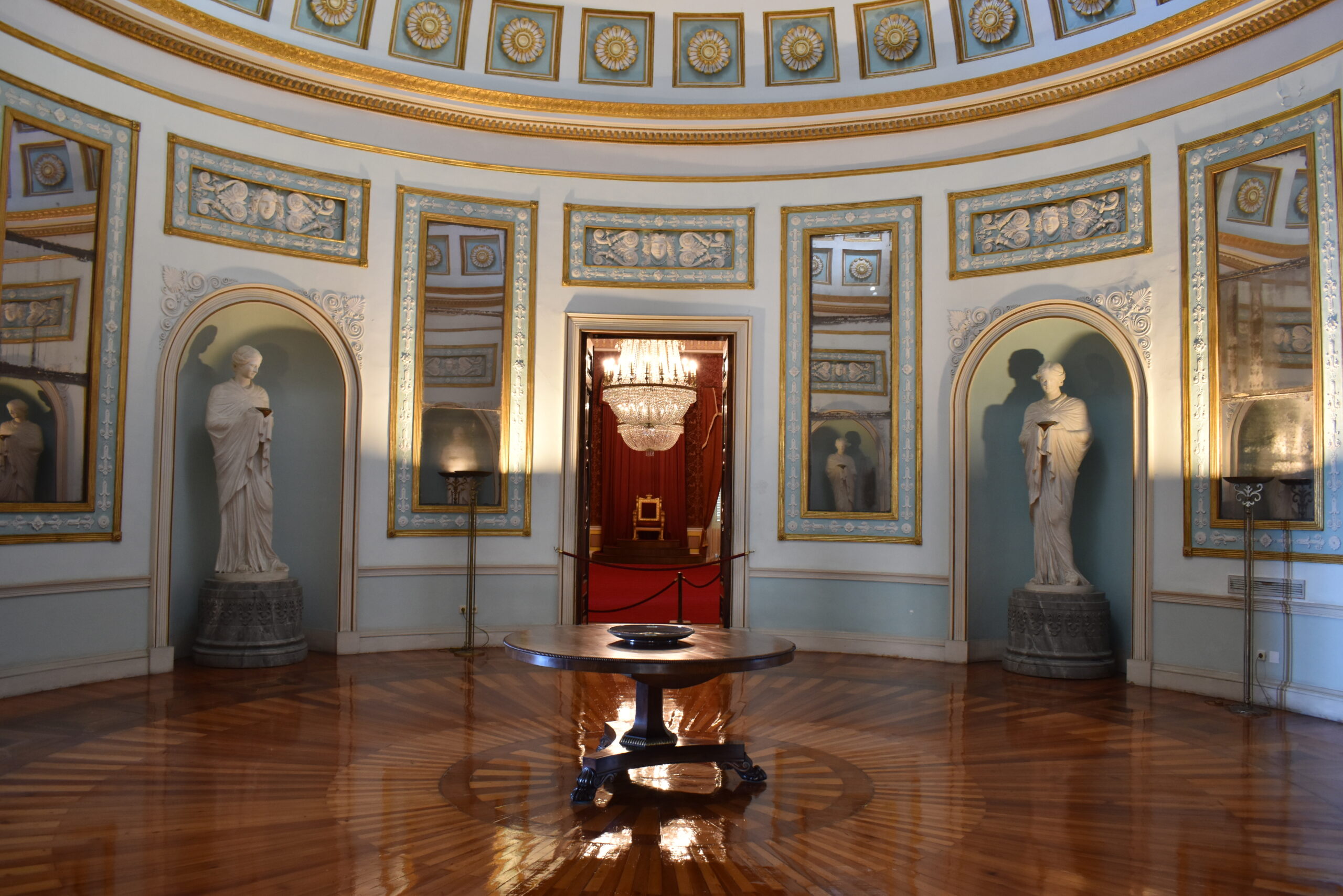 Κι ενώ η μία είναι πιο εντυπωσιακή από την άλλη, η κεντρική Αίθουσα χορού είναι ένας κομψός χώρος με απαλά γαλάζια χρώματα, διακοσμημένος με καθρέφτες κι εσοχές με αγάλματα, ενώ ο εντυπωσιακός θόλος της οροφής που μοιάζει με αυτόν του Ρωμαϊκού Πανθέου επιτρέπει στο λαμπερό κερκυραϊκό ήλιο να διαχέεται μέσα από το μοναδικό, στρογγυλό παράθυρο στο κέντρο του. Η αίθουσα χορού οδηγεί εκατέρωθεν στα δύο άλλα επίσημα δωμάτια, την Επίσημη τραπεζαρία και την Αίθουσα του θρόνου.