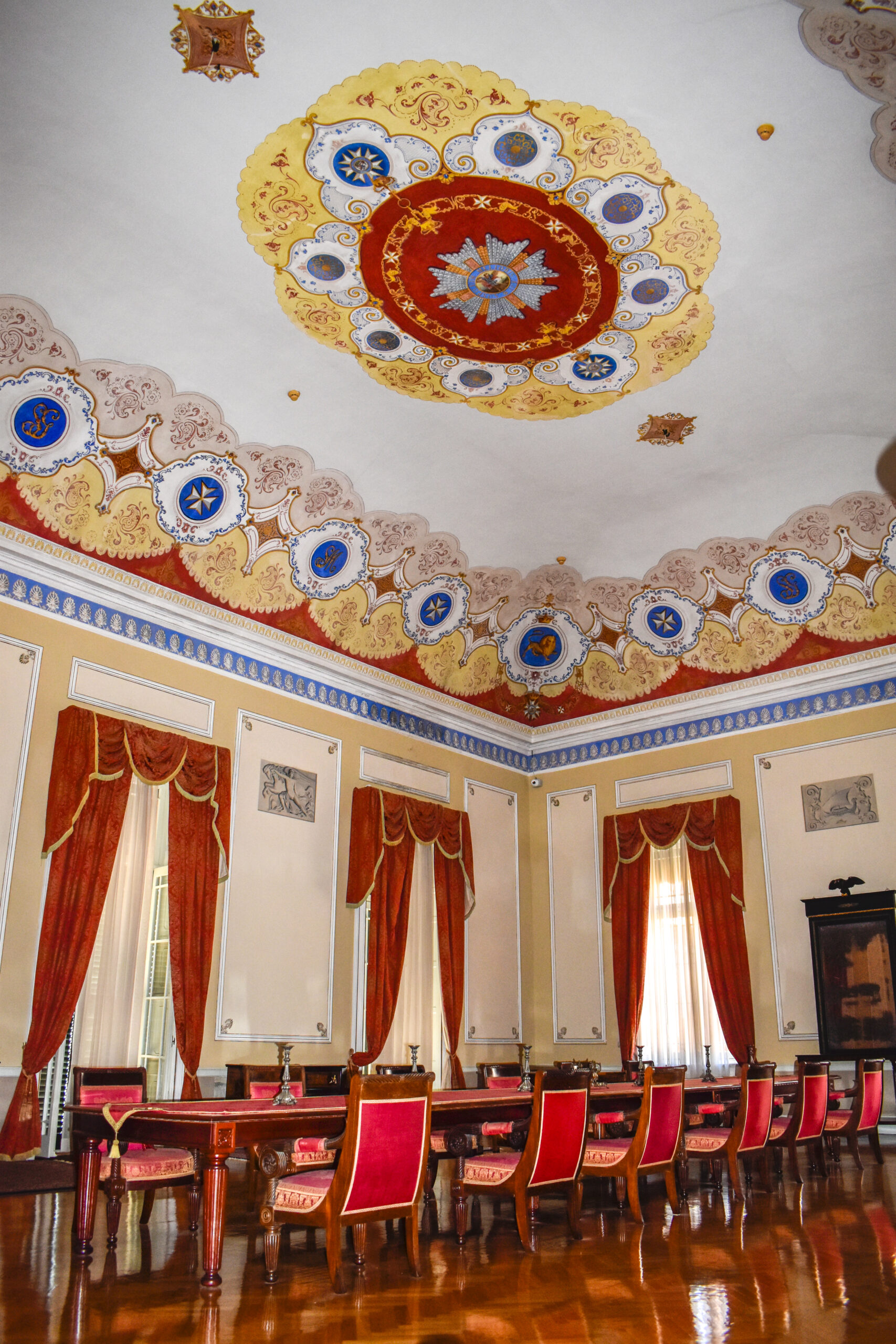 Η μεγαλειώδης αίσθηση συνεχίζεται καθώς προχωράτε στο εσωτερικό του διώροφου ανακτόρου και υπογραμμίζεται ιδιαίτερα από τη χρήση μαρμάρου και μπρούντζου. Η κεντρική αίθουσα περιβάλλεται από διπλή σειρά κιόνων Ιονικού ρυθμού και είναι διακοσμημένη με σκηνές από την Οδύσσεια. Στο ισόγειο σήμερα στεγάζονται οι περιοδικές εκθέσεις. Εάν κατά την επίσκεψή σας τύχει να εκτίθενται κειμήλια από την ιστορία του Τάγματος των Αγίων Μιχαήλ και Γεωργίου, θα έχετε την ευκαιρία να παρατηρήσετε και να θαυμάσετε αυθεντικά ενδύματα όπως ένα μεταξωτό μανδύα και μια ασημένια καρφίτσα του Ανώτατου Ιερέα του Τάγματος, εμβλήματα, μετάλλια και πίνακες, μαζί με λεπτομερείς πληροφορίες γύρω από την ιστορία και τη σημαντικότητα του Τάγματος.