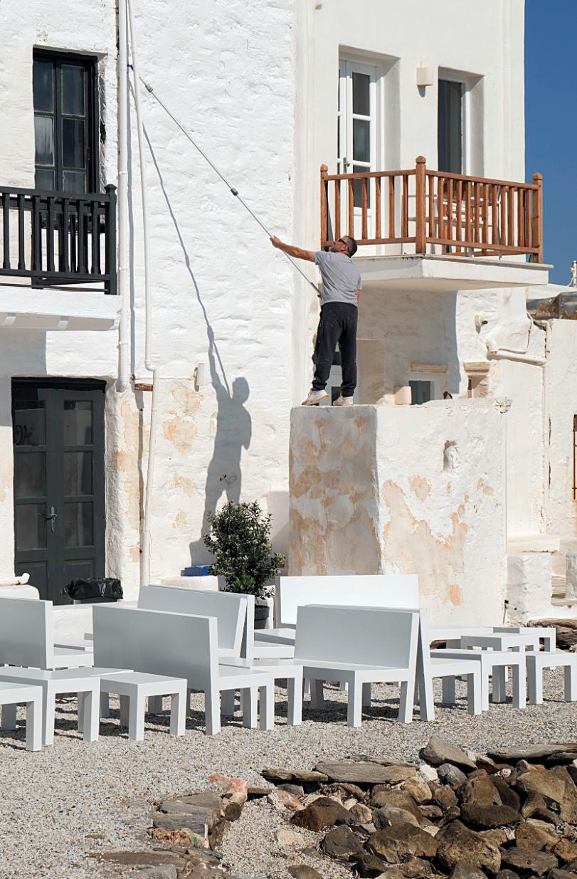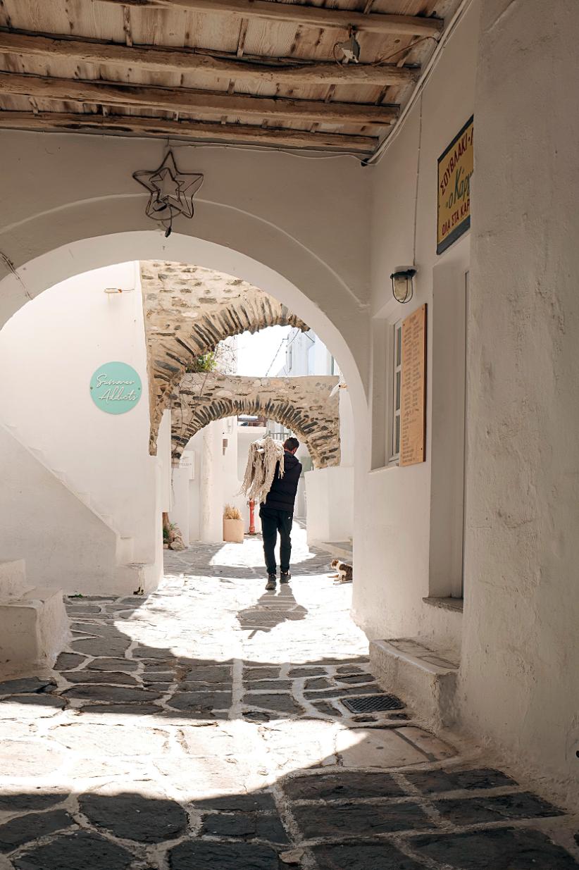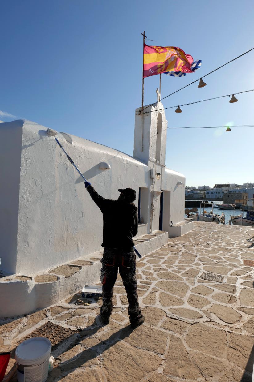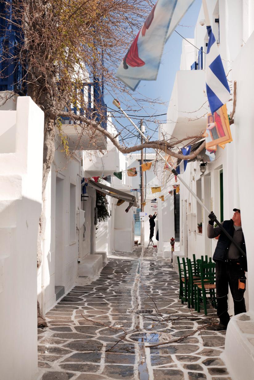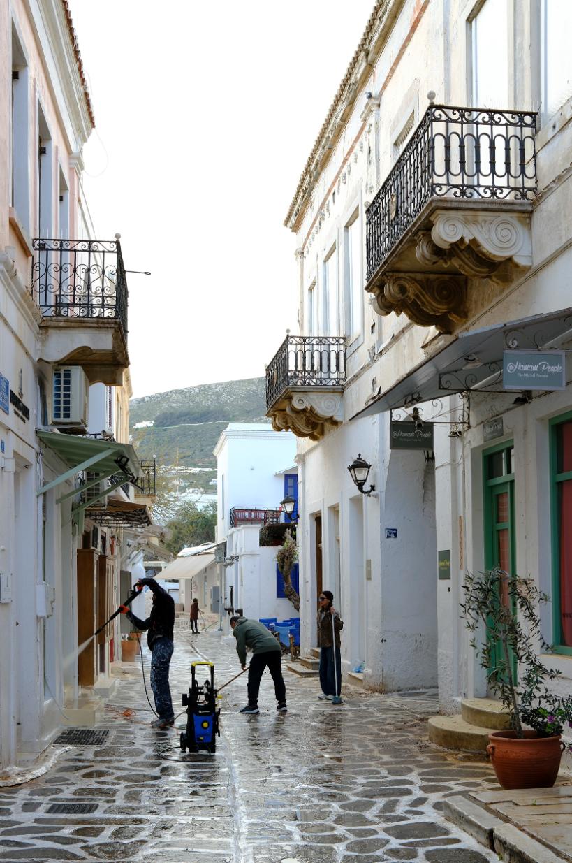 Στα δρομάκια της Παροικιάς, μέσα στην αντανάκλαση του ανοιξιάτικου φωτός, οι προετοιμασίες για την έναρξη της μεγάλης περιόδου της επισκεψιμότητας του νησιού, έχουν αρχίσει. Κάποια καταστήματα αναγεννιούνται μετά τη σύντομη περίοδο της χειμερινής ανάπαυσης. Οι δρόμοι καθαρίζονται με πιεστικά μηχανήματα, κάποια κτίσματα δέχονται πινελιές καλλωπισμού στο εξωτερικό τους.