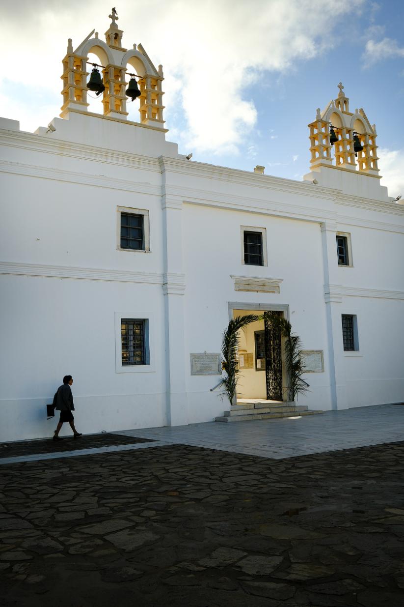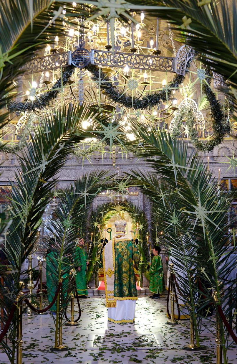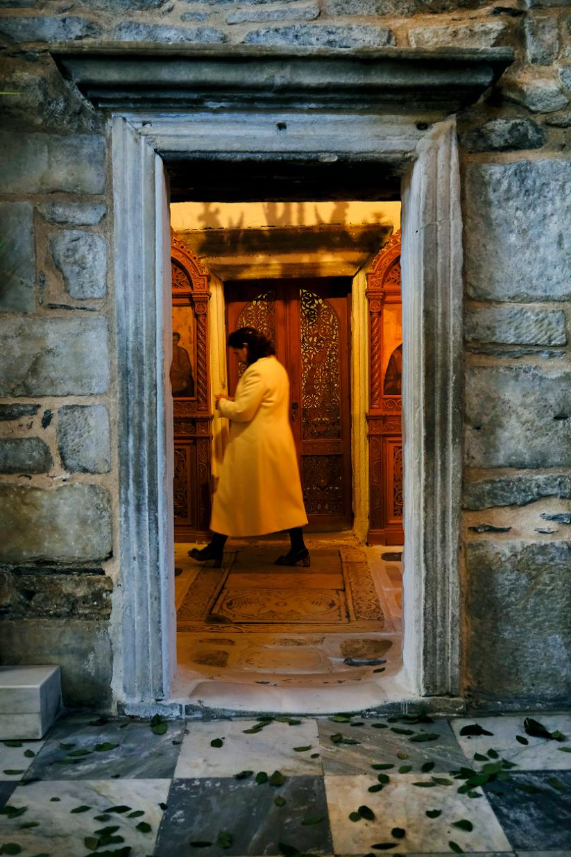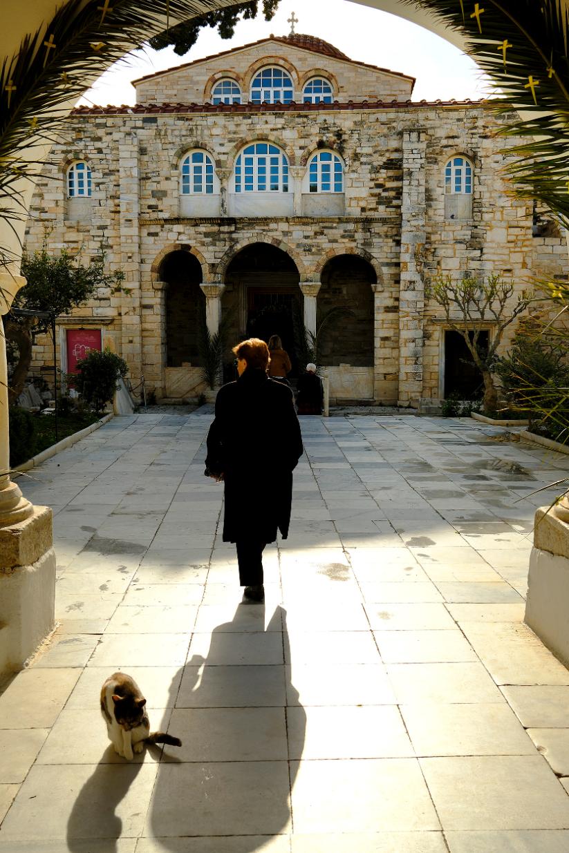 Οι πιστοί γεμίζουν σιγά-σιγά το εσωτερικό του ναού της Παναγίας Εκατονταπυλιανής όπου τελείται ήδη η λειτουργία. Κυριακή των Βαΐων και ο στολισμός είναι απόλυτα ταιριαστός. Τίποτα δεν ακούγεται πέρα από τις ύμνους των ψαλτών. Η επιβλητικότητα του εσωτερικού του ναού, πολλαπλασιάζεται αυτές τις στιγμές, δίνει ουσία στην ημέρα.