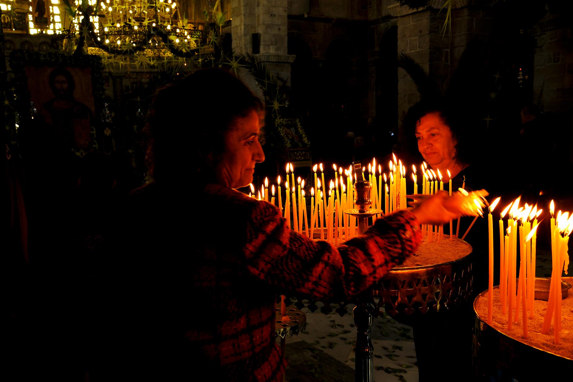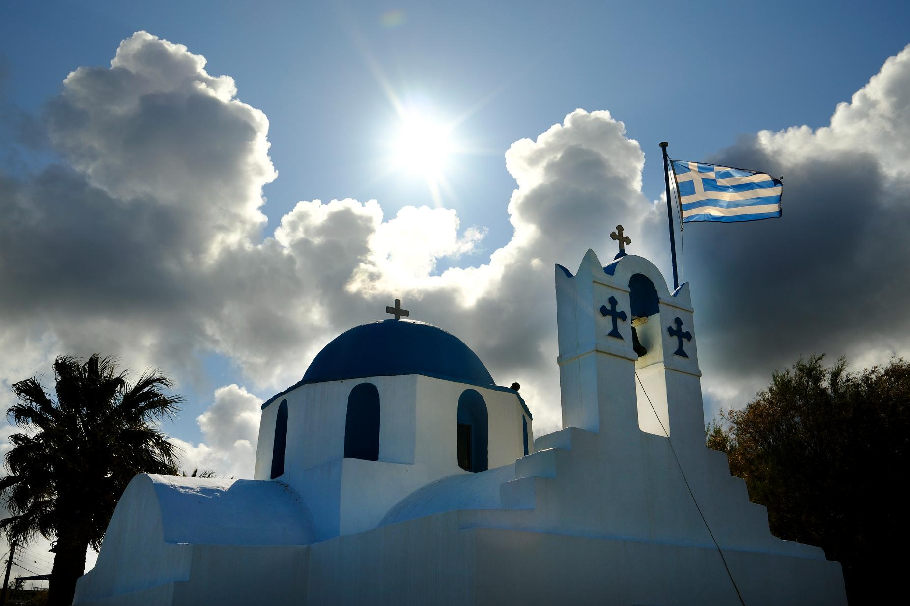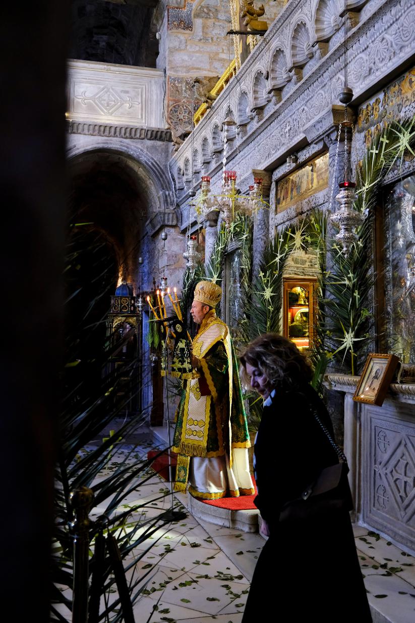 Οι πιστοί γεμίζουν σιγά-σιγά το εσωτερικό του ναού της Παναγίας Εκατονταπυλιανής όπου τελείται ήδη η λειτουργία. Κυριακή των Βαΐων και ο στολισμός είναι απόλυτα ταιριαστός. Τίποτα δεν ακούγεται πέρα από τις ύμνους των ψαλτών. Η επιβλητικότητα του εσωτερικού του ναού, πολλαπλασιάζεται αυτές τις στιγμές, δίνει ουσία στην ημέρα.