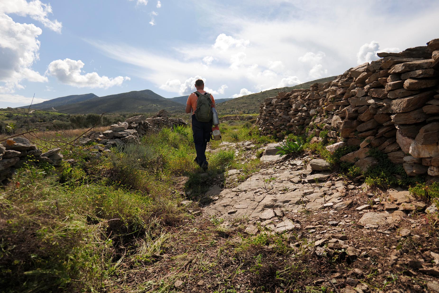Η μέρα προχωρά γοργά. Συνοδεύω για λίγη ώρα τον Γιώργο Ανουσάκη στο μονοπάτι του Αγίου Βασιλείου, στην ευρύτερη περιοχή του Τούρλου, καθώς έχει αναλάβει να καθαρίσει εθελοντικά τη διαδρομή από άγριες βατσινιές οι οποίες θέριεψαν μέσα στον πλούσιο σε βροχές χειμώνα. Το μονοπάτι αυτό είναι μόνο ένα μικρό μέρος από το “First Byzantine Road Trail Running”, έναν αγώνα δρόμου 10,5 χιλιομέτρων, ο οποίος διοργανώνεται για πρώτη φορά φέτος στις 19 Απριλίου.