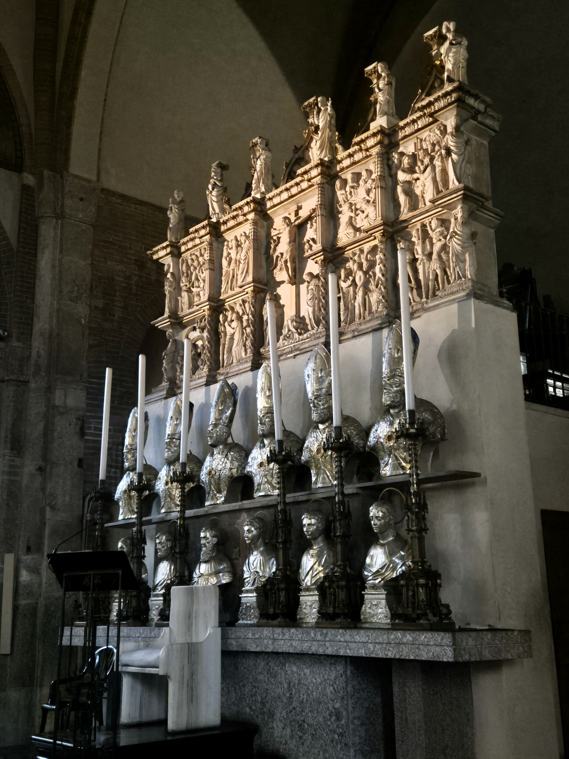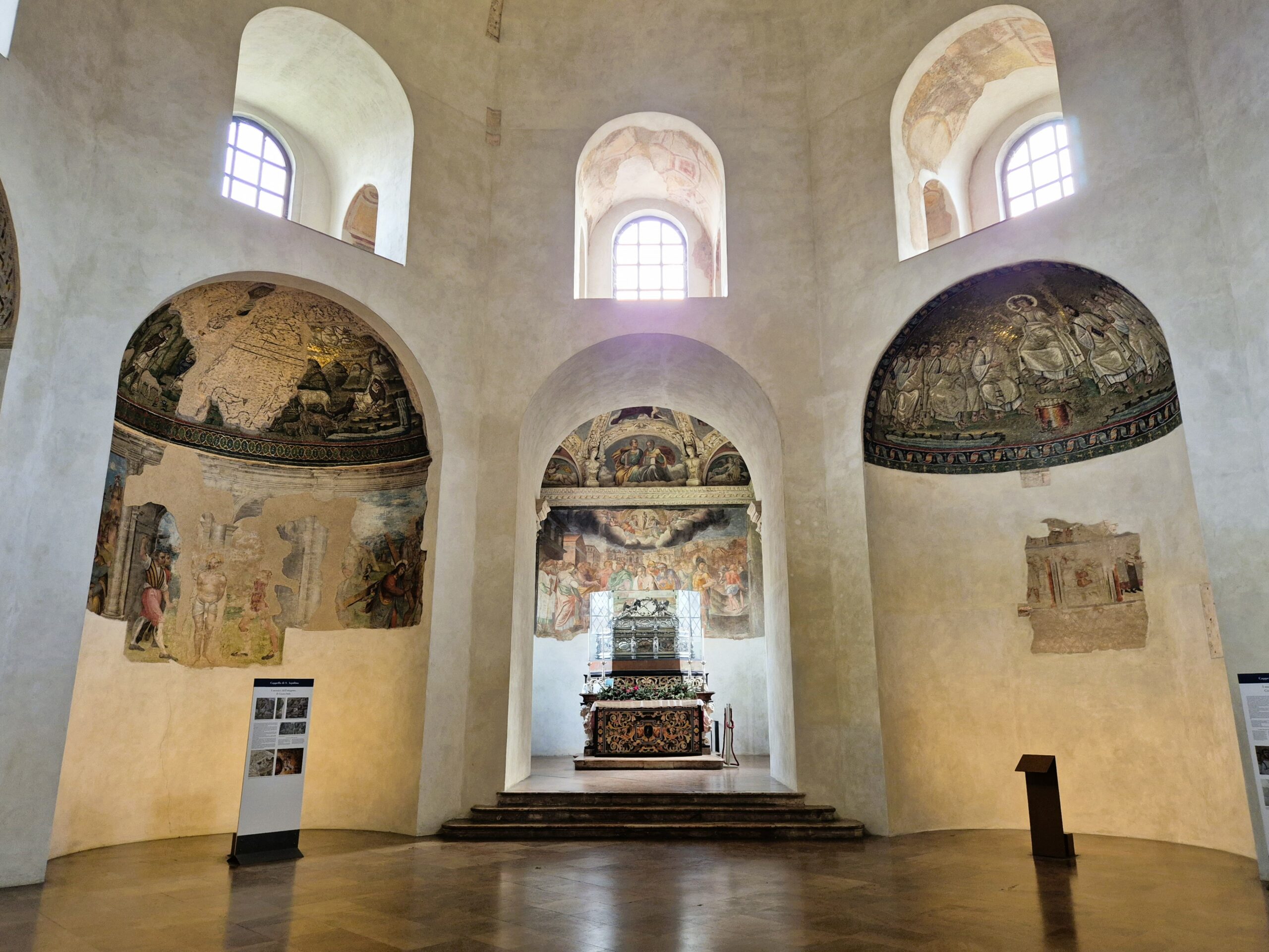 Κορυφαίο όλων, αυτό του Αγίου Ακυλίνου -Cappella di Sant’Aquilino- στα δεξιά της εισόδου, γνωστό και ως «Παρεκκλήσι της Βασίλισσας» προς τιμήν της Galla Placidia η οποία έπαιξε σημαντικό ρόλο στην ολοκλήρωση του έργου, εντυπωσιάζει με τα ρωμαϊκά μωσαϊκά του 4ου αι. που απεικονίζουν το Χριστό ανάμεσα στους Αποστόλους και μια ακόμη παλαιότερη σαρκοφάγο. Ένα επίπεδο κάτω από τον διακοσμημένο επίσης με μωσαϊκά όσο και με μάρμαρα ναό, εκτίθεται μέρος των δομικών υλικών που χρησιμοποιήθηκαν στην ανέγερσή του και πιθανότατα προέρχονται από ρωμαϊκό αμφιθέατρο της περιοχής. Το άγαλμα στην πλατεία μπροστά από την εκκλησία αποτελεί αντίγραφο αρχαίου και ανήκει στον αυτοκράτορα Κωνσταντίνο, τον πρώτο που ασπάστηκε το χριστιανισμό.