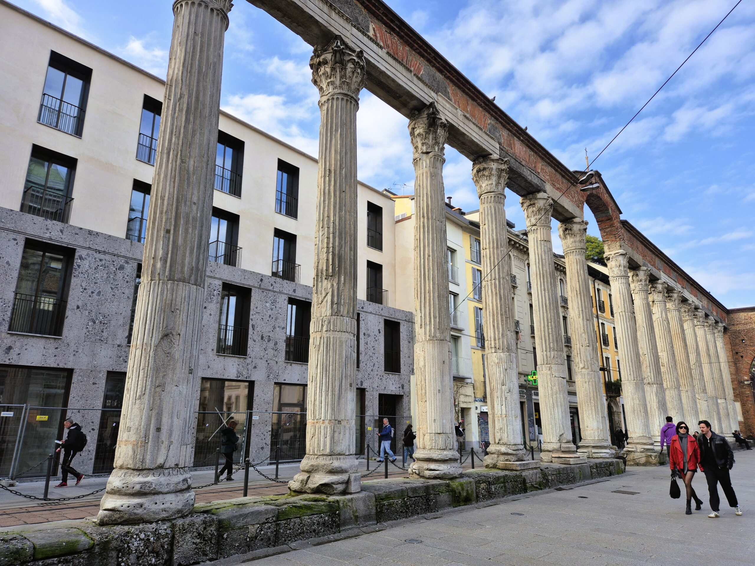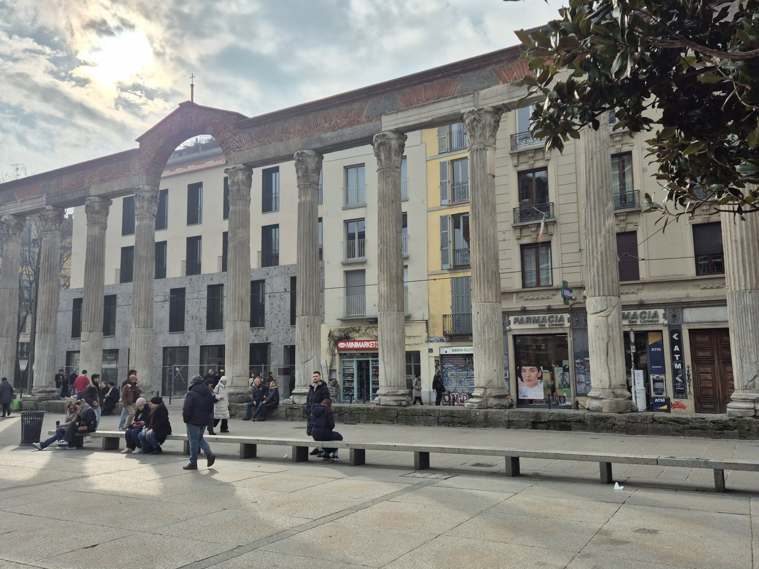 Ένα απροσδόκητο θέαμα που προκαλεί δέος, οι Στήλες του Αγίου Λαυρεντίου, είναι το ιδανικό προοίμιο για να μπούμε στο πνεύμα της περιοχής, καθώς από τη μια συνιστούν ένα μνημείο άκρως υποβλητικό που δίνει την αίσθηση ότι ο χρόνος έχει σταματήσει, από την άλλη όμως το ιστορικό μεγαλείο τους συνυπάρχει φυσικά με την καθημερινότητα. Οι 16 συνεχόμενες κολώνες κορινθιακού ρυθμού που μας υποδέχονται στην περιοχή Ticinese, ανάγονται στη ρωμαϊκή εποχή οπότε και αποτελούσαν μέρος ενός ναού του 2ου–3ου αιώνα μ.Χ., ενώ τοποθετήθηκαν μπροστά από τη βασιλική του Αγίου Λαυρεντίου ήδη από τον 4ο αι., σχηματίζοντας έναν προθάλαμο που δεν υπάρχει πια. Την ημέρα αποκαλύπτουν το αρχαίο τους βάρος, το σούρουπο όμως η κιονοστοιχία μεταμορφώνεται σε ζωντανό σημείο συνάντησης, όπου φοιτητές, ντόπιοι και ταξιδιώτες κάθονται στη βάση της, κάνοντας σχέδια για το βράδυ και παρατηρώντας την πόλη να κινείται γύρω τους.
