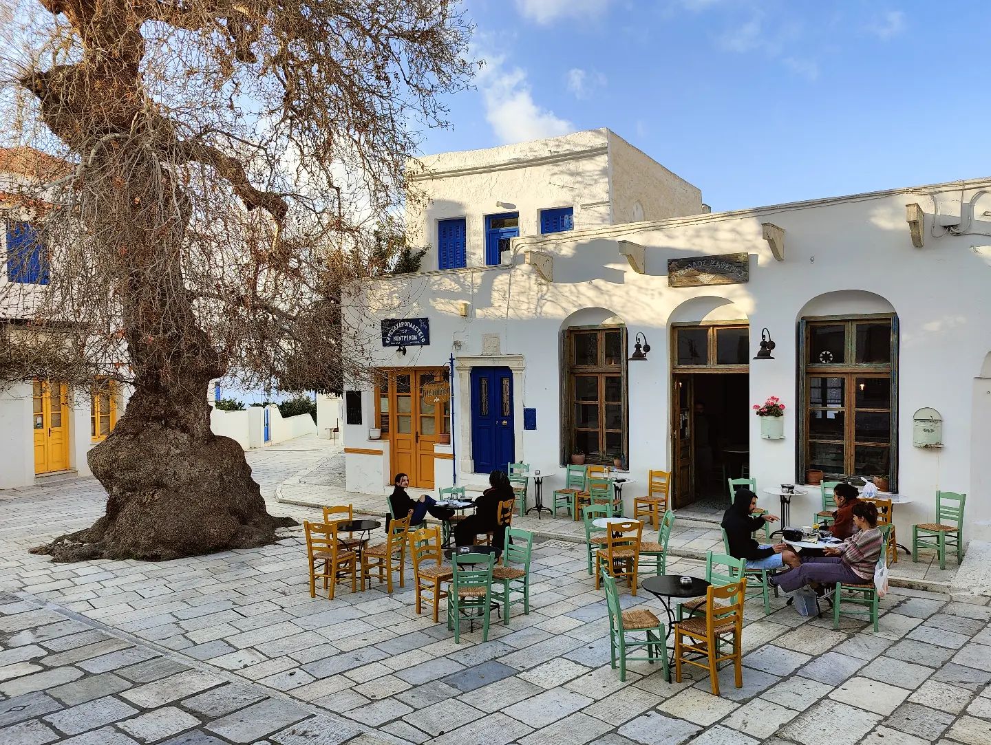Ο επισκέπτης απολαμβάνει εκεί, παραδοσιακά, ελληνικό καφέ στο μπρίκι, γλυκό του κουταλιού, υποβρύχιο ή ντόπιο τσίπουρο με γλυκάνισο, συνοδεία απλών, αυθεντικών μεζέδων. Τις ηλιόλουστες μέρες, τα λιγοστά τραπεζάκια στο καλντερίμι προσφέρουν μια εμπειρία που καταργεί τον χρόνο, αρκεί να βρεθεί ελεύθερο τραπέζι.