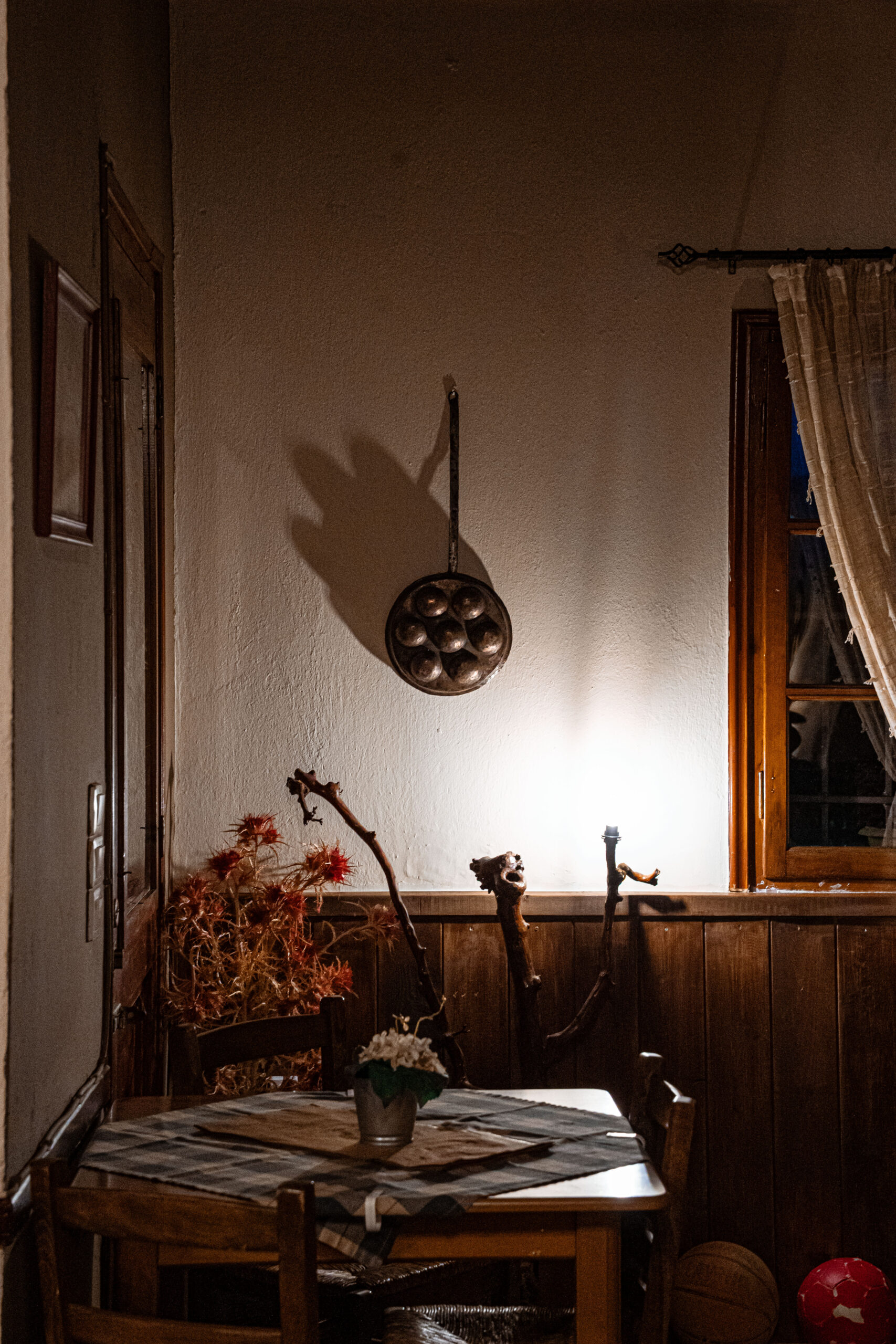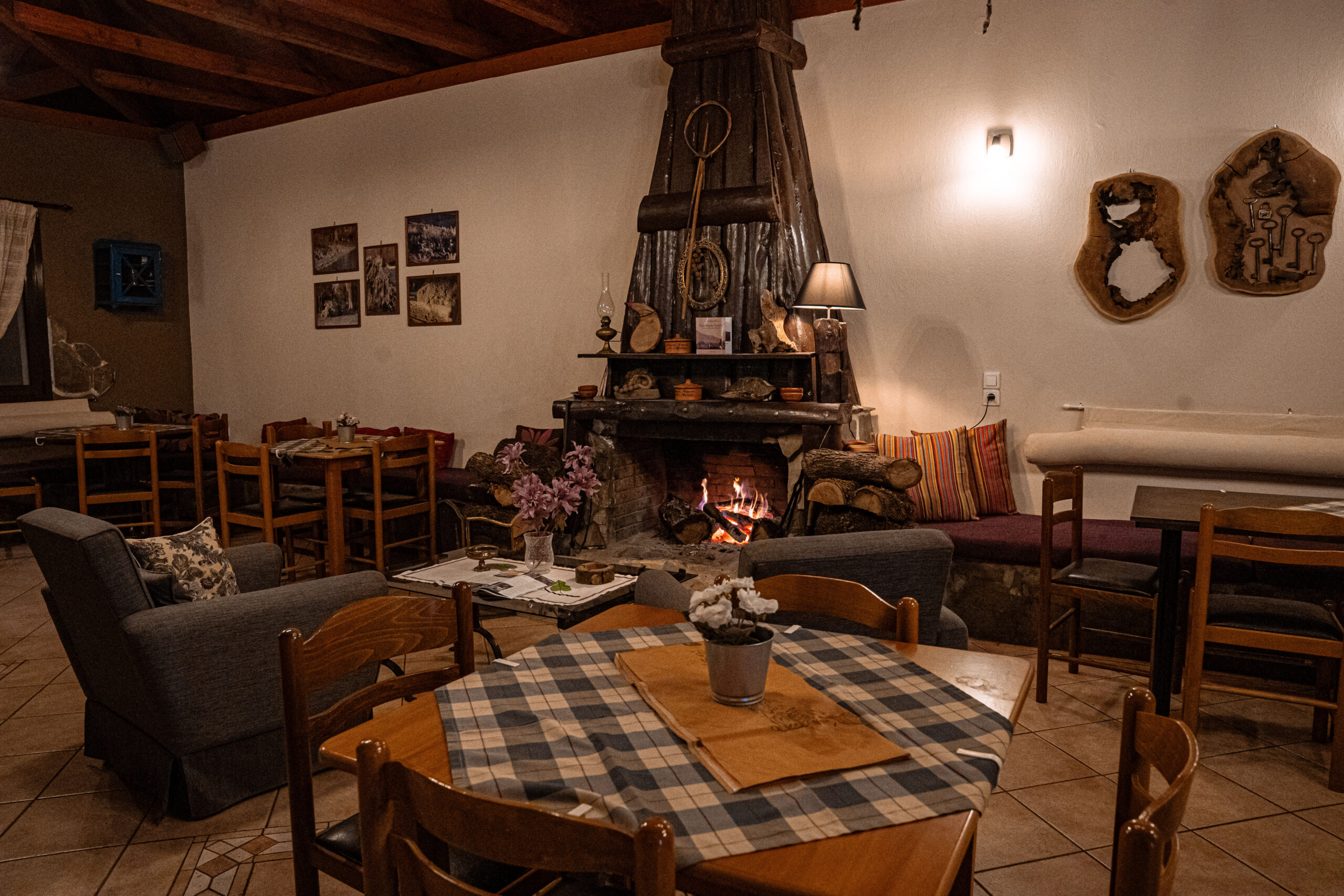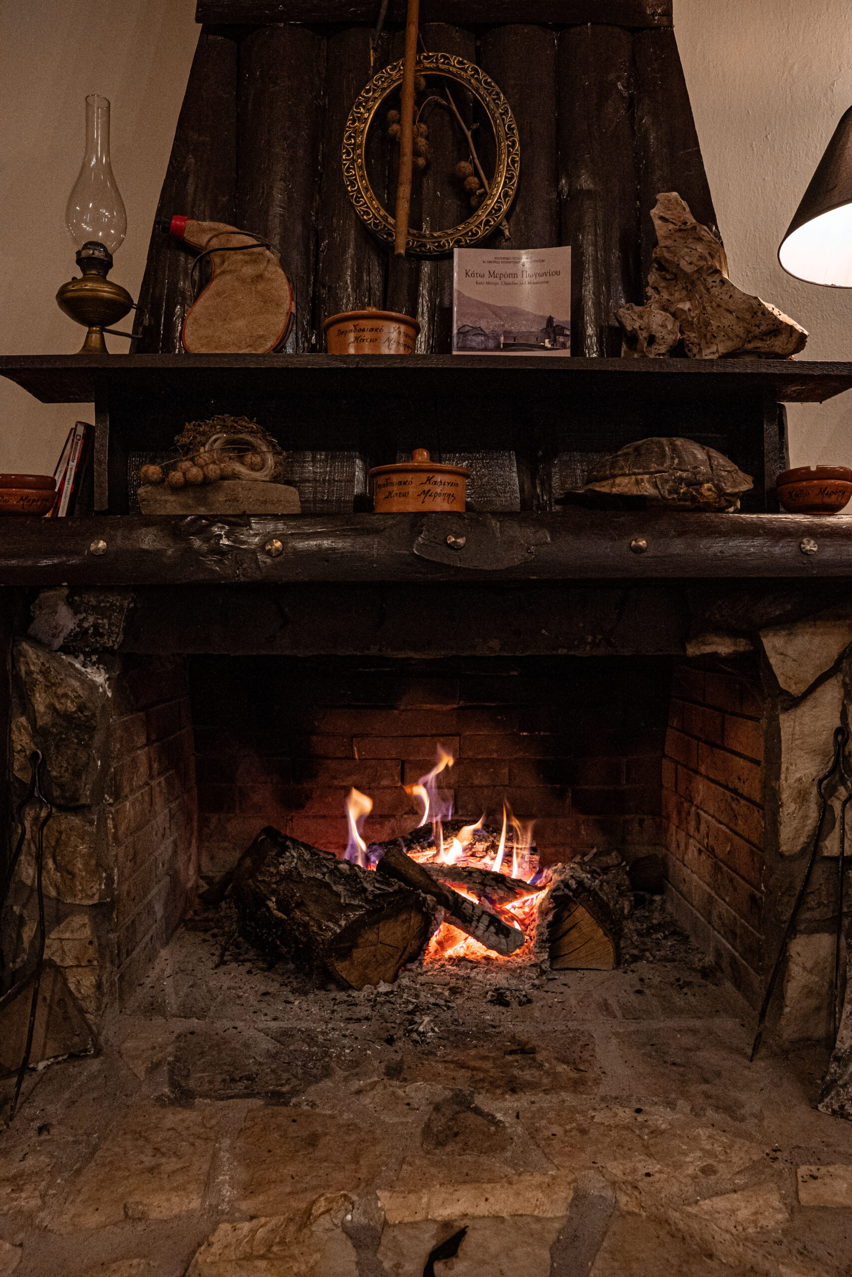 Καθίσαμε στο σαλονάκι, μπροστά στο τζάκι. Η φωτιά έκαιγε με εκείνον τον γνώριμο ήχο που σε τραβά έξω από τον χρόνο. Στους τοίχους, παλιές εικόνες, πρόσωπα και στιγμές από ζωές που κάποτε γέμιζαν το χωριό. Σε προθήκες, αντικείμενα παλιά, γεμάτα μνήμες.