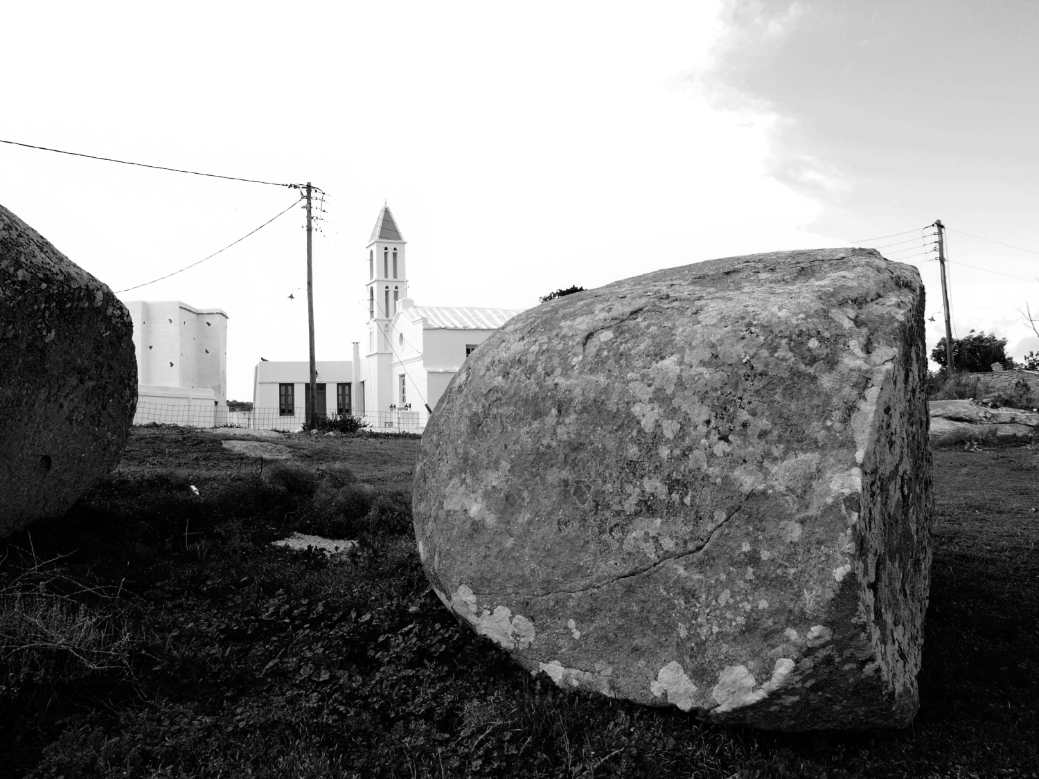 Σε όλο το οδοιπορικό μας στα εσωτερικά τοπία της Τήνου μας συντροφεύουν τα χαρακτηριστικά τοπόσημα των γρανιτένιων ογκόλιθων. Στέκονται ασάλευτα, αλλά η εικόνα τους μοιάζει να κινείται όταν προβάλλεται επάνω τους το σμήνος των περιστεριών, λες και δανείζονται κάτι από το τρελαμένο πέταγμά τους.