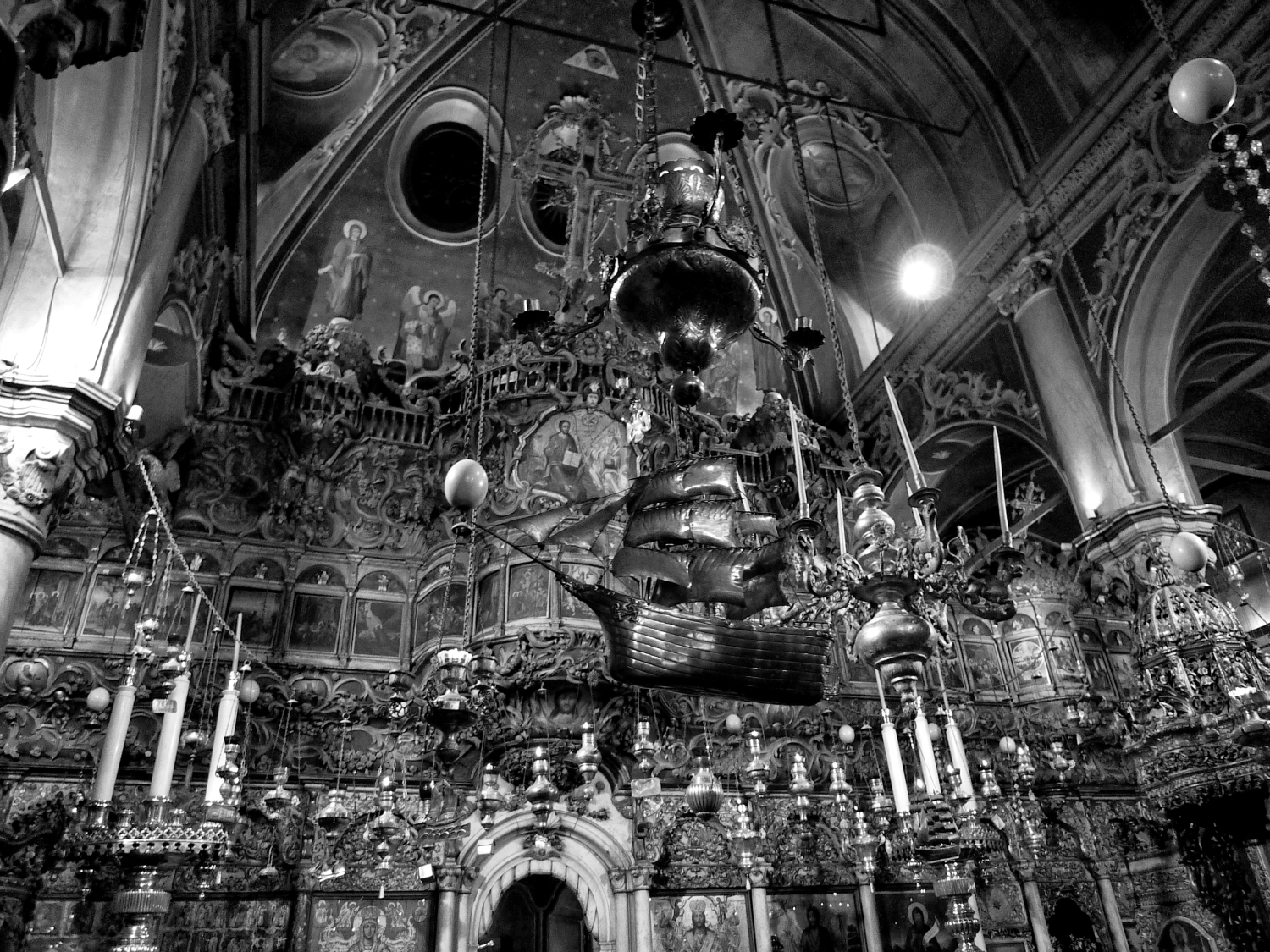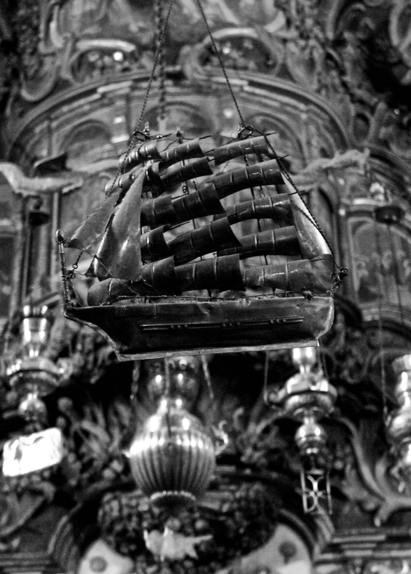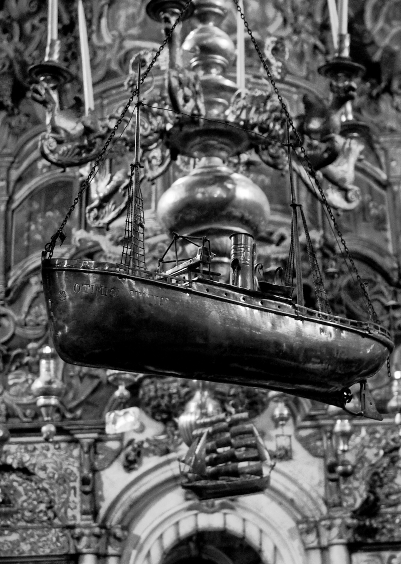 Τώρα είναι η καλή ώρα του ευοίωνου πλου για να ταξιδέψουν τα ασημένια καράβια-αφιερώματα της Μεγαλόχαρης. Μοιάζουν να σηκώνουν άγκυρα και να ίπτανται, λες, στο κατάφορτο με αναθήματα στερέωμα της περικαλλούς εκκλησιάς, μέσα στη γαλήνη και την κατάνυξη του εσπερινού των Εισοδίων της Θεοτόκου. Κι εσύ, μέλος του στενού κύκλου των αυτοχθόνων, μπορείς να απορροφηθείς από την ίδια τη λαμπρότητα του ναού και το μυσταγωγικό ταξίδι που σε πάει, και όχι να εντυπωσιαστείς από το υπερφίαλο πλήθος των προσκυνητών άλλων εποχών.