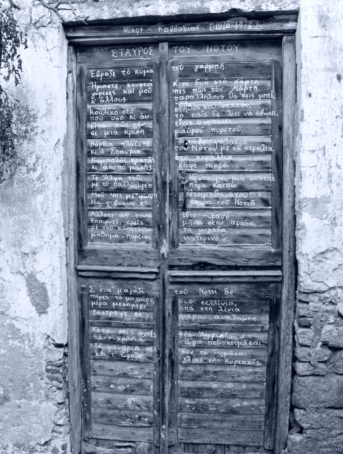 Και ως εκ θαύματος, οι κλειστές θύρες που φαντάζουν εγκαταλειμμένες και ετοιμόρροπες ζουν μια δεύτερη, γοητευτική ζωή. Επάνω τους φέρουν χαραγμένα με ωραία γράμματα ποιήματα του Καβάφη, του Σικελιανού, του Σεφέρη, του Ελύτη, του Βρεττάκου, του Καββαδία, του Σαραντάρη, του Βάρναλη: