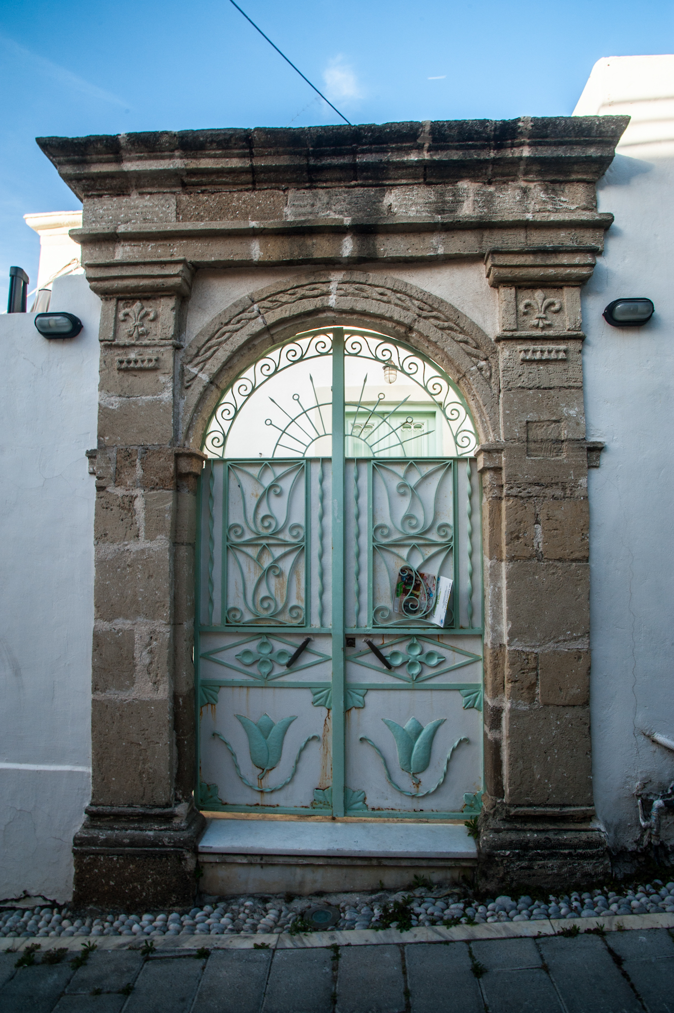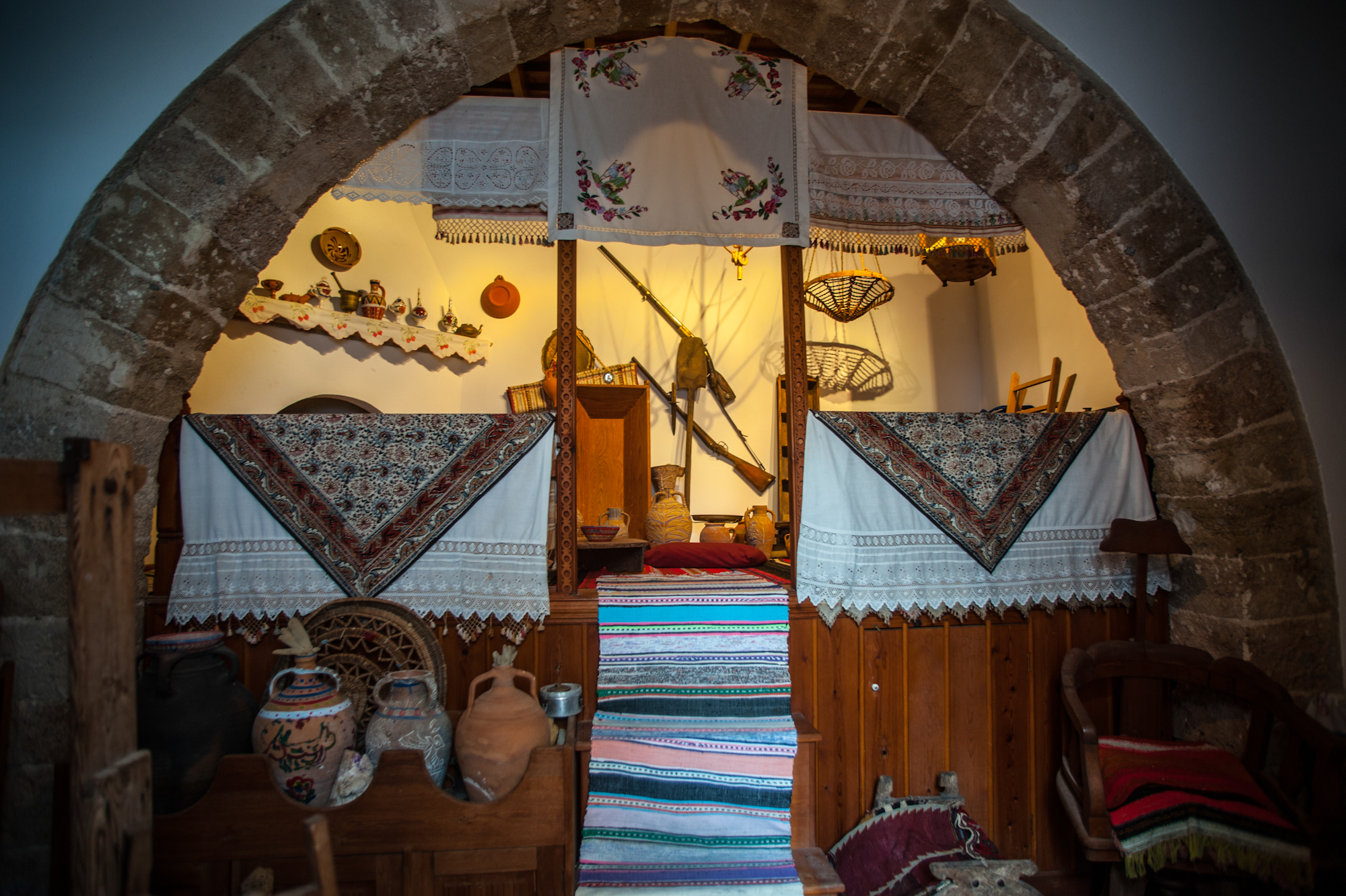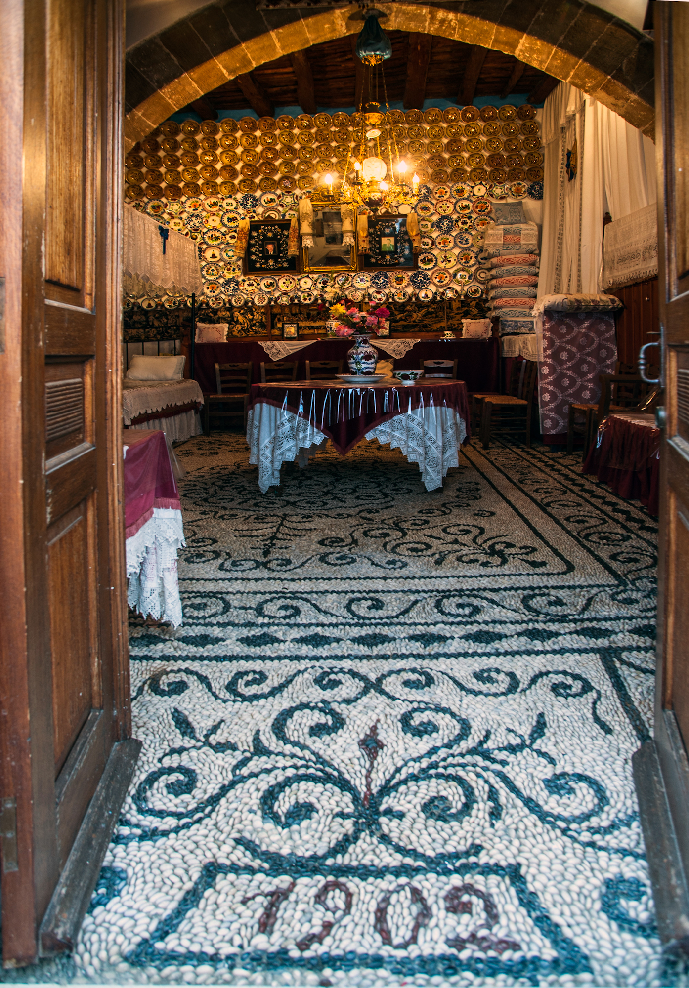 Στην είσοδο αναγράφεται στο πάτωμα η ημερομηνία κτήσης του το 1902, στο χαρακτηριστικό ψηφιδωτό από άσπρα και μαύρα βότσαλα. Η τεχνοτροπία αυτή που είναι γνωστή ως χοχλάκια, στρογγυλά πετραδάκια δηλαδή, στολίζει τα σπίτια, τις αυλές και τις πλατείες σε όλη τη Ρόδο και οι τεχνίτες από τα Απόλλωνα ήταν από τους πλέον περιζήτητους. Στη μέση του μεγάλου ενιαίου ψηλοτάβανου δωματίου δεσπόζει η χαρακτηριστική θολωτή καμάρα που εκτός από ομορφιά, προσέδιδε όπως είπαμε μοναδική ασφάλεια στο κτίσμα. Αυτό όμως που μαγνητίζει το βλέμμα στη λεγόμενη «Μέσα Χώρα», το τμήμα δηλαδή από την καμάρα και προς τα μέσα, είναι ο τοίχος που φαίνεται ακριβώς απέναντι από την είσοδο.