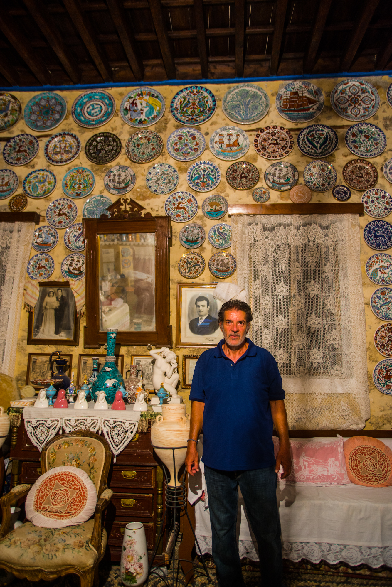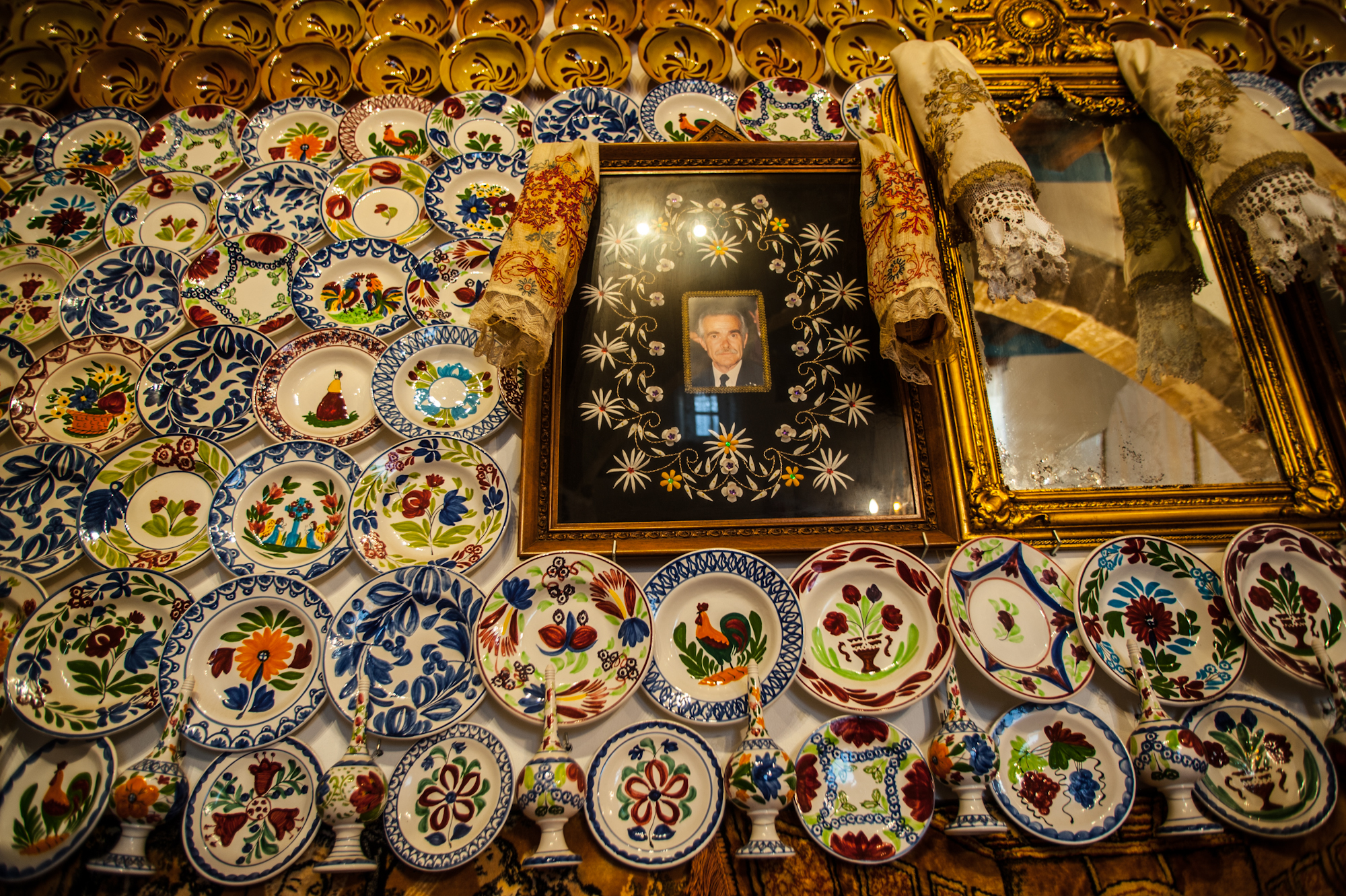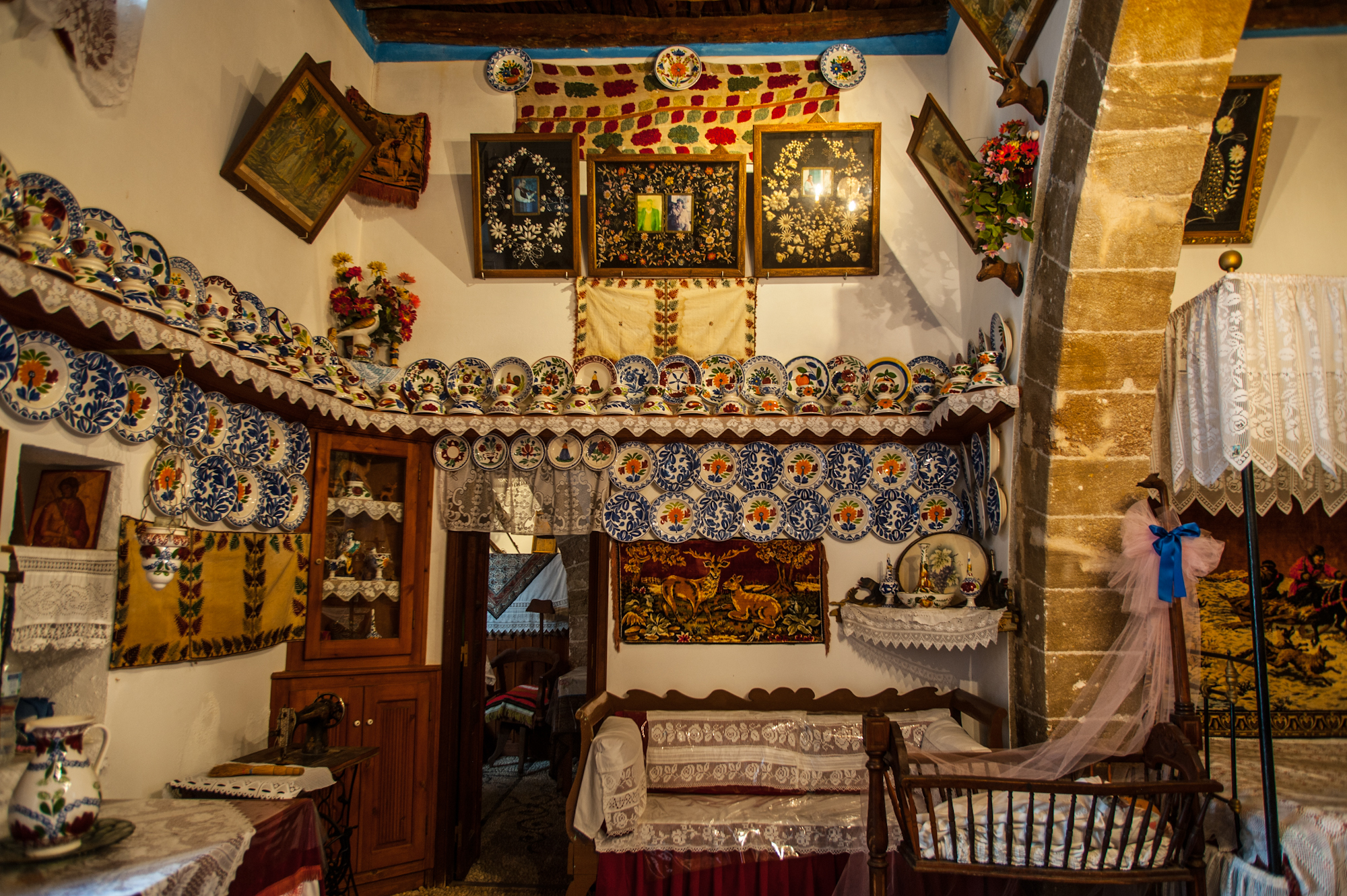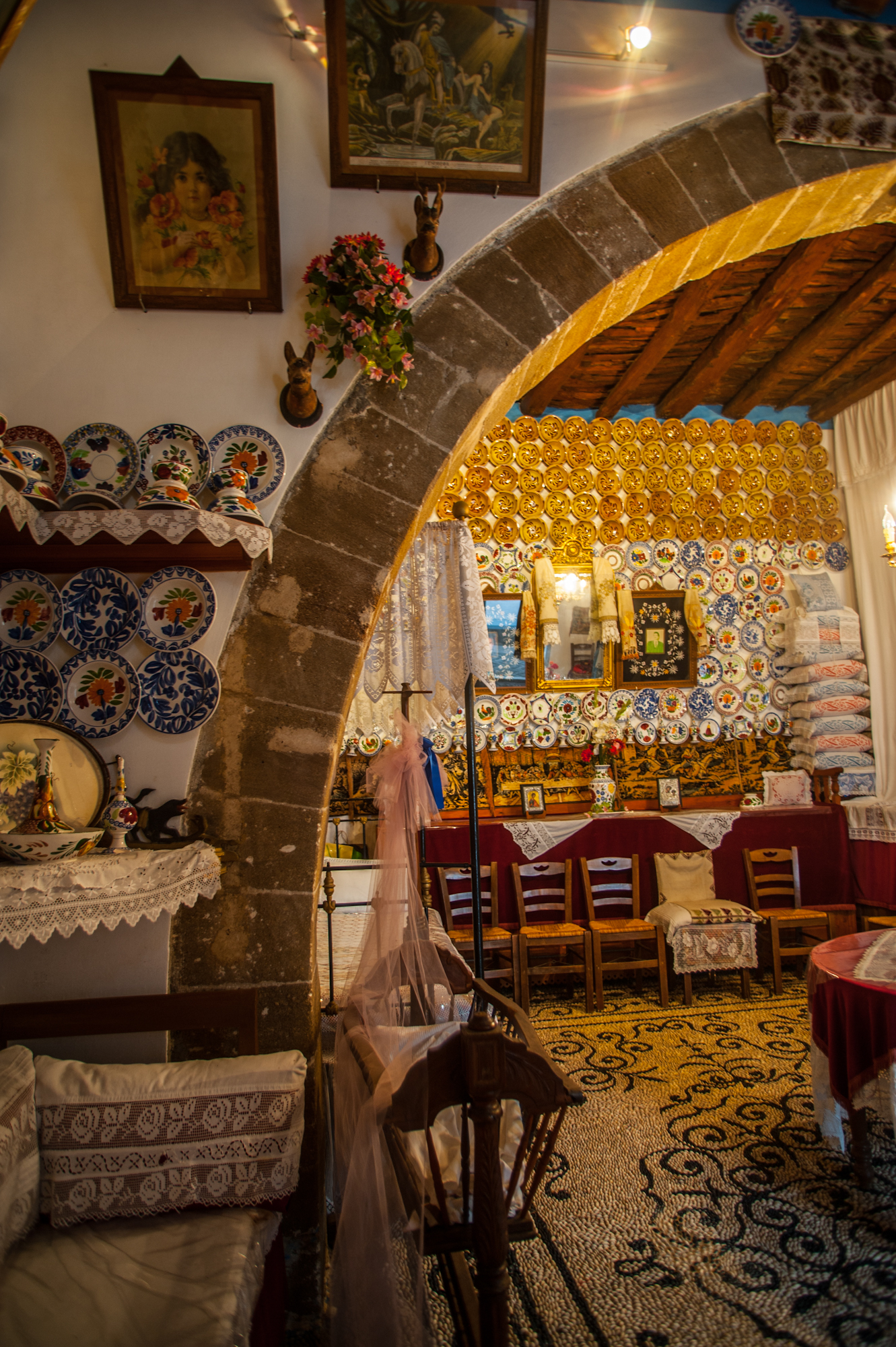Η περίφημη «Στολισιά». Τα πολυάριθμα κρεμασμένα στον τοίχο πήλινα πιάτα που αναπαριστούν κυρίως εικόνες από τη φύση αλλά και την ιστορία του νησιού, ήταν δείγμα της θέσης στην ιεραρχία της τοπικής κοινωνίας. Χαρακτηριστικές είναι επίσης οι φωτογραφίες της οικογένειας, που τοποθετούνταν μέσα σε μεγάλα κάδρα με μεταξωτά κεντήματα.