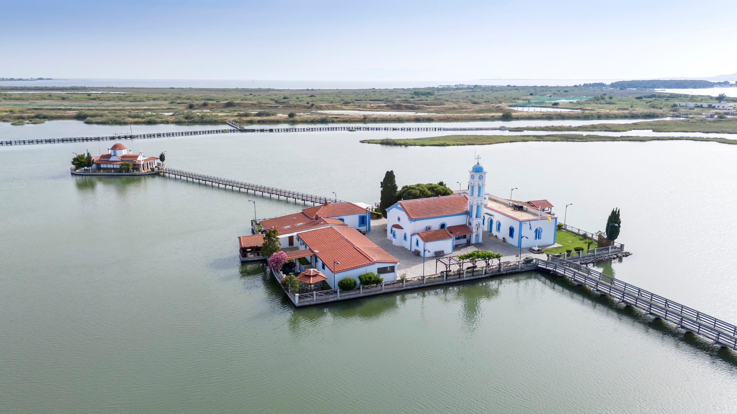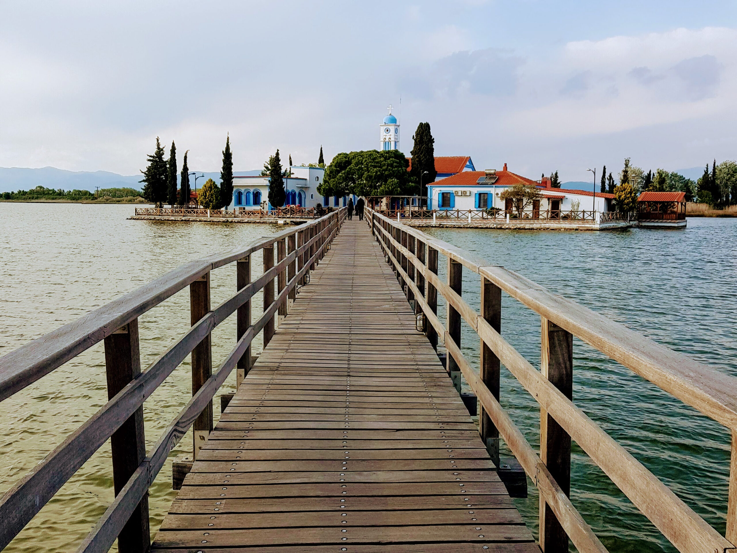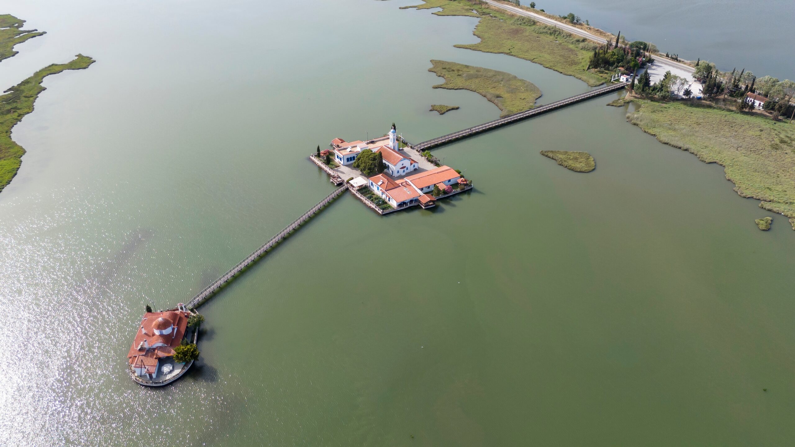 Ο ναός είναι ενωμένος με την στεριά και το παρεκκλήσι της Παναγίας της Παντάνασσας, στο οποίο φιλοξενείται μάλιστα και αντίγραφο της διάσημης ομώνυμης εικόνας από τη Μονή Βατοπαιδίου, μέσω μιας πλωτής ξύλινης γέφυρας που κάνει την περιήγηση ακριβώς πάνω στα νερά της λίμνης ακόμη πιο συναρπαστική, εντυπωσιακή και μυστηριακή. Μυστήριο που συμπληρώνεται από τον τεκέ Κιουτουκλού Μπαμπά στη δυτική όχθη της λίμνης, βορειοδυτικά του χωριού Σέλινο, κοντά στην αρχαία Αναστασιούπολη, κάποτε παραθαλάσσια πόλη που επικοινωνούσε με το Αιγαίο.