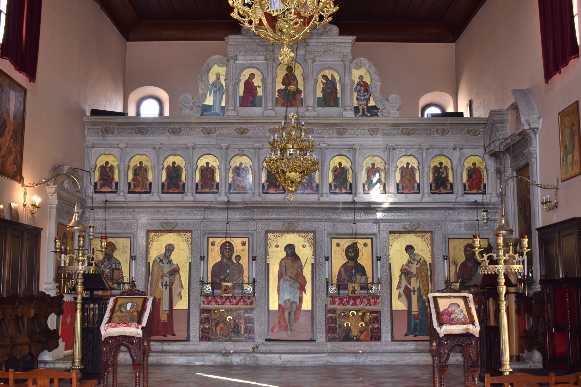 Βγαίνοντας στην αυλή με το απλό, σιδερένιο, διπλό καμπαναριό, άλλη μια χαρακτηριστική εικόνα του Καμπιέλο ξεδιπλώνεται μπροστά σας. Πλατιές, πετρόχτιστες σκαλινάδες (άλλη μια ιταλική λέξη, scalinata= σκάλα), σπίτια με περίκλειστους, ιδιωτικούς κήπους και σφυρήλατα κιγκλιδώματα στα μπαλκόνια, άφθονες γλάστρες δίπλα στις εξώπορτες κι ευτυχώς ένας χάρτης έξω από τον περίβολο της εκκλησίας για να σας καθοδηγήσει στα επόμενα βήματά σας. Ανηφορίζοντας προς την Πλατεία Ταξιάρχη, θα περάσετε κι άλλες μικροσκοπικές πλατείες που ουσιαστικά είναι οι αυλές που σχηματίζουν τα αντικρυστά σπίτια, με τις ηλικιωμένες κυρίες να ανταλλάσσουν τα νέα της ημέρας. Οι αρχοντικές οικογένειες Θεοτόκη, Καποδίστρια και Κοκκίνη που εγκαταστάθηκαν στην περιοχή τον 14ο αιώνα, τη στόλισαν με πανέμορφα αρχοντικά, όμως έλειπε μόνο μια εκκλησία. Δυστυχώς, ο ναός του Ταξιάρχη Μιχαήλ που έχτισαν, καταστράφηκε ολοσχερώς κατά τη διάρκεια του Β’ Παγκοσμίου Πολέμου, ενώ είχε ήδη πληγεί από μία πυρκαγιά το 1545. Στη θέση εκείνης της εκκλησίας που αποτελούσε το πιο αντιπροσωπευτικό δείγμα ορθόδοξου ναού της Ενετικής περιόδου, σήμερα βρίσκουμε τον ιερό ναό Παντοκράτορος, σε τυπικό επτανησιακό ρυθμό. Ο ανάγλυφος άγγελος στην κορυφή της κατασκευάστηκε από τον Ιταλό γλύπτη Τορέτι, των 18ο αιώνα και είναι ένα από τα χαρακτηριστικά της, σαν άλλος φόρος τιμής στον Ταξιάρχη -σημερινό Αρχάγγελο- Μιχαήλ.