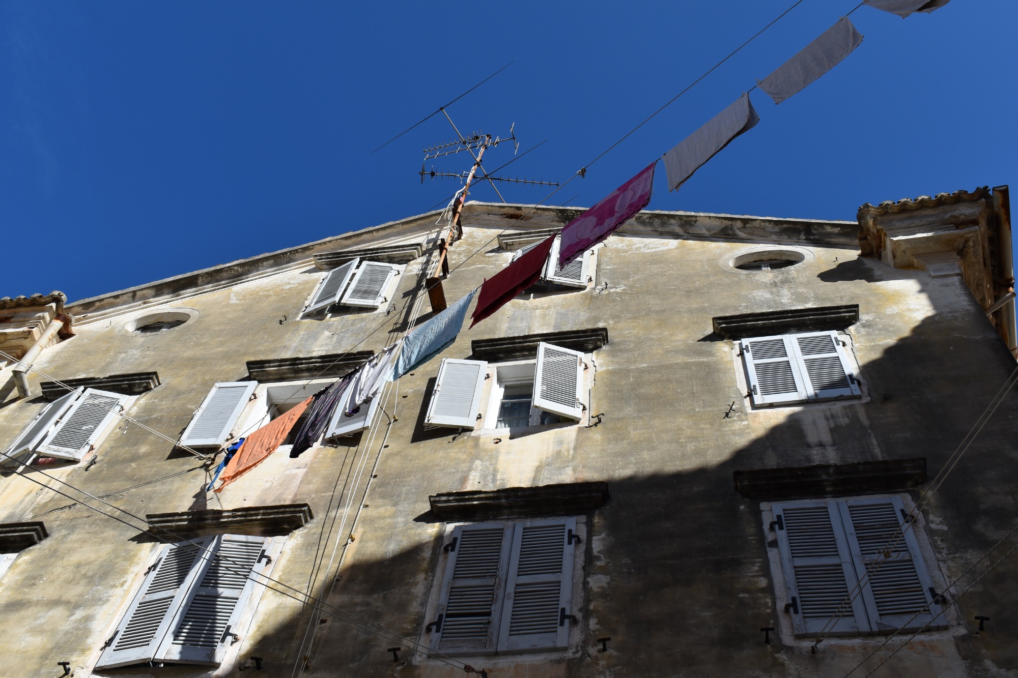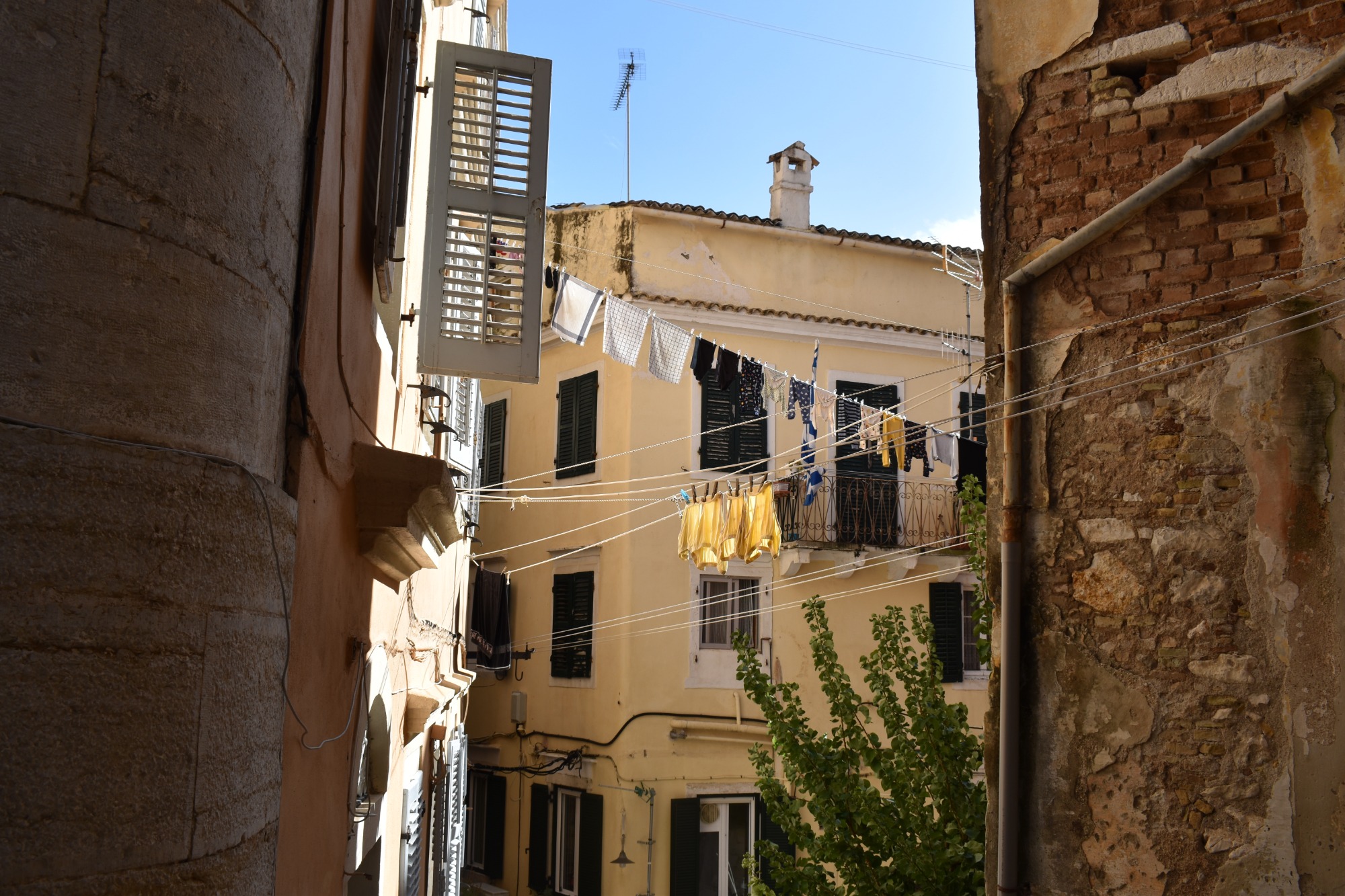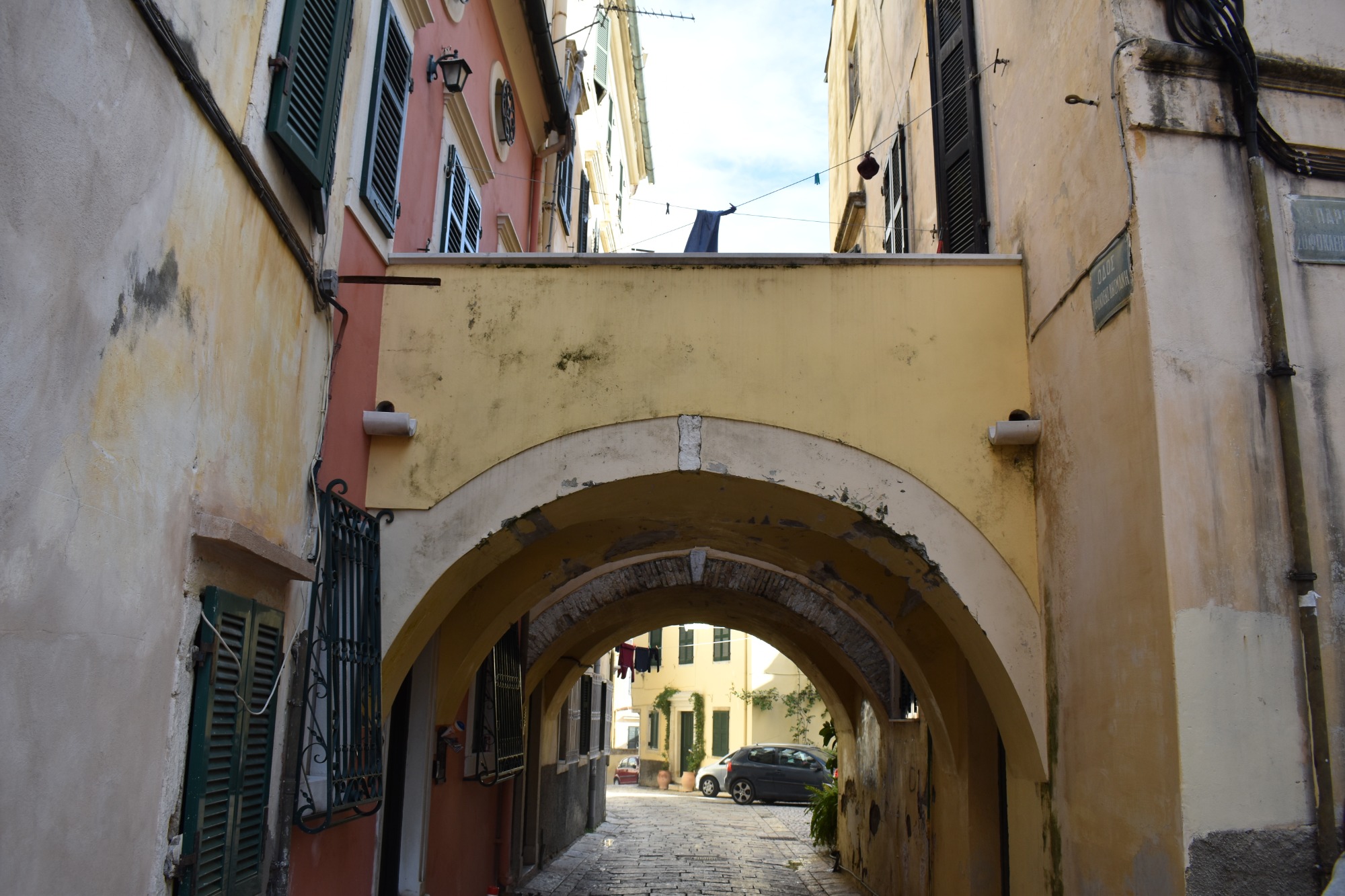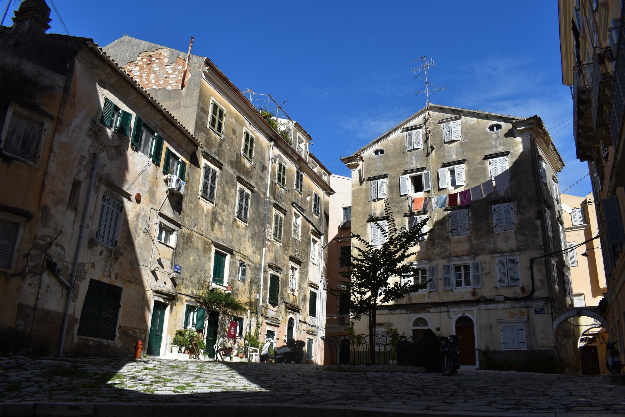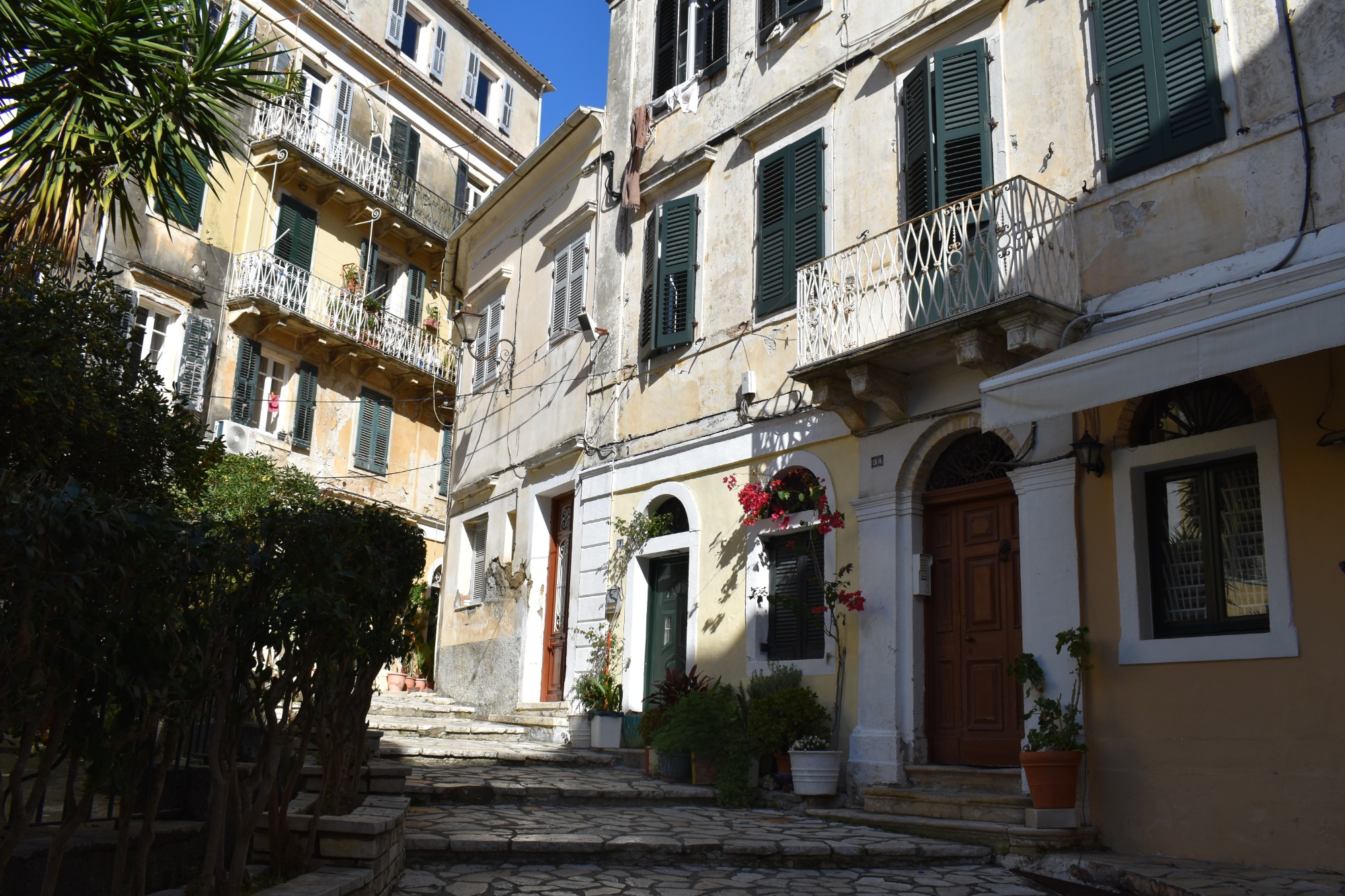 Εδώ δεν απολαμβάνεις μόνο γραφικές εικόνες τέλειων κάδρων. Σαφώς το βλέμμα εντυπωσιάζεται από την αλληλουχία των παστέλ χρωμάτων που εναλλάσσονται στα κτήρια. Ροζ, σομόν, κεραμιδί, κίτρινο της ώχρας και κόκκινο στους τοίχους, γαλάζιο και σκούρο πράσινο στις πόρτες και τα παραθυρόφυλλα, όλα γλυκαίνουν το μάτι και υπενθυμίζουν ότι στην παλιά πόλη της Κέρκυρας, που από το 2007 έχει συμπεριληφθεί στη λίστα Μνημείων Παγκόσμιας Κληρονομιάς της UNESCO, υπάρχει συγκεκριμένη παλέτα χρωμάτων που μπορεί να χρησιμοποιηθεί για τις όψεις των κτηρίων. Θα διαπιστώσετε όμως, ακόμη και σε μια σύντομη βόλτα, ότι και η όσφρηση ξεμυαλίζεται από τις μυρωδιές που ξεχύνονται από τις κουζίνες των σπιτιών, αλλά και η ακοή πολύ συχνά ευφραίνεται από τις μελωδίες που προβάρονται πίσω από κάποιο μισάνοιχτο παράθυρο. Δεν είναι δε καθόλου ασυνήθιστο σε πολλές από τις μικρές πλατείες της περιοχής, που δίνουν και στη συνοικία το όνομά της (Campiello=πλατειούλα στα Ιταλικά), να συναντήσετε και αυτοσχέδιες χορωδίες που διασκεδάζουν τους περαστικούς με τα τραγούδια τους.