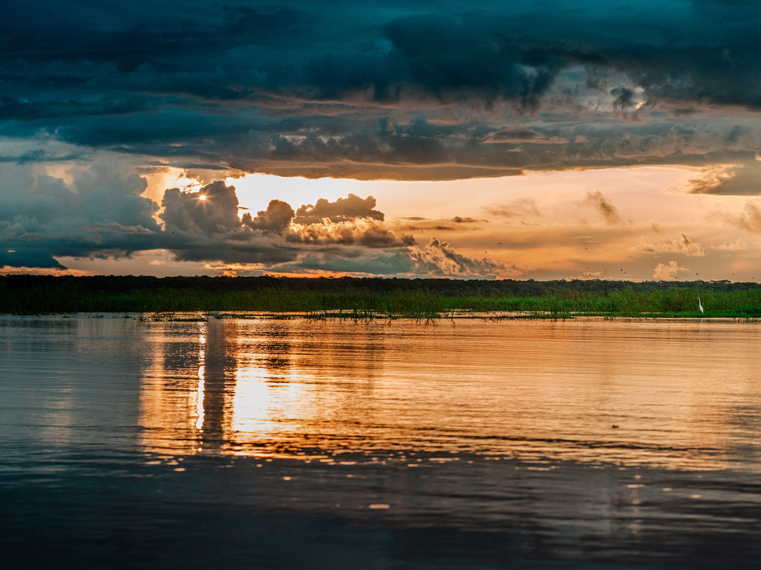 Το ηλιοβασίλεμα βάφει το ποτάμι χρυσό, πορτοκαλί και μωβ. Ο ουρανός καθρεφτίζεται στο νερό και για λίγο δεν ξεχωρίζεις πού τελειώνει το ένα και πού αρχίζει το άλλο. Το δάσος της βροχής αλλάζει ρυθμό. Οι ήχοι πυκνώνουν. Βατράχια, τζιτζίκια, μακρινοί ήχοι που δεν αναγνωρίζεις αλλά τους αισθάνεσαι.