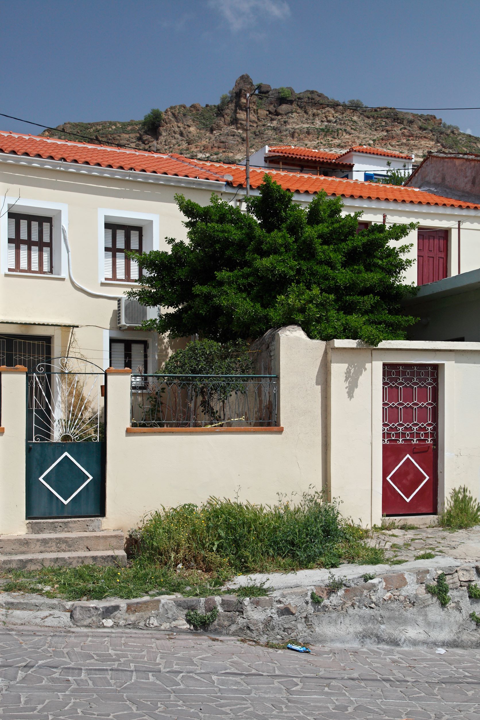 Το χωριό είναι χτισμένο αμφιθεατρικά (υψόμετρο 194 μ) στην πλαγιά ενός ηφαιστιογενούς λόφου, με μοναδική θέα προς το Αιγαίο Πέλαγος. Η περιοχή, λόγω των αντιθέσεων του φυσικού περιβάλλοντος, αποκαλείται και «Άγρια Δύση».