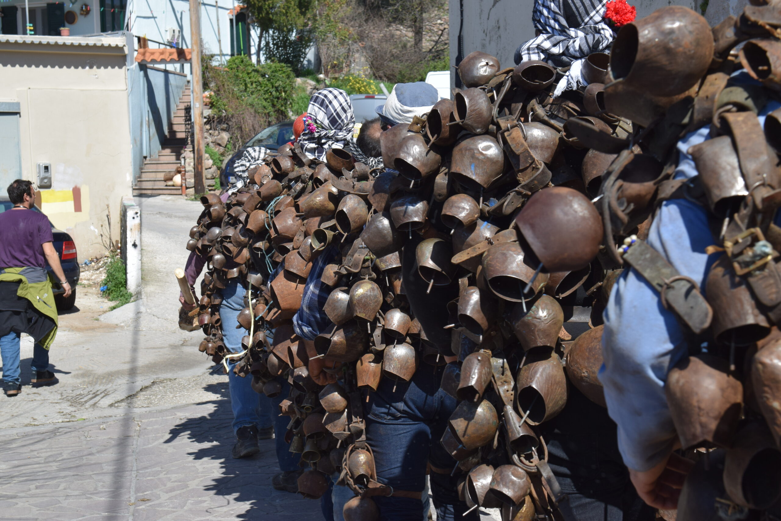 Οι αρμαθιές των κουδουνιών δένονται μεταξύ τους με τα λουριά στο στήθος, στη μέση, στα χέρια, στους γοφούς. Κάθε «κουδουνάτος» προσπαθεί να ζωστεί με όσα περισσότερα κουδούνια μπορεί, προκειμένου να κάνει και περισσότερο θόρυβο ξεσηκώνοντας τους πάντες στο πέρασμά του.