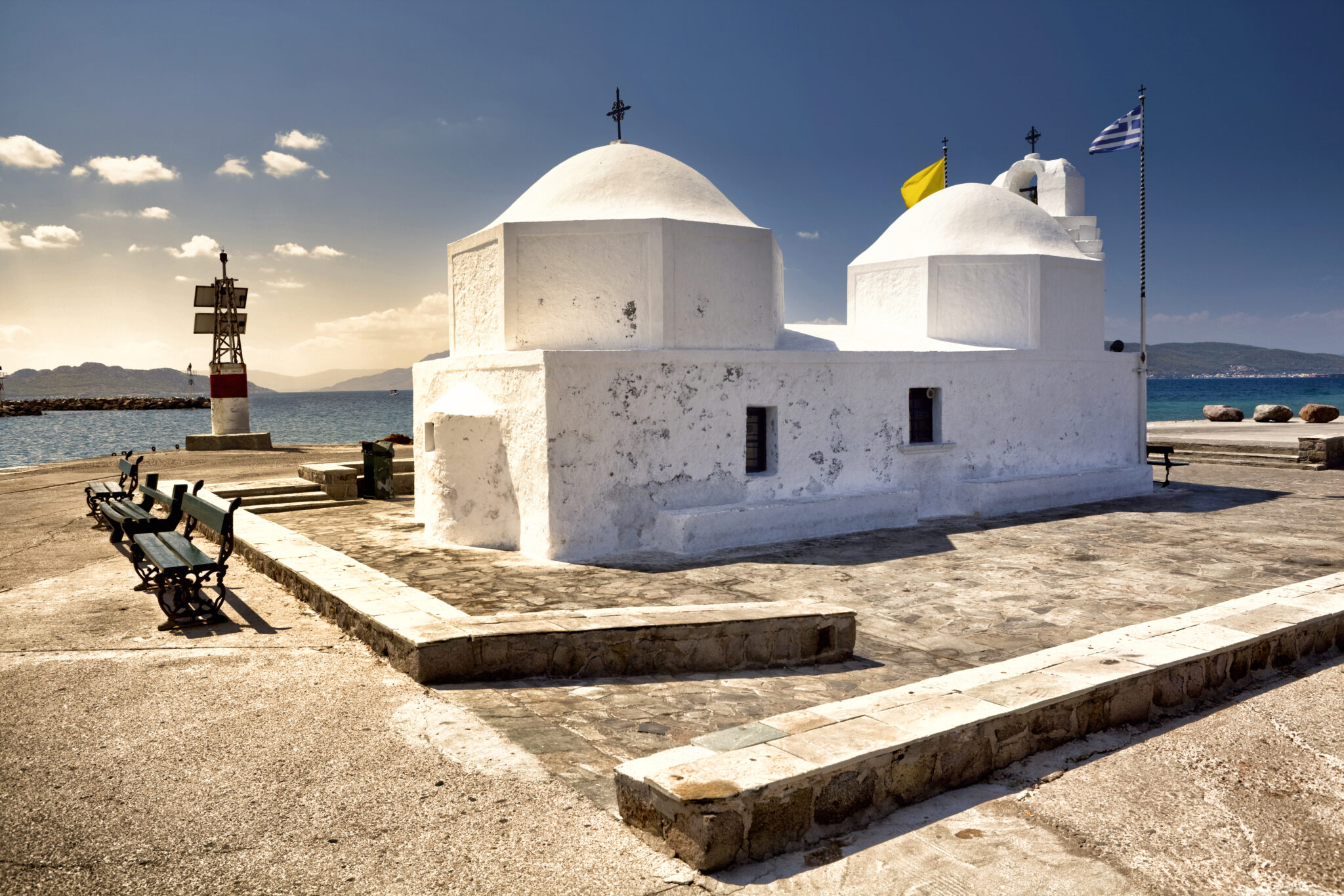 Το πρώτο που θα αντικρίσετε καθώς κατεβαίνετε από το πλοίο είναι η λευκή εκκλησία του Αγίου Νικολάου, προστάτη των θαλασσινών. Τα μόνιππα αμαξάκια με τα άλογα περιμένουν στη σειρά για μια βόλτα -που δύσκολα θα την αρνηθείτε στα παιδιά. Διαρκεί 25 λεπτά και το αμαξάκι διατρέχει τον παραλιακό και ύστερα τους δρόμους με τις φιστικιές, τους κήπους και τα παλιά αρχοντικά σπίτια.