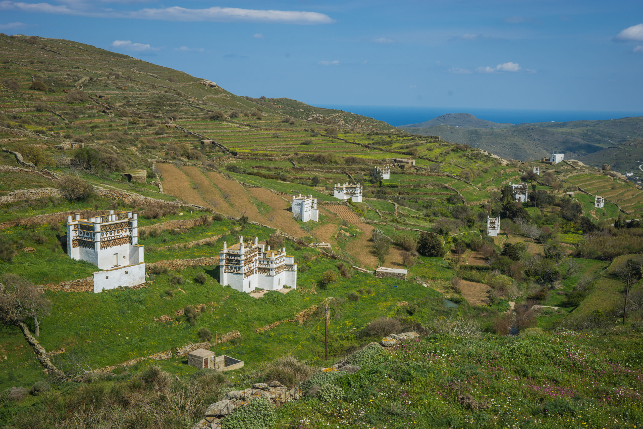Περιηγούμενοι στην Τήνο τις ανοιξιάτικες αυτές ημέρες, θα την δείτε στα καλύτερά της. Η ωραιότερη διαδρομή είναι αυτή που οδηγεί από την πόλη στον Πύργο, περνώντας από αρκετά χωριά. Είναι ουσιαστικά η ραχοκοκαλιά του νησιού και καταλήγει στην λεγόμενη Έξω Μεριά, στα βορειοδυτικά. Με αφετηρία την πόλη και την οδό Αλαβάνου, ακολουθείτε τις πινακίδες προς Πύργο. Στα 4 χιλιόμετρα μπορείτε να κάνετε μικρή παράκαμψη για να δείτε τον Κτικάδο, ένα από τα ωραιότερα τηνιακά χωριά με καταπληκτική αρχιτεκτονική και πανοραμική θέα στο πέλαγος και στα Κιόνια. Θα θαυμάσετε τα πλακόστρωτα δρομάκια με τις καμάρες, τα σπίτια με τους μαρμάρινους φεγγίτες, τις βρύσες με τις «πλύστρες» – όπου ακόμα καθαρίζουν οι γυναίκες τα χαλιά και τις κουβέρτες-, τον καθολικό ναό του Τιμίου Σταυρού και την ορθόδοξη εκκλησία της Υπαπαντής, ή Μεγαλομάτας. Ένα χιλιόμετρο από τον Κτικάδο απέχει ο Χατζηράδος, μικρότερο χωριό, με την ίδια όμως «αύρα».