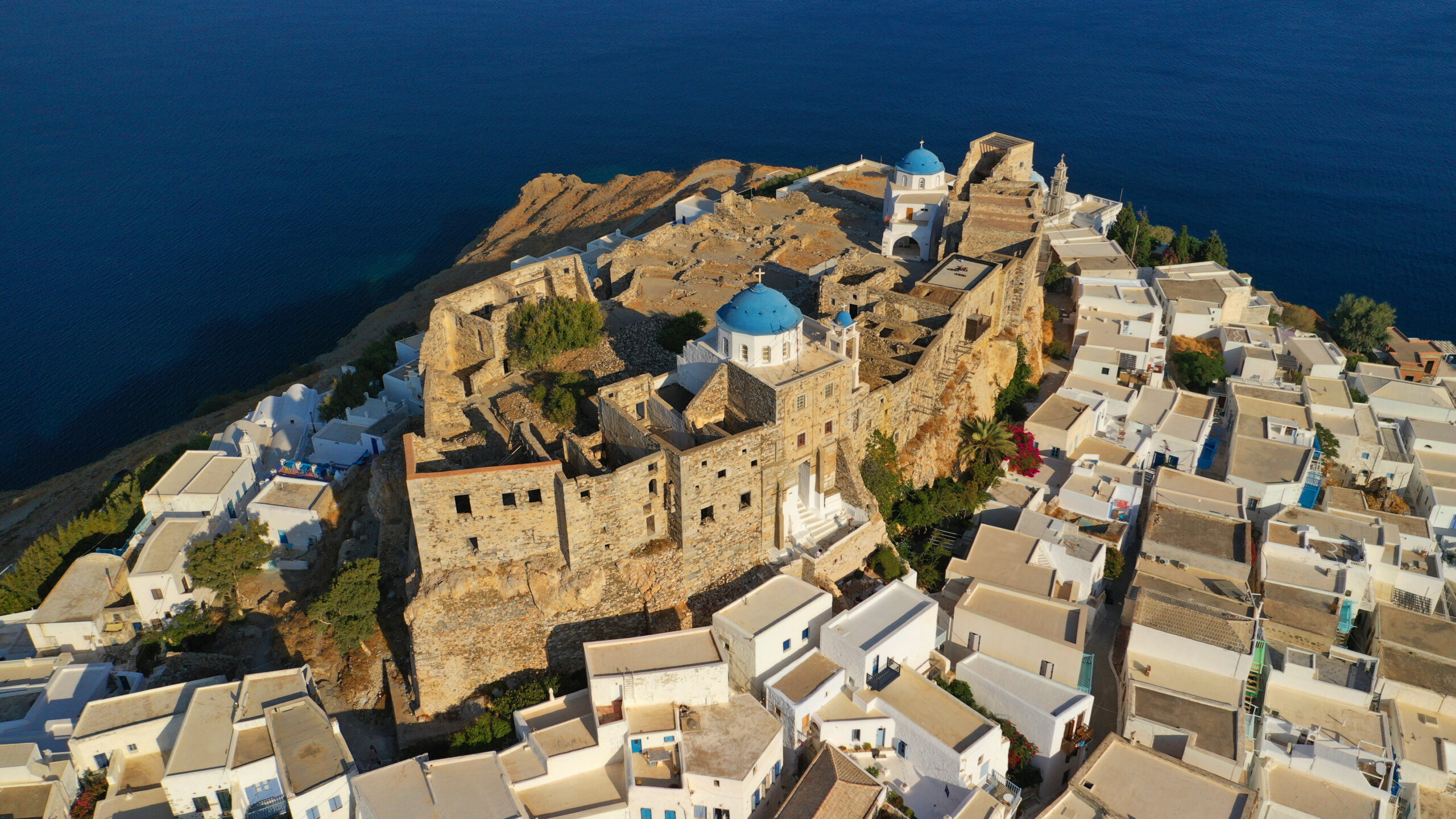 Ακολουθήστε τα ανηφορικά δαιδαλώδη σοκάκια που ξεκινούν από τον Πέρα Γυαλό και φτάνουν ως το Κάστρο, περνώντας ανάμεσα από γραφικές, ήσυχες γειτονιές. Εδώ δεν ψάχνεις την ομορφιά, εδώ η ομορφιά σε περιβάλει. Είναι παντού, στους υπέροχα διατηρημένους ανεμόμυλους που σε καλωσορίζουν στην καρδιά του οικισμού, στα ξύλινα μπαλκόνια που δίνουν στα χαρακτηριστικά πάλλευκα κυκλαδίτικα σπίτια αέρα από Δωδεκάνησα, στις φορτωμένες άνθη βουκαμβίλιες και τις αμέτρητες ευτυχισμένες γάτες που κατά τη διάρκεια της μέρας δύσκολα βρίσκουν σκιά να δροσιστούν. Η ανάβαση μέχρι το κάστρο δεν είναι εύκολη κι ο καυτός ήλιος δεν κάνει τα πράγματα πιο εύκολα. Γι’ αυτό κι η Χώρα είναι ήσυχη όσο τη λούζει αδυσώπητος ο ήλιος. Η καλύτερη ώρα λοιπόν για σουλάτσο και επίσκεψη στο κάστρο είναι νωρίς το πρωί ή λίγο πριν το σούρουπο.