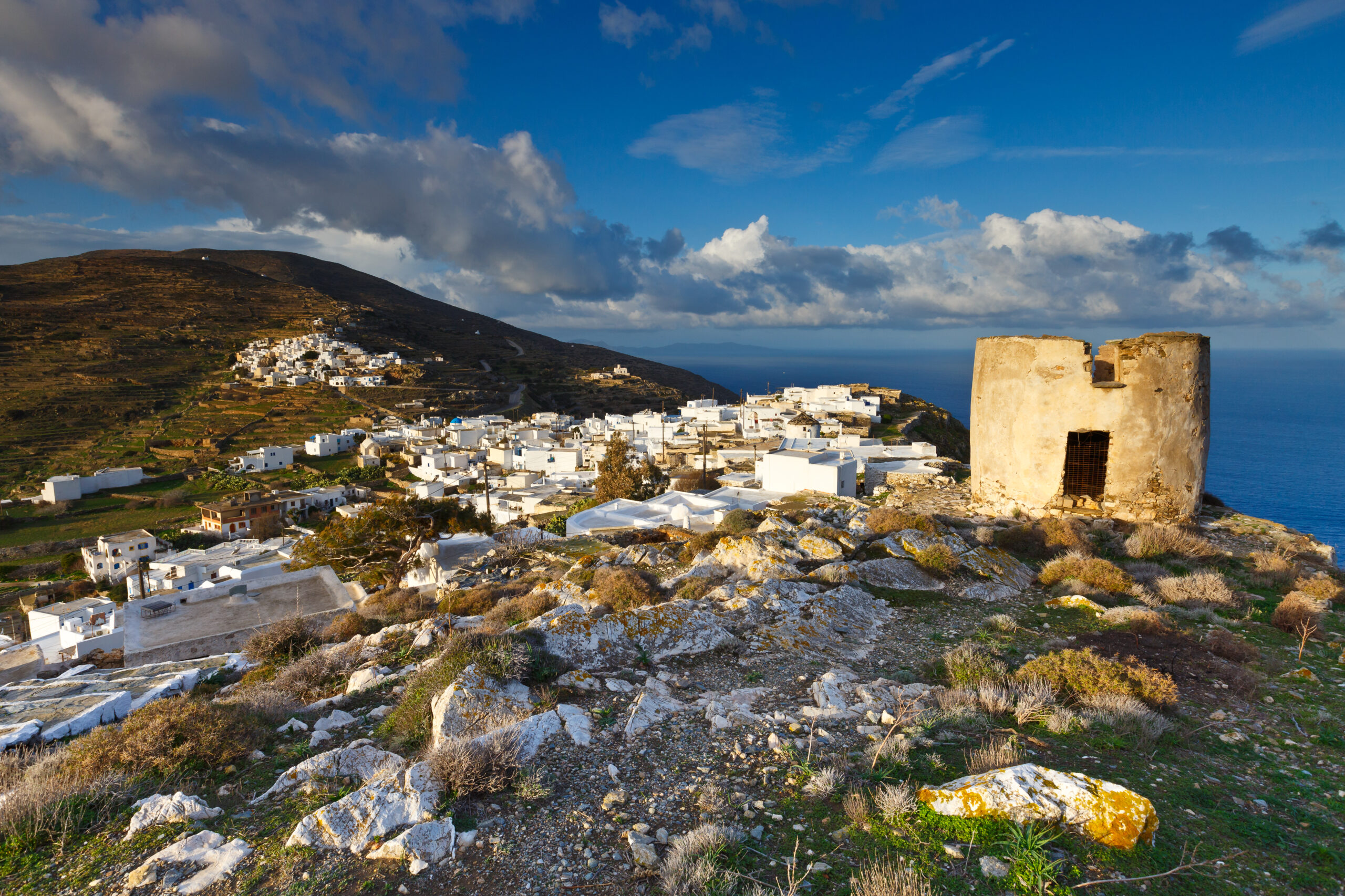 Ουσιαστικά το νησί έχει δυο οικισμούς όλους και όλους, την Αλοπρόνοια που είναι και το λιμάνι και τη Χώρα, η οποία χωρίζεται στο Χωριό και το Κάστρο. Το Κάστρο, χτισμένο τον 15ο αι. ήταν ένας οχυρωμένος οικισμός σε υψόμετρο 280 μ. πάνω από τη θάλασσα, σήμερα το μόνο που σώζεται είναι το Παραπόρτι στην πλατεία. Ωστόσο η μεσαιωνική ατμόσφαιρα είναι ακόμα έντονη σε όλη τη Χώρα, χαμηλά σπιτάκια, φιδίσια καλντερίμια, στενά περάσματα, πέτρινες μάντρες και μικρές στοές που όμως έχουν ντυθεί την κυκλαδίτικη φορεσιά, ασβέστης στους τοίχους, βασιλικούς, πολύχρωμα γεράνια και βουκαμβίλιες στις μικρές αυλές.
