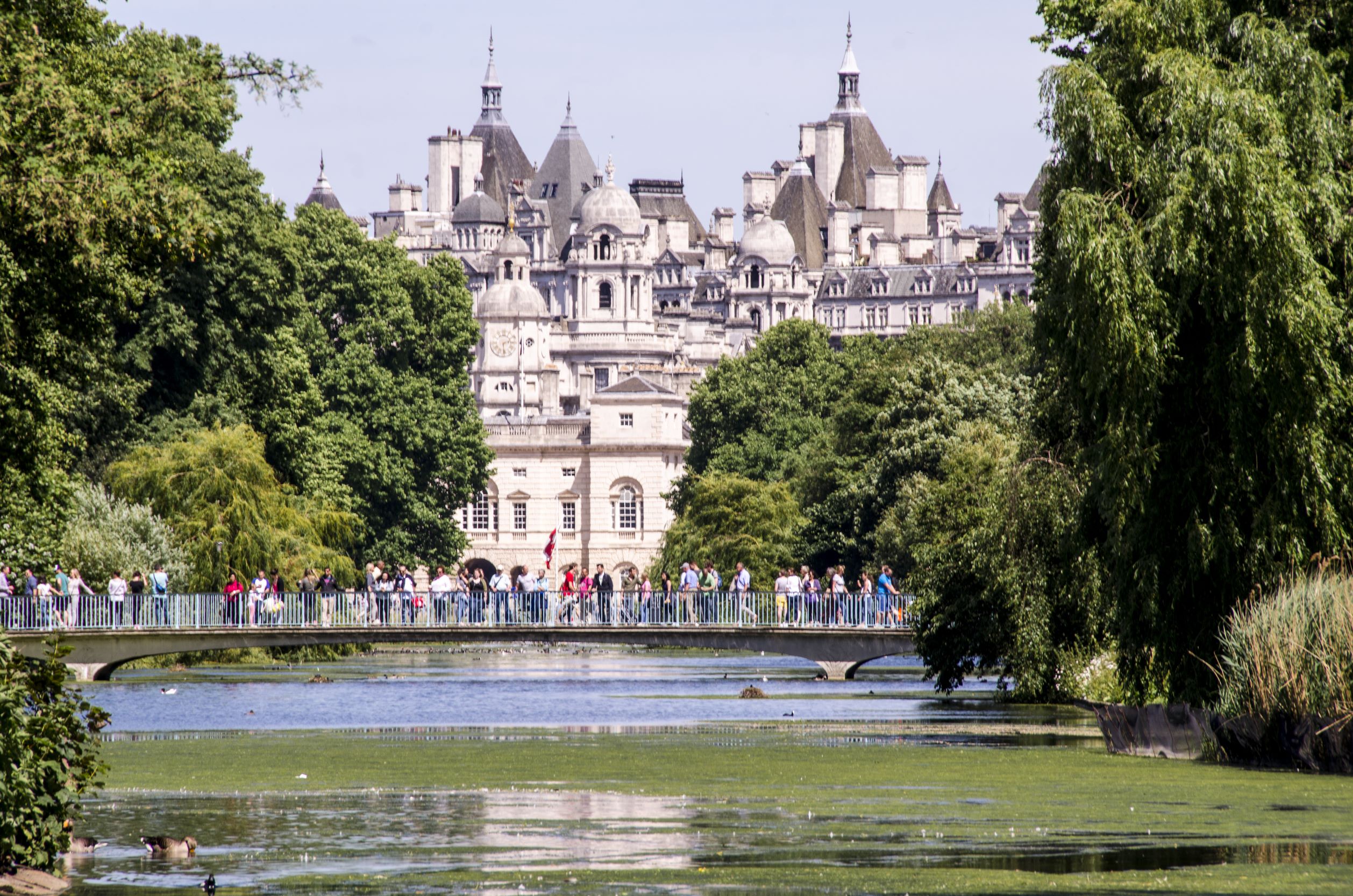 ‘Όμως η λίμνη είναι το ίδιο απολαυστική και για τους ανθρώπους, χάρη στη γέφυρα Blue Brigde που τη διασχίζει. Η αρχική ιδέα ανήκε στον αρχιτέκτονα τοπίων John Nash, τον τελευταίο που επανασχεδίασε τη διάταξη του τοπίου του πάρκου, αλλά η σημερινή, χαμηλή, αψιδωτή γέφυρα είναι η τρίτη που χτίστηκε. Πρόκειται για το καλύτερο σημείο για να σταθεί κανείς και να θαυμάσει την πανέμορφη θέα 360ᵒ, μία από τις θεαματικότερες και πιο ρομαντικές του Λονδίνου.