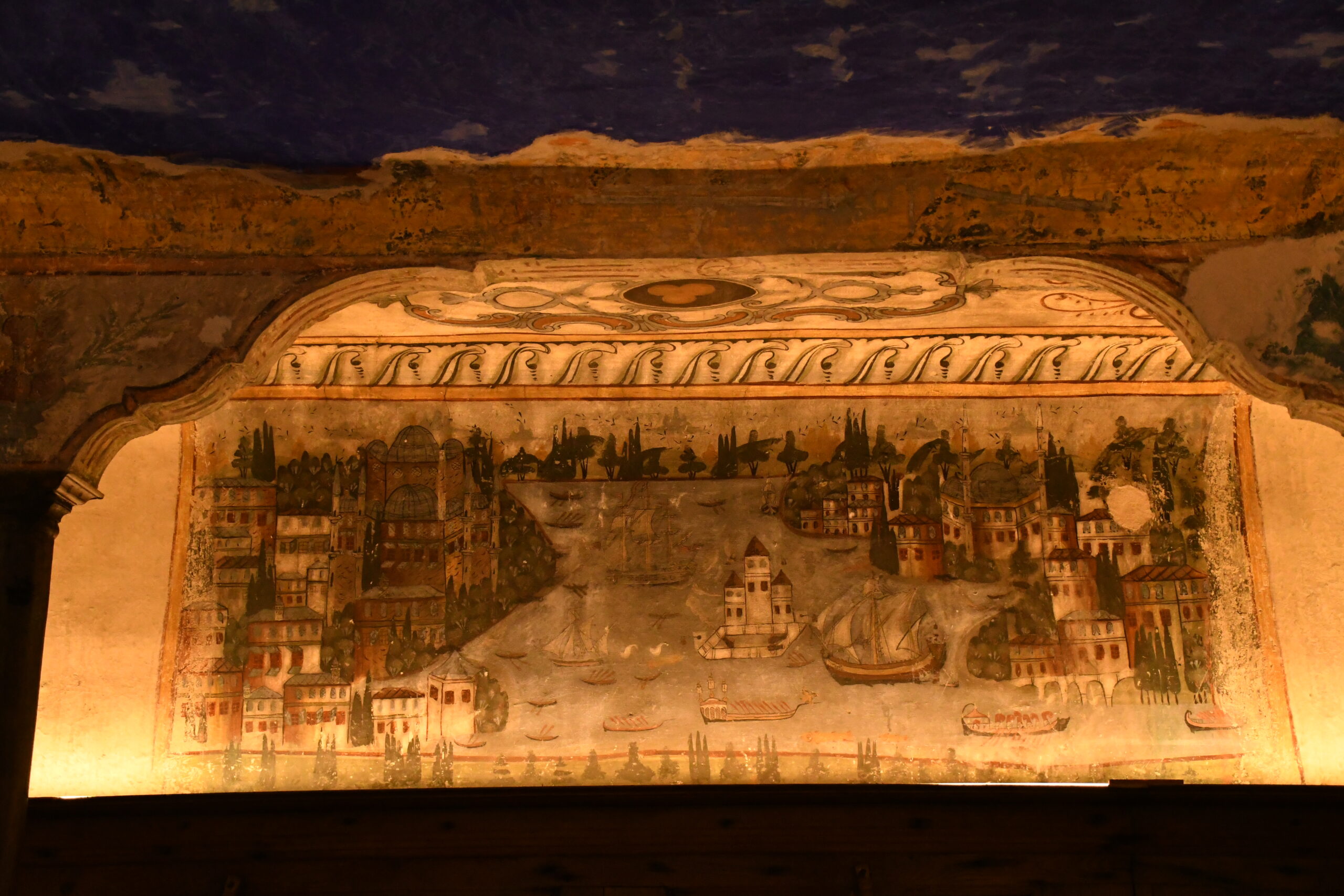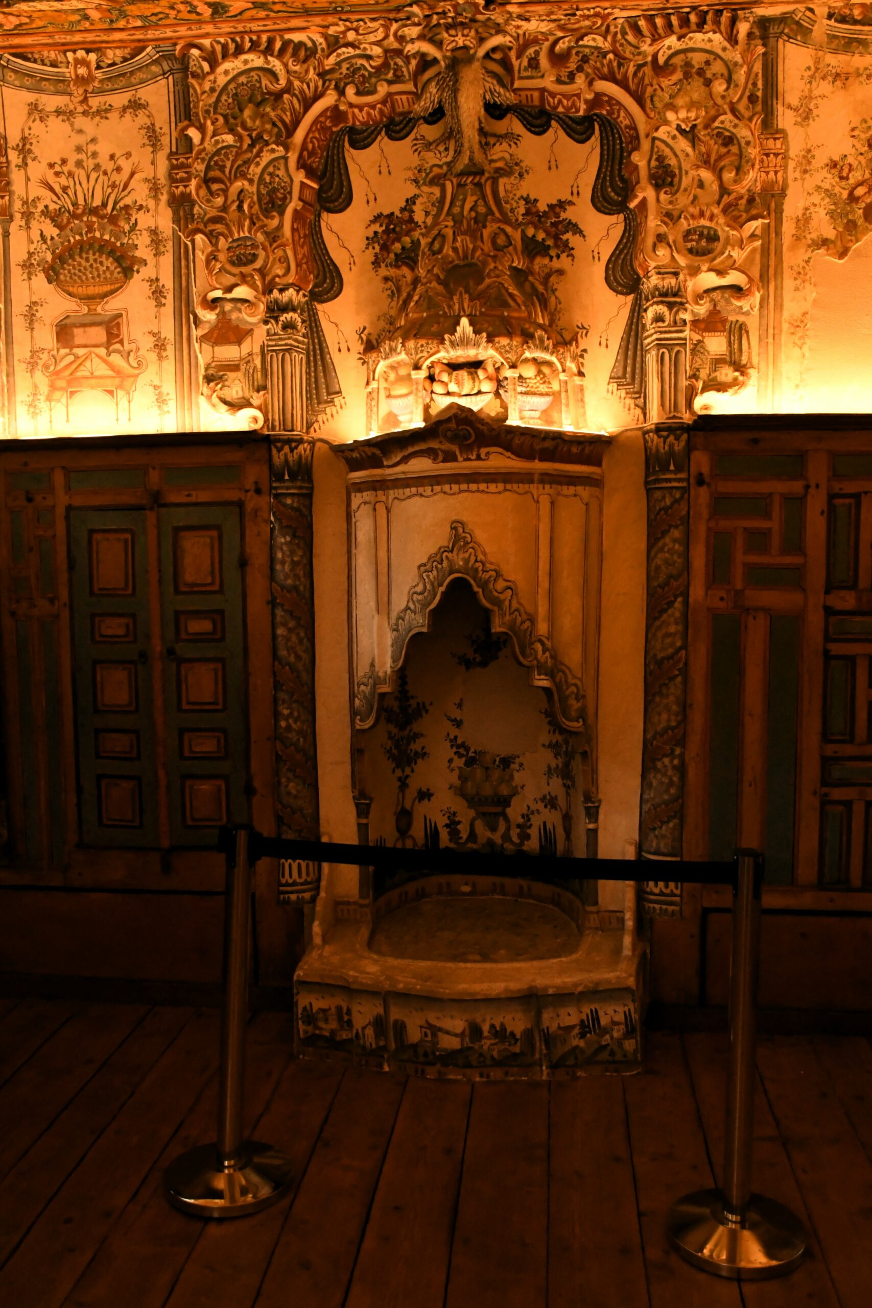 Ο διάκοσμος ακολουθεί μια διαβάθμιση, με τα πιο πολύτιμα στοιχεία να βρίσκονται στα ανώτερα επίπεδα, αποπνέοντας αίσθηση μεγαλείου και καλλιτεχνικής επιδεξιότητας. Η ξυλόγλυπτη οροφή και οι σκαλιστές μεσάντρες προσθέτουν στη λαμπρότητα, αποδεικνύοντας το υψηλό επίπεδο τεχνικής και την αγάπη για την τέχνη.