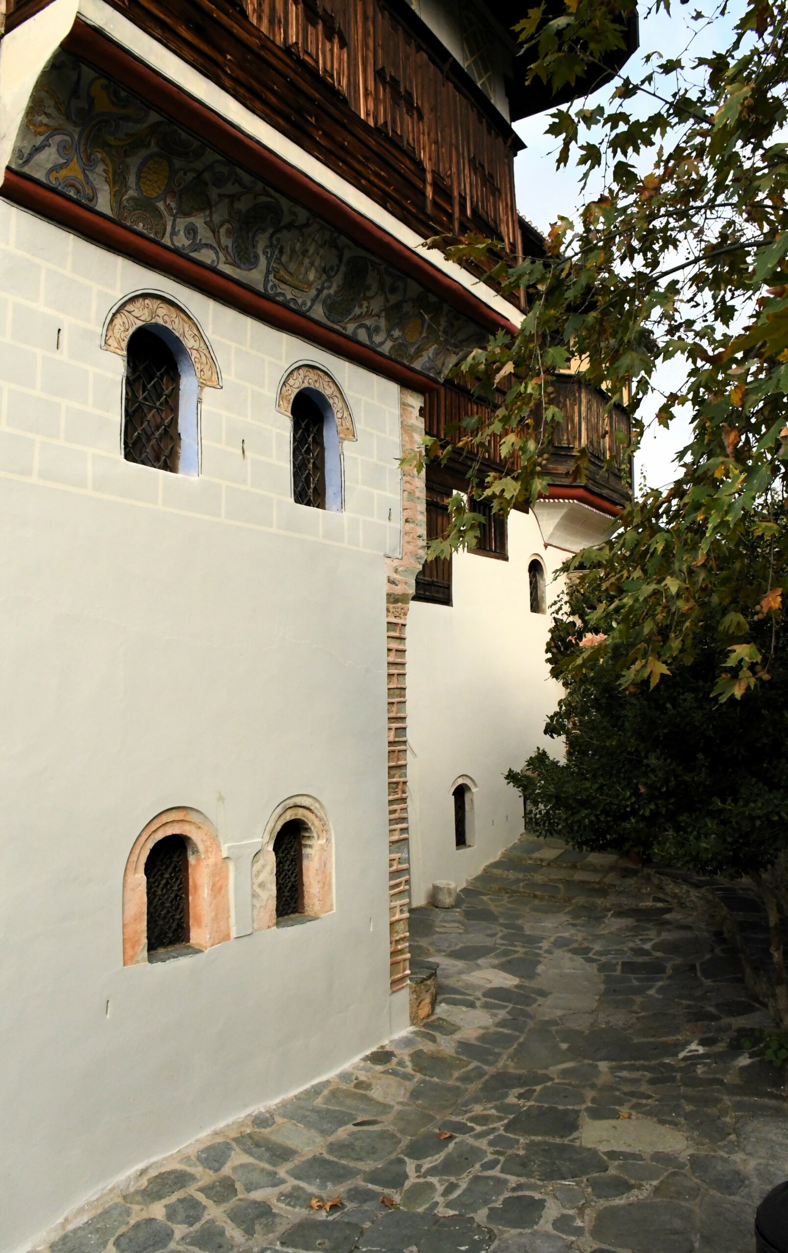 Το εσωτερικό του εντυπωσιάζει με τον πλούσιο τοιχογραφικό διάκοσμο, που καλύπτει τους χώρους πάνω από ξύλινες επενδύσεις. Οι τοιχογραφίες είναι φιλοτεχνημένες από τον μάστορα Λ.Λ., και απεικονίζουν σκηνές από φανταστικά και πραγματικά τοπία, όπως η Κωνσταντινούπολη, αλλά και στοιχεία φυσικού κόσμου, όπως άνθη και πουλιά.
