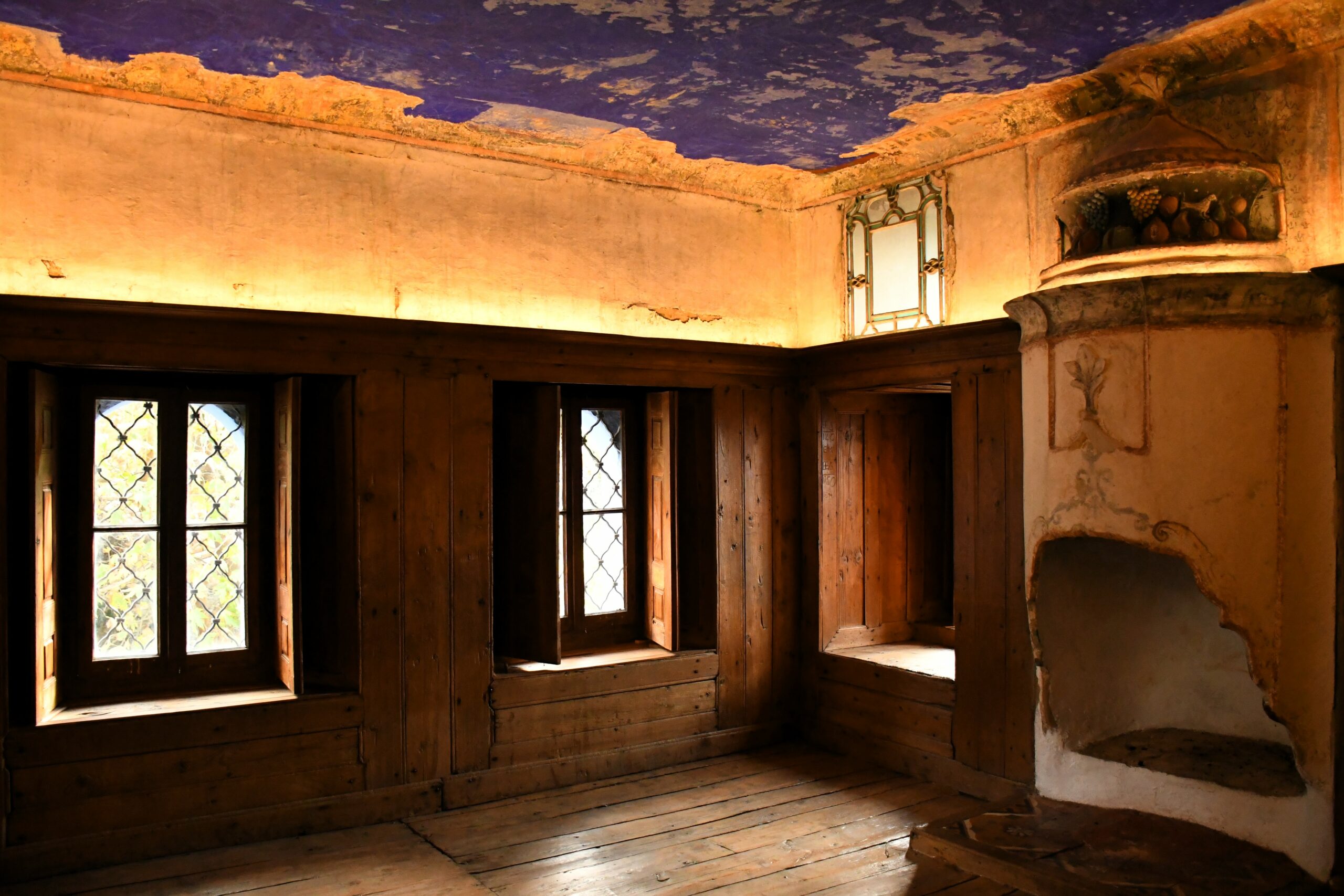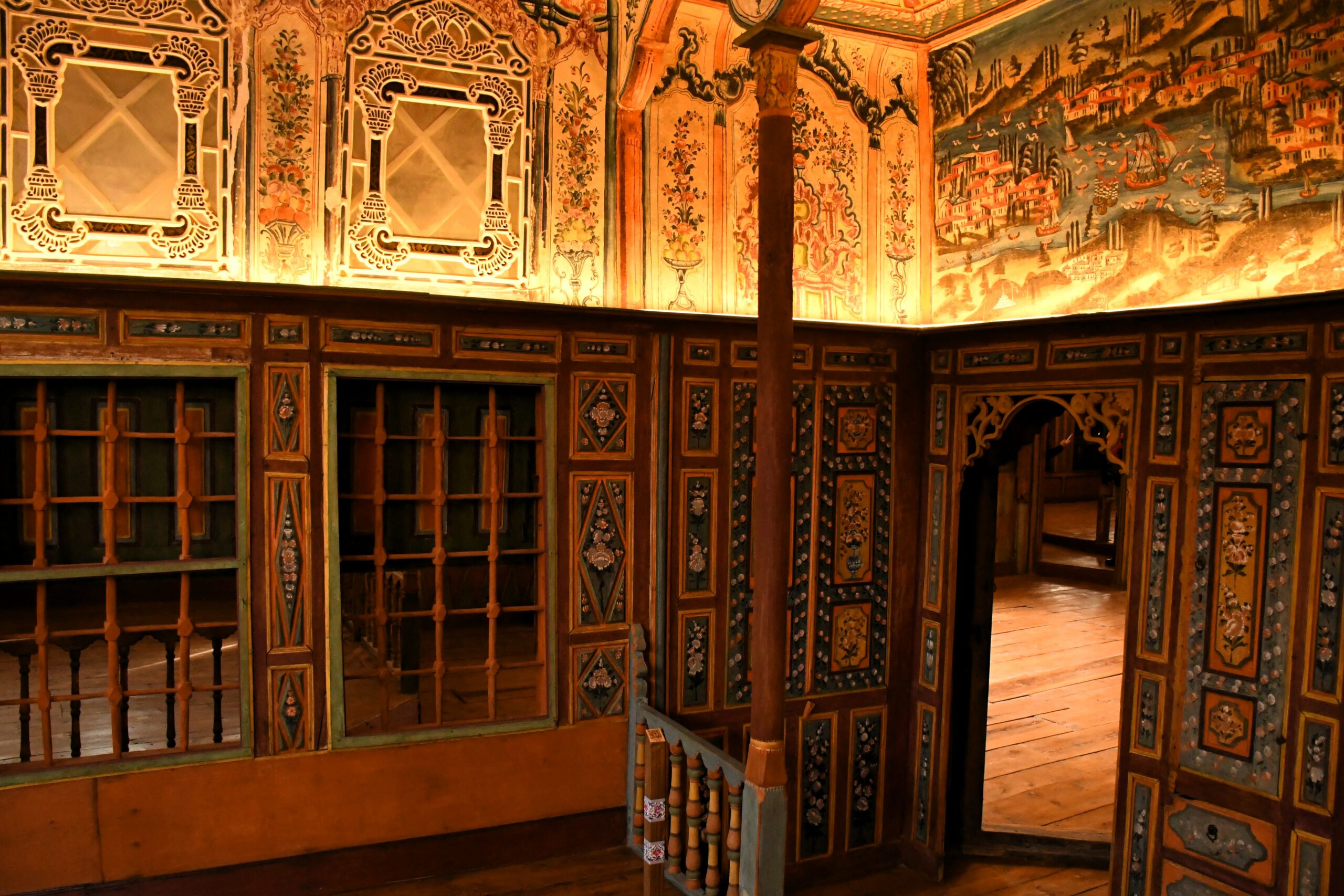 Ο πρώτος όροφος, ο μεσιακός, ήταν αφιερωμένος στη χειμερινή διαμονή της οικογένειας. Οι χώροι του είναι διακοσμημένοι με παραδοσιακές τοιχογραφίες και κομψά τζάκια που ζέσταιναν το σπίτι τους ψυχρούς μήνες, ενώ ξύλινα ντουλάπια και παραστάσεις προσθέτουν μια πινελιά κομψότητας και πολυτέλειας. Ο τελευταίος όροφος, ο ξάνωγος, χρησιμοποιούνταν κατά τους καλοκαιρινούς μήνες. Διαθέτει μεγάλα παράθυρα και χρωματιστούς φεγγίτες, επιτρέποντας στο φως και στον αέρα να διαπερνούν το χώρο και να δροσίζουν τους εσωτερικούς χώρους, δημιουργώντας μια αίσθηση ηρεμίας και φρεσκάδας.