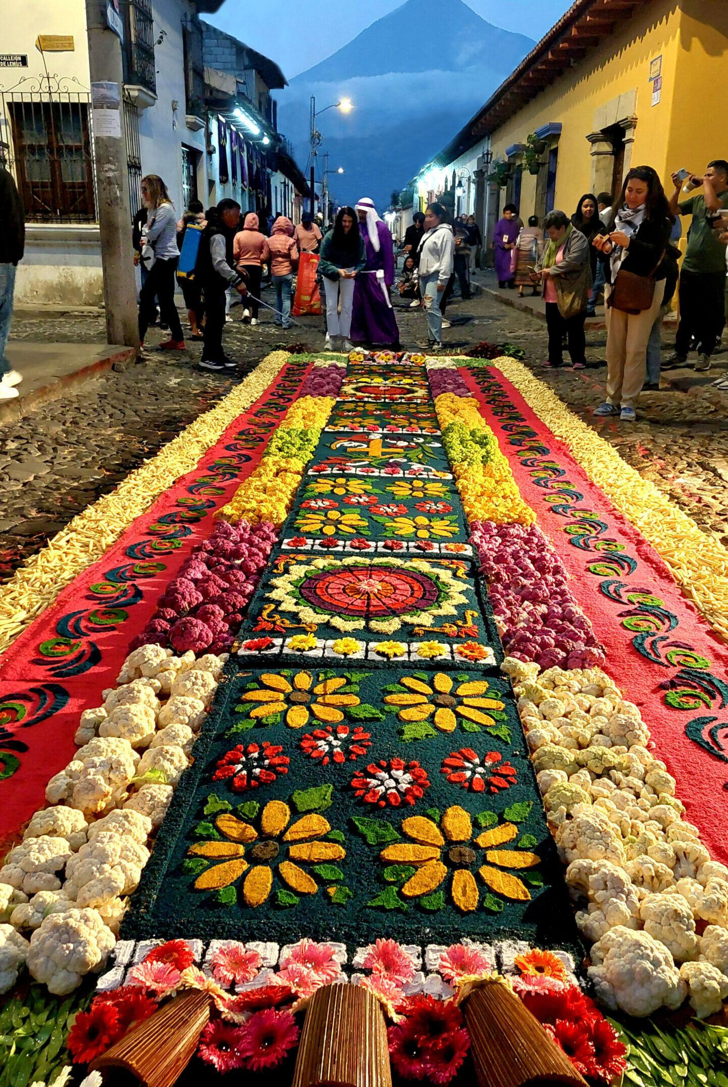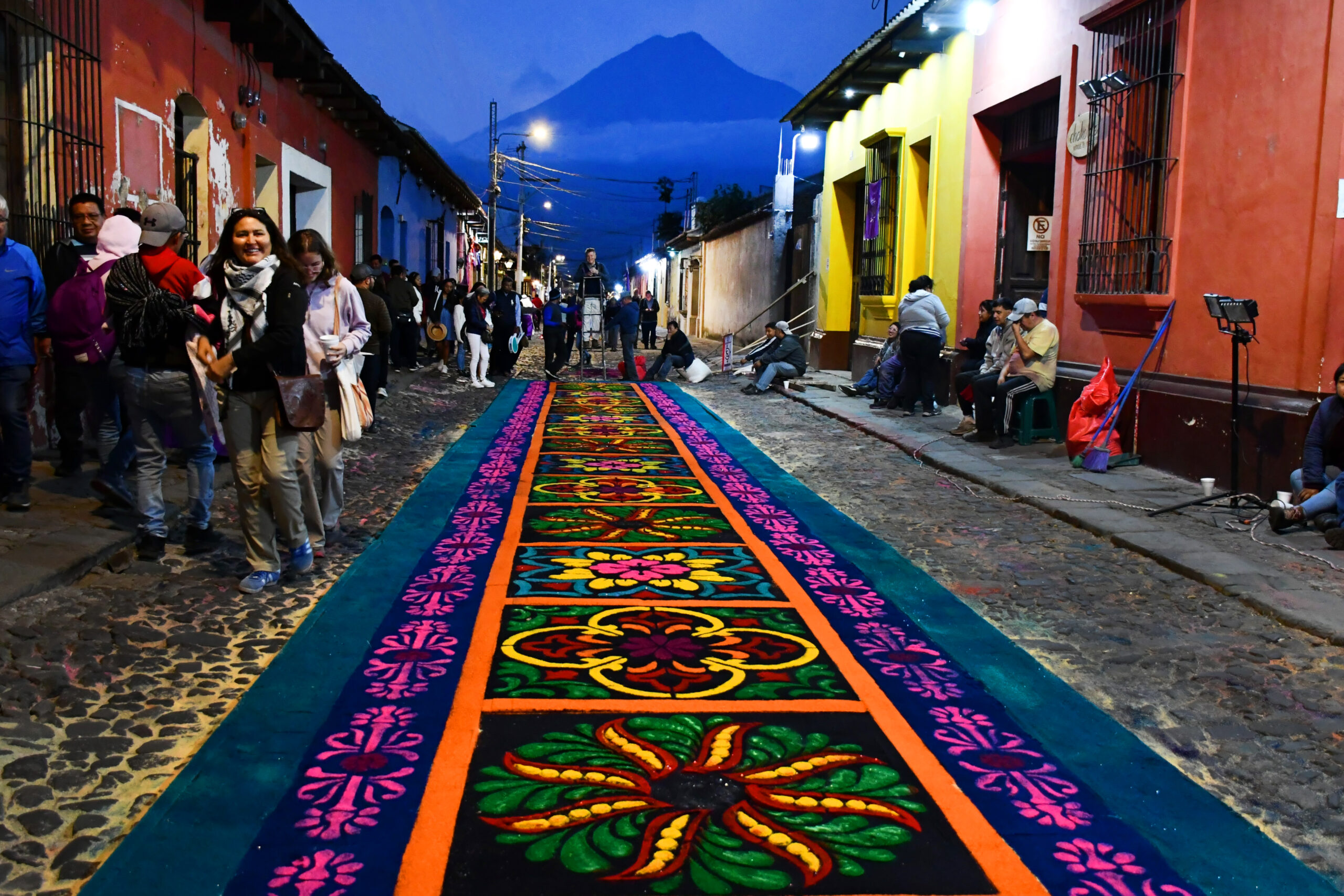 Μεγάλη Εβδομάδα, «Semana Santa» στην Αντίγκουα. Η πολύχρωμη αποικιακή πόλη αν και έχει ενδυθεί στο χρώμα του πένθους, παραμένει γοητευτική και μυστηριώδης. Τα πολύχρωμα χαλιά, τα περίφημα alfombras έχουν απλωθεί σε κάθε γειτονιά και πλακόστρωτο δρομάκι, έτοιμα να πατηθούν από τους κουκουρούτσος (cucuruchos), τους προσκυνητές που κουβαλούν στους ώμους τους τα andas, τις ξύλινες πλατφόρμες με τα αγάλματα του Χριστού και της Παναγίας που αναπαριστούν τα Θεία Πάθη. Το βάρος ασήκωτο, οι προσκυνητές εναλλάσσονται, αλλά η τιμή για αυτούς που το μεταφέρουν μεγάλη. Η μπάντα συνοδεύει το ρυθμικό πένθιμο βήμα τους και υπογραμμίζει με τις νότες το βάρος της θλίψης. Ο καπνός και η μυρωδιά από το θυμίαμα κατακλύζουν τους δρόμους που ανοίγουν διόδους για εμάς σε ένα ταξίδι πρωτόγνωρης μύησης. Μια εμπειρία μυσταγωγική κάτω από το βλέμμα και τις φουμαρόλες των υποβλητικών ηφαιστείων που δεσπόζουν πάνω από την πανέμορφη αποικιακή πόλη.