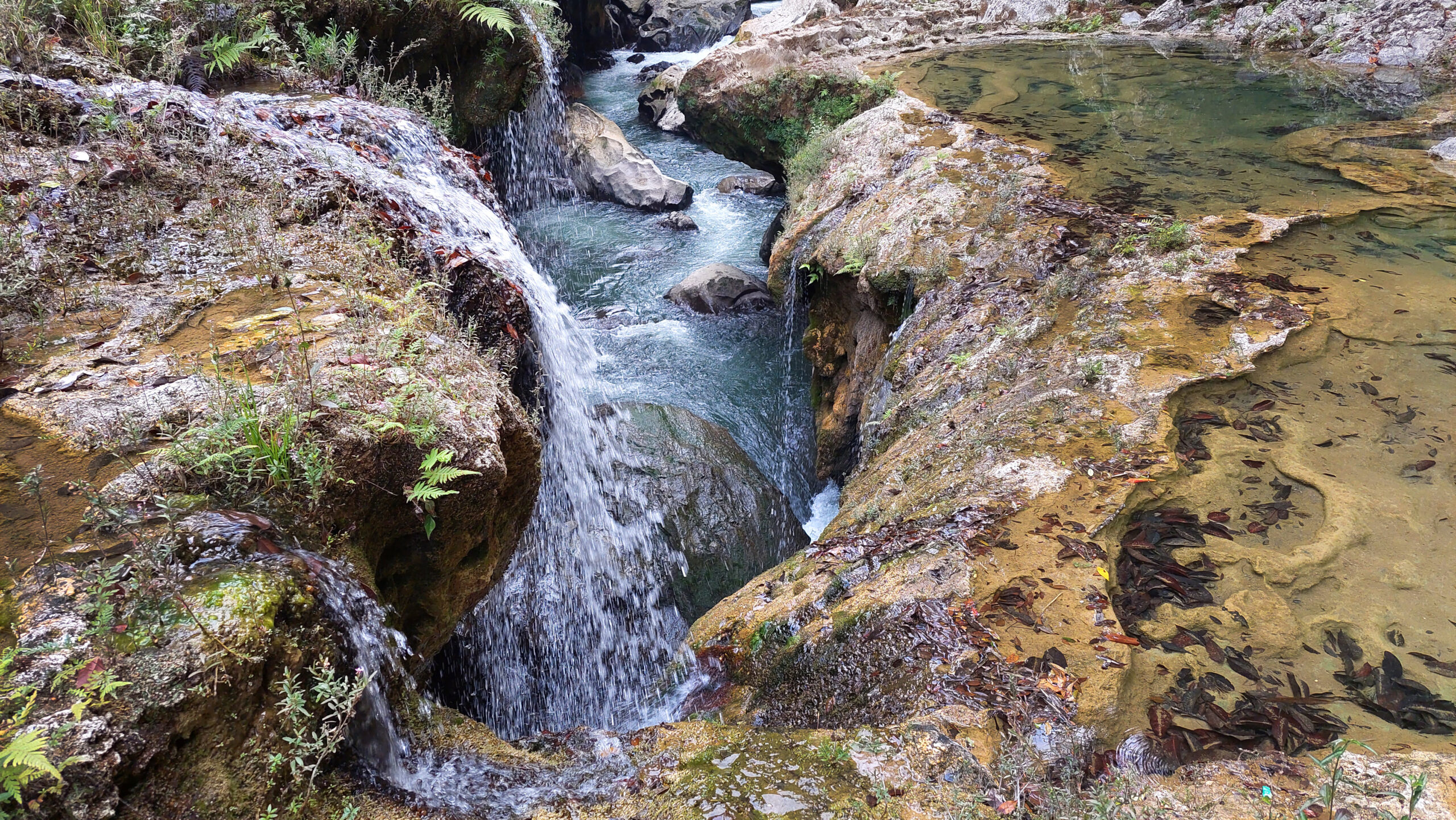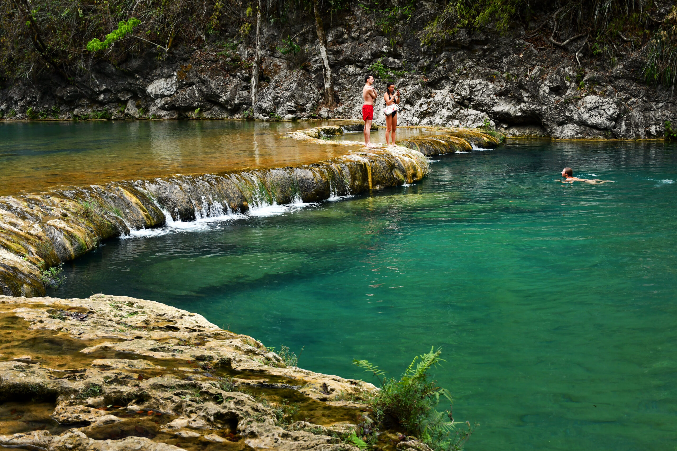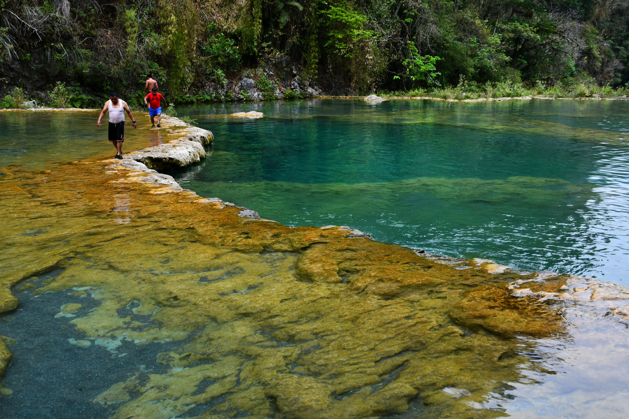 Το εντυπωσιακό φυσικό μνημείο σχηματίζεται πάνω από τον ποταμό Καχαμπόν, ο οποίος χάνεται κάτω από τη γη, όταν προσεγγίζει ένα βαθύ φαράγγι μέσα στη ζούγκλα. Στο σημείο αυτό δημιουργείται μια φυσική ασβεστολιθική γέφυρα μήκους 300 μέτρων, κάτω από την οποία περνά ο ποταμός. Στην επιφάνεια της γέφυρας βλέπουμε να αστράφτουν μια σειρά από βαθμιδωτές σμαραγδένιες λίμνες-πισίνες. Στα κρύα νερά τους το κολύμπι προσφέρει μία σπάνια απόλαυση. Το όνομα Semuc Champey προέρχεται από την γλώσσα των Μάγια Κετσί και σημαίνει «εκεί όπου ο ποταμός κρύβεται κάτω από τη γη». Το πανέμορφο φυσικό τοπίο προσεγγίζεται με 4Χ4 αγροτικά αυτοκίνητα.