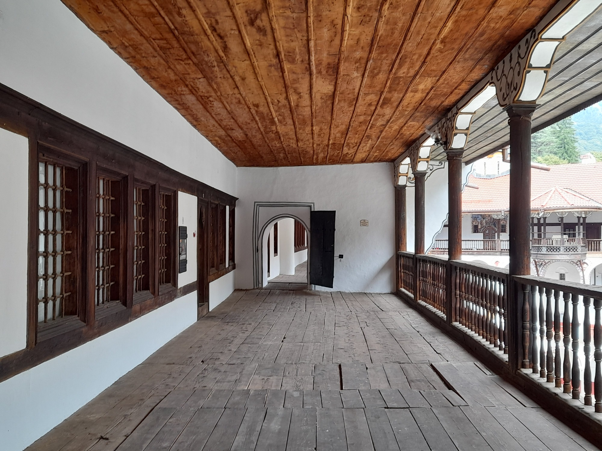 Εμάς μας οδήγησε κατ΄ αρχήν στα αρχονταρίκια, στις αίθουσες υποδοχής, εξαιρετικά δείγματα της μακεδονίτικης αρχιτεκτονικής. Τεράστια δωμάτια, τα οποία έχουν σε όλες τους τις πλευρές ξύλινους πάγκους, τα γνωστά μιντέρια, όπως αποκαλούνταν οι καναπέδες της εποχής, και στρογγυλούς σοφράδες στη μέση αντί τραπεζιών. Οι τοίχοι και τα ταβάνια είναι ξυλόγλυπτα και λεπτεπίλεπτες ζωγραφιές σε κάποια σημείων των αιθουσών δείχνουν την υψηλή τέχνη των λαϊκών μαστόρων και την οικονομική ευρωστία του μοναστηριού. Αίθουσες με υφαντά χαλιά, με χειροποίητα κεντήματα ανασυνθέτουν ολόκληρο το βαλκανικό σύμπαν του παρελθόντος και ουσιαστικά αποτελούν ένα μικρό εθνογραφικό μουσείο.
