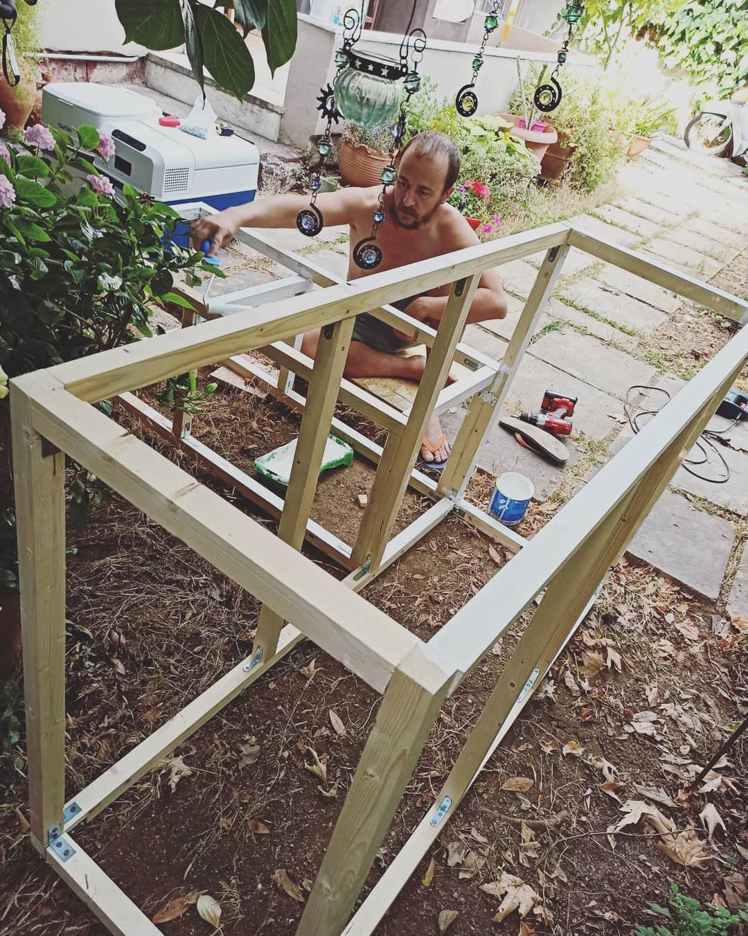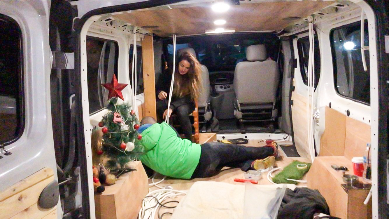 Πέρασαν κάμποσο καιρό μαστορεύοντας πάνω σε ένα εννιαθέσιο όχημα: «Είχε προηγηθεί μια ολόκληρη περίοδος στην οποία βλέπαμε σχετικά βίντεο στο Ίντερνετ. Και επειδή “πιάνουν” τα χέρια μας”, αν εξαιρέσουμε την ηλεκτρολογική εγκατάσταση και τα φωτοβολταϊκά, το κόστος δεν ήταν μεγάλο. Χρησιμοποιήσαμε φτηνή ξυλεία, πράγματα που βρήκαμε στον δρόμο κλπ».