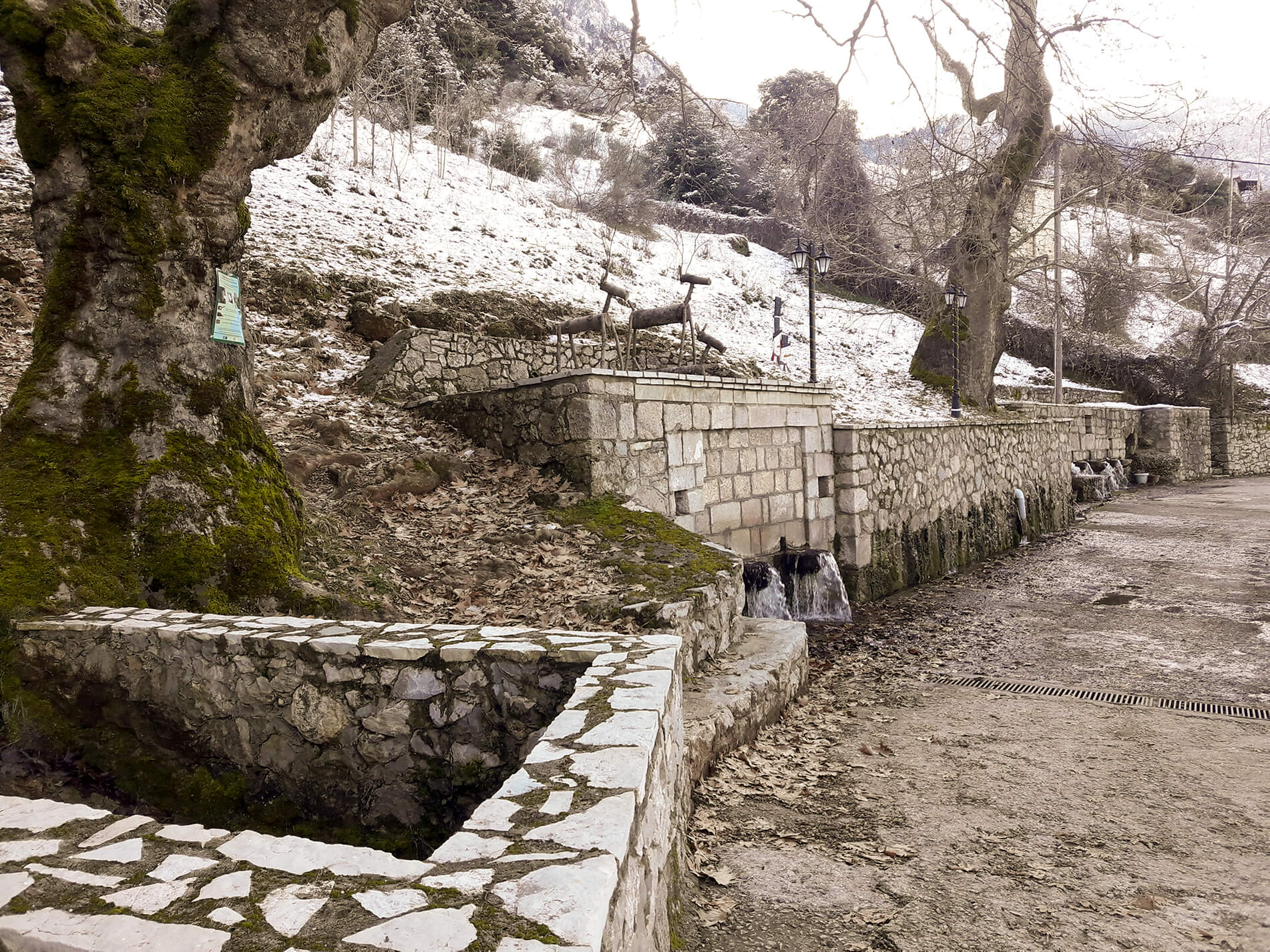 Το «trademark» του χωριού βρίσκεται στη νοτιοανατολική πλευρά του. Για να φτάσετε εκεί από την πλατεία, ακολουθείτε έναν ανηφορικό δρόμο περίπου 300 μέτρων. Θα φτάσετε σε 7 πέτρινες βρύσες από τις οποίες βγαίνει γάργαρο νερό. Τα πλατάνια που τις περιβάλλουν και ο ήχος του νερού αποτελούν το καλύτερο βίντεοκλιπ για τον φυσιολάτρη ή τον ταξιδιώτη που απλά έχει κουραστεί από τη φασαρία της Αθήνας και δεν του αρέσει ή έχει βαρεθεί την «χειμερινή Μύκονο» που λέγεται Αράχωβα.