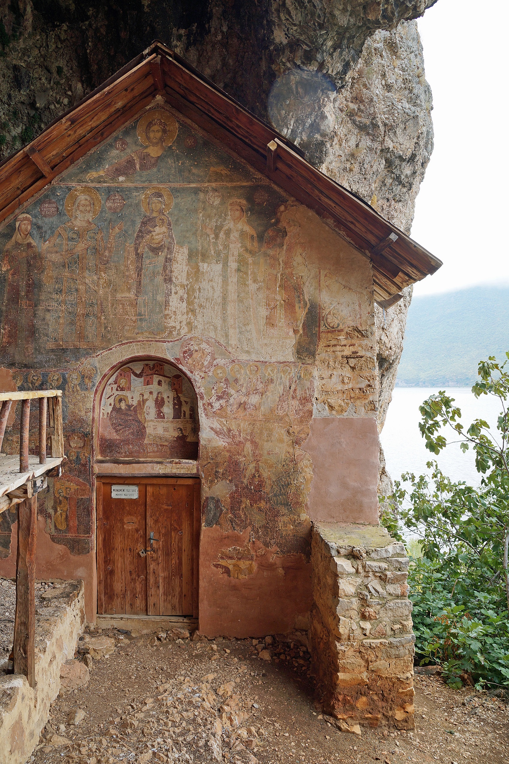 Για να δείτε το ασκηταριό της Παναγίας Ελεούσας θα δέσετε σε μια μικρή αποβάθρα, θα ανεβείτε αρκετά σκαλιά και θα προχωρήσετε στην εσωτερική κοιλότητα του βράχου, μέχρι να συναντήσετε τον μονόχωρο ναό. Η αγιογραφημένη εικόνα της πάνω από τη μικρή πόρτα χρονολογείται στον 15ο αιώνα. Στην είσοδο διακρίνεται κτητορική επιγραφή του 1409 και το όνομα του τοπικού άρχοντα Βουλκασινού, ωστόσο δεν φαίνεται να ταυτίζεται με τον Vukasin, που ξέρουμε ότι κατείχε την περιοχή μεταξύ 1355-1371.