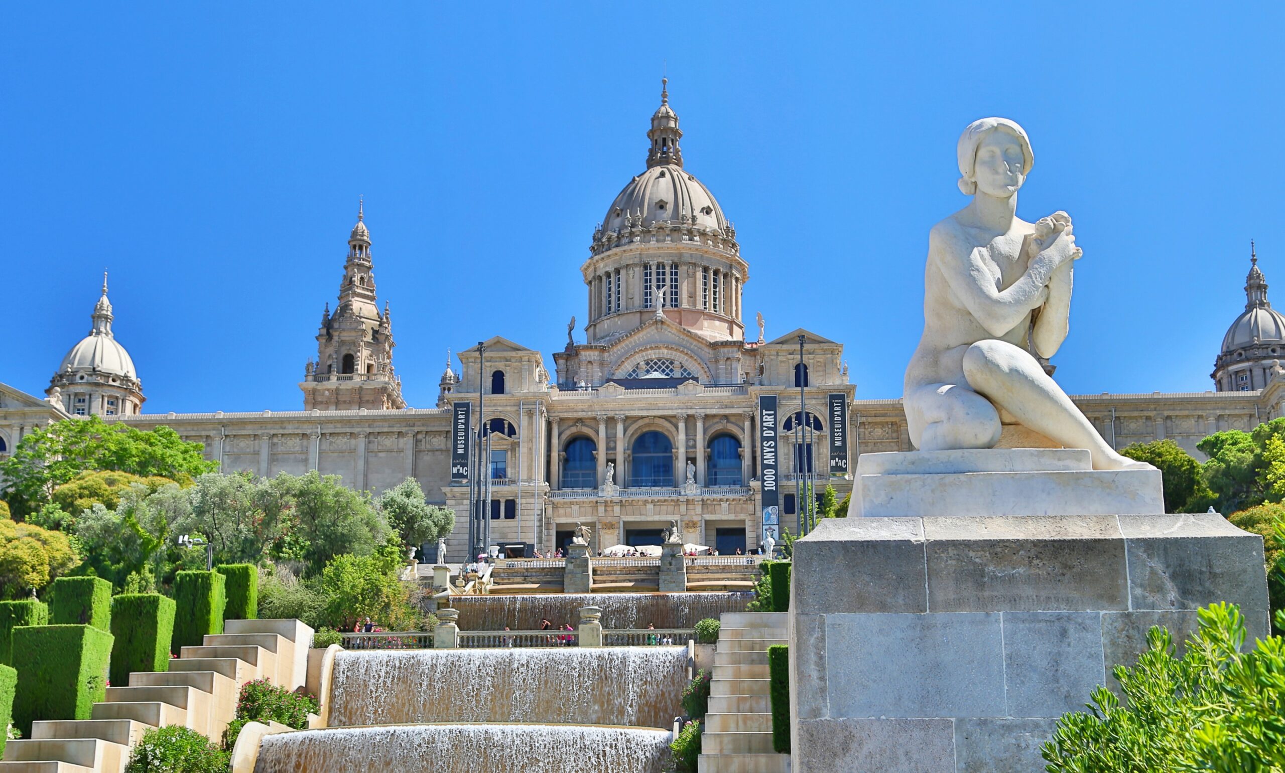 Σε μία θεαματική τοποθεσία, πάνω στον λόφο Montjüic η πρόσοψη του Εθνικού Μουσείου Τέχνης της Καταλονίας είναι τόσο εντυπωσιακή που μπορεί να συγκριθεί με λίγα κτήρια που στεγάζουν κάποιο μουσειακό ίδρυμα στον κόσμο. Το κτίσμα που λειτουργούσε ως το παλάτι της πόλης μοιάζει βγαλμένο από την πιο παραμυθένια ταινία της Disney, στην πραγματικότητα ξεπερνά ακόμα και την πιο τρελή προσδοκία ενός παιδιού με τεράστια φαντασία. Καταρράκτες κυλούν από τα επιβλητικά σκαλιά, καταλήγοντας σε ένα μεγάλο σιντριβάνι, μαρμάρινα γλυπτά προσδίδουν περισσότερη μαγεία στον προαύλιο χώρο και τη νύχτα, όταν το μουσείο φωτίζεται, τα δέντρα και οι θάμνοι που πλημμυρίζουν τους κήπους του λαμποκοπούν από μακριά, διαχέοντας ένα εκτυφλωτικό πράσινο φως.