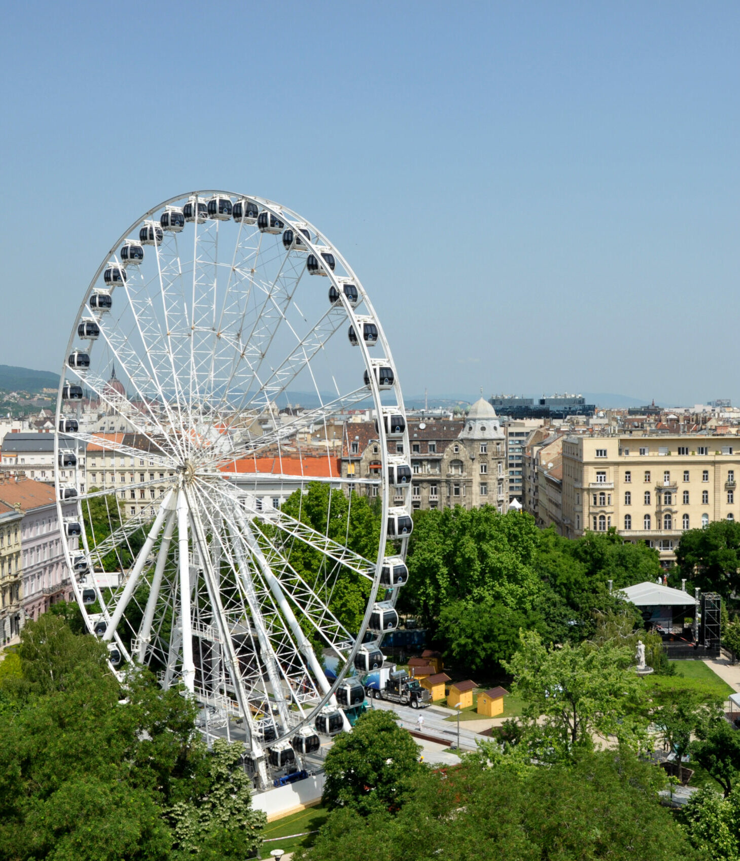 Κατευθυνθείτε στη βορειοανατολικά προς την τεράστια πλατεία Erzsébet tér όπου εκτός από τα νεαρά πλήθη που αυτή την εποχή κάνουν ηλιοθεραπεία και πικ νικ στο γρασίδι, θα βρείτε και τον Τροχό της Βουδαπέστης -πρώην Budapest Eye– ορόσημο της πόλης από το 2017 που άνοιξε. Ανεβαίνοντας σε μία από τις 42 καμπίνες του, θα απολαύσετε μαγευτική θέα της ουγγρικής πρωτεύουσας από ύψος 65 μέτρων. Από την πλατεία εξάλλου, μικρή είναι η απόσταση ως την εκθαμβωτική, νεοκλασικού ύφους Βασιλική του Αγίου Στεφάνου, που από κοινού με το Κοινοβούλιο κατέχει το ρεκόρ του ψηλότερου κτηρίου της πόλης, φτάνοντας τα 96 μέτρα και φέρει το όνομα του πρώτου Βασιλιά της Ουγγαρίας. Η ανάβαση των 364 σκαλοπατιών που οδηγούν στο θόλο -εναλλακτικά υπάρχει ανελκυστήρας-, θα σας αποζημιώσει με επίσης καταπληκτική θέα της βασίλισσας του Δούναβη και του γαλάζιου ποταμού.