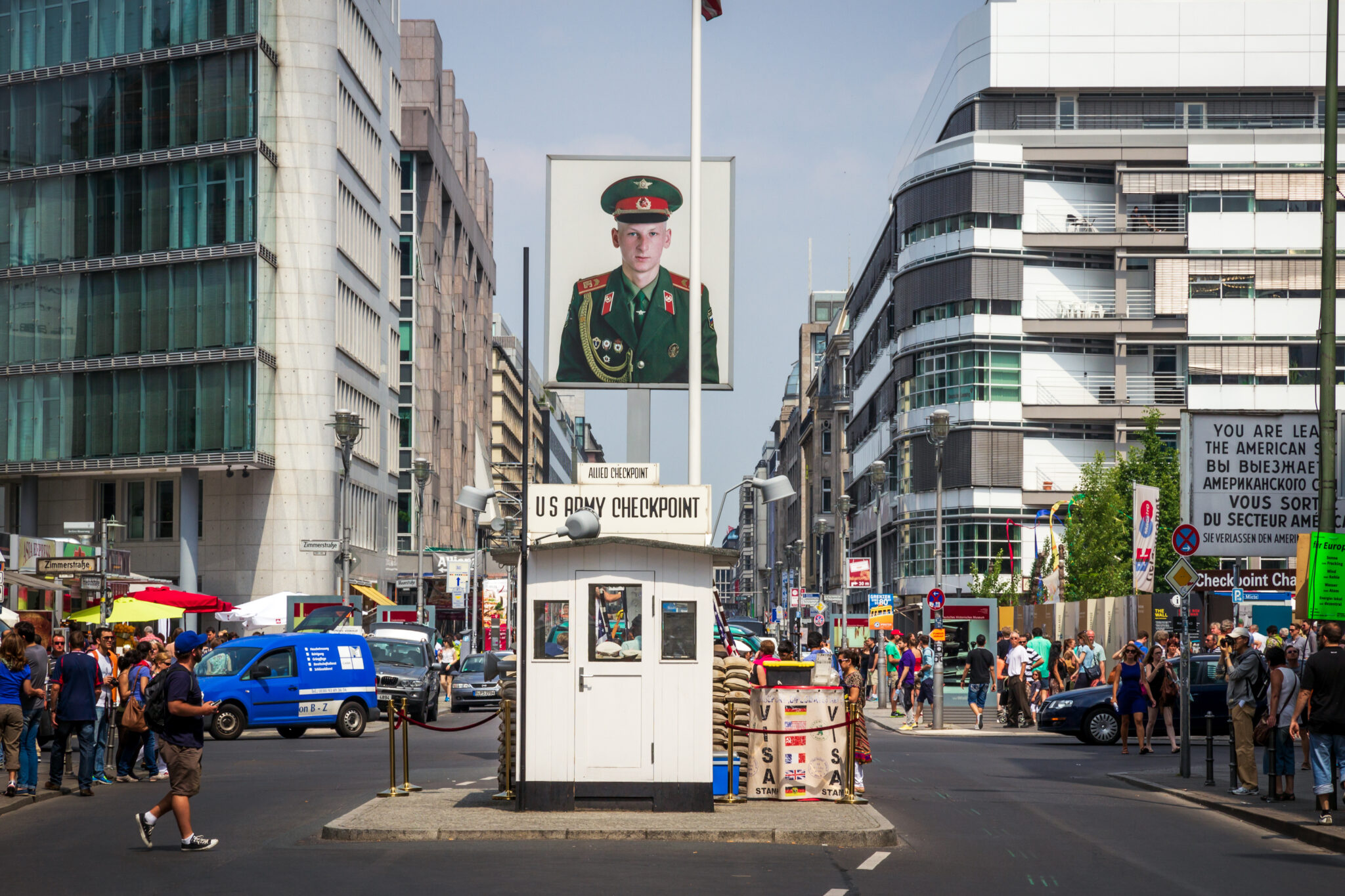 Λίγο πιο δίπλα στην πλατεία Πότσνταμ -για την ακρίβεια δύο στάσεις με το μετρό- θα δείτε το πιο γνωστό τουριστικό σύμβολο του Ψυχρού Πολέμου, το περιβόητο Checkpoint Charlie. Αν και η σημερινή Friedrichstraße δεν έχει καμία -μα καμία- σχέση με τον ίδιο δρόμο στα χρόνια του Τείχους, εδώ θα μπορέσετε να δείτε ένα ακόμα μικρό κομμάτι του Τείχους σφηνωμένο σε ένα πεζοδρόμιο λίγο πιο πέρα από το πλήρως τουριστικοποιημένο Checkpoint Charlie. Αν και δεν είναι το πιο χαρακτηριστικό δείγμα του Τείχους, είναι ένα από τα λίγα σήμερα σωζόμενα κομμάτια πάνω στο οποίο μπορείτε, άμα θέλετε, και να καθίσετε, ενώ μην εκπλαγείτε αν δείτε να πωλούνται και μικρά κομμάτια του Τείχους στα κοντινά μαγαζιά.