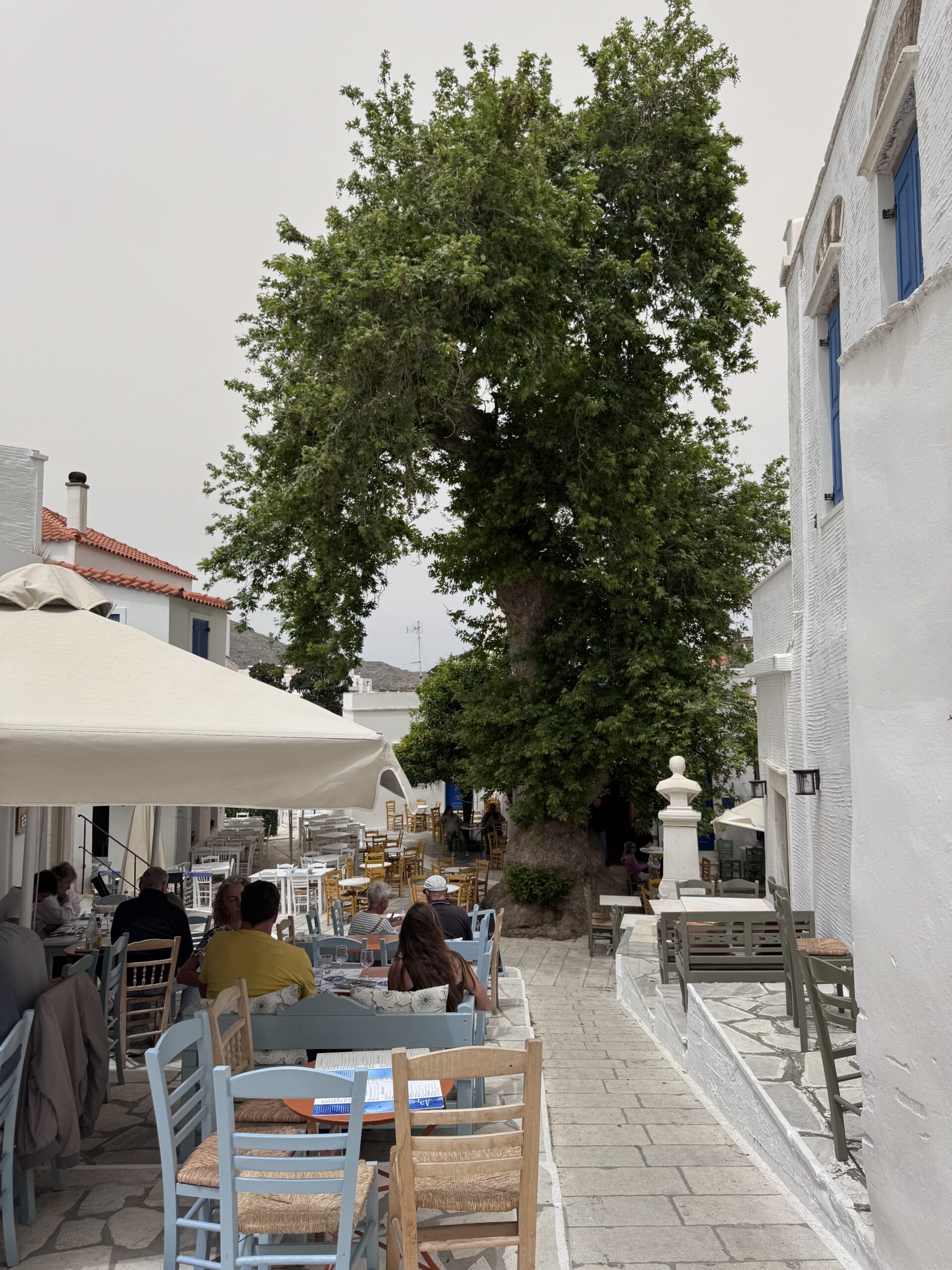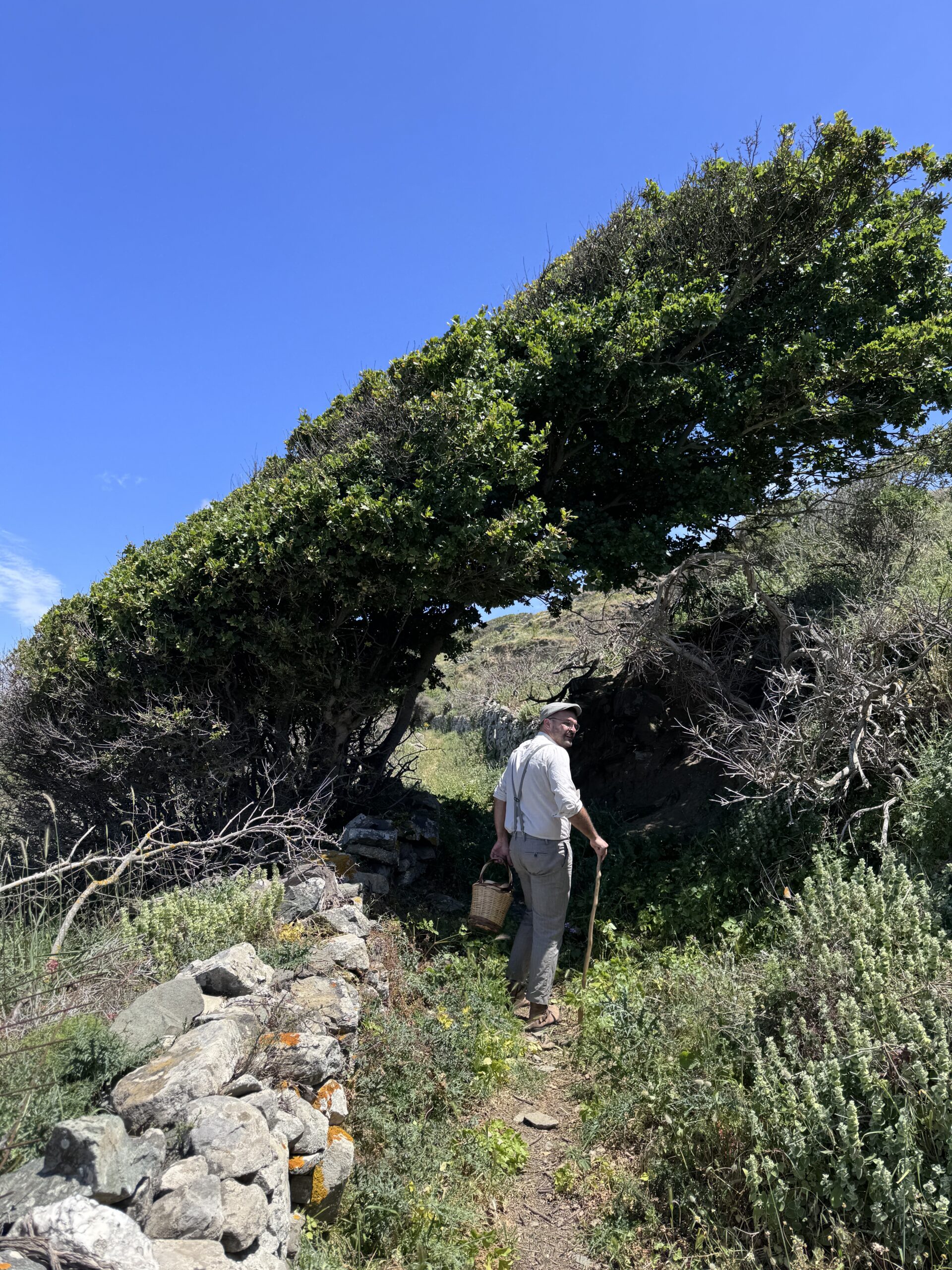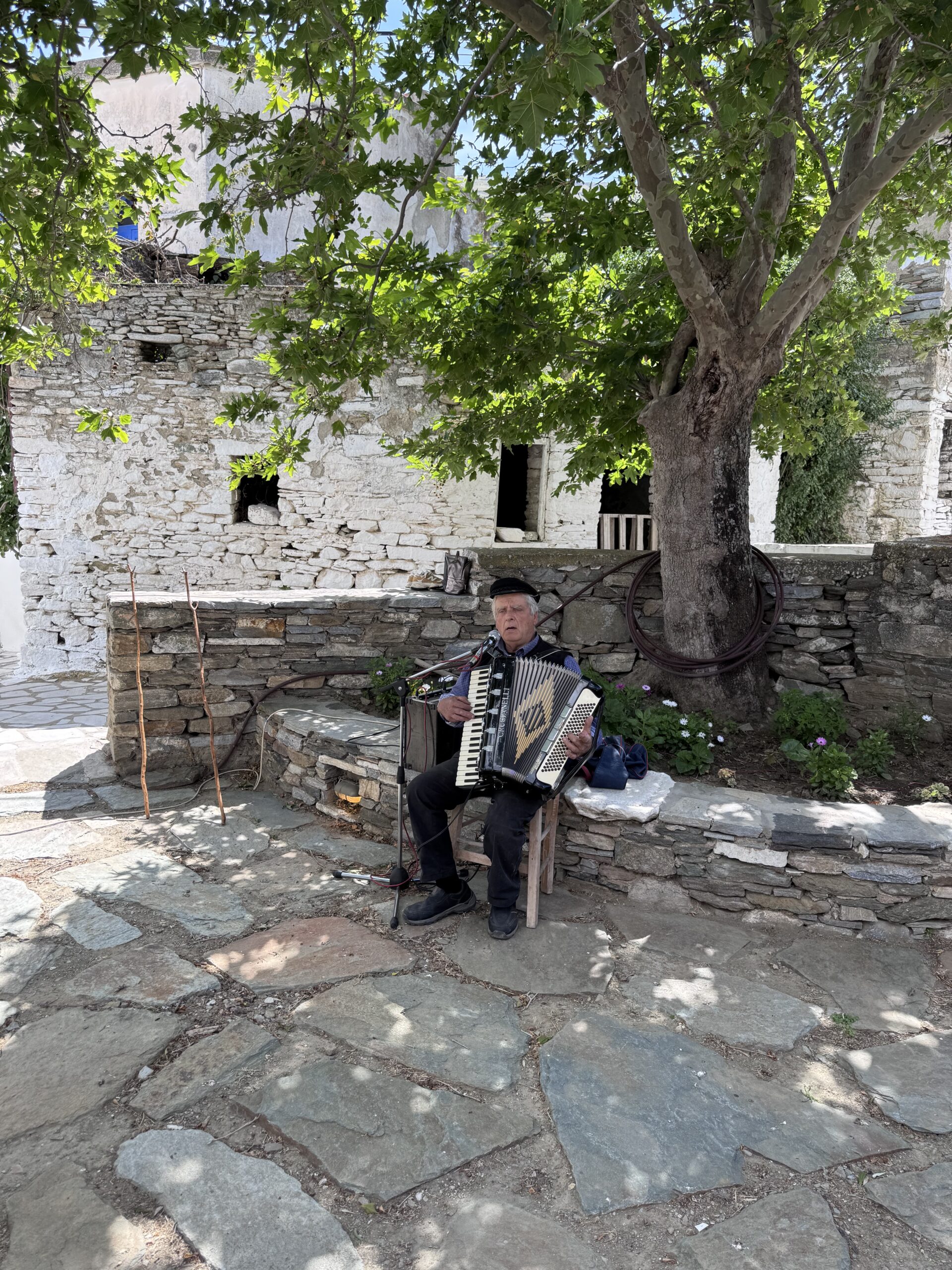 Δίπλα, ακριβώς σε ένα καμαράκι με ξυλόφουρνο, ο Μάρκος και η κυρία Τερέζα ετοίμασαν την ομελέτα, τους πατατοκεφτέδες, τα μαραθοπιτάκια, το κατσικάκι στον φούρνο με τις πατάτες, και πολλά, πολλά ακόμη. Σε μια καρέκλα, στα ριζά του πλατάνου, ο κύριος Αντώνης, αυτοδίδακτος μουσικός, έπαιζε ακορντεόν και τραγουδούσε με μια ιδιαίτερα μελωδική φωνή, που μας ξεσήκωσε και ρίξαμε και τη στροφή μας, πριν αποχαιρετήσουμε το νησί.