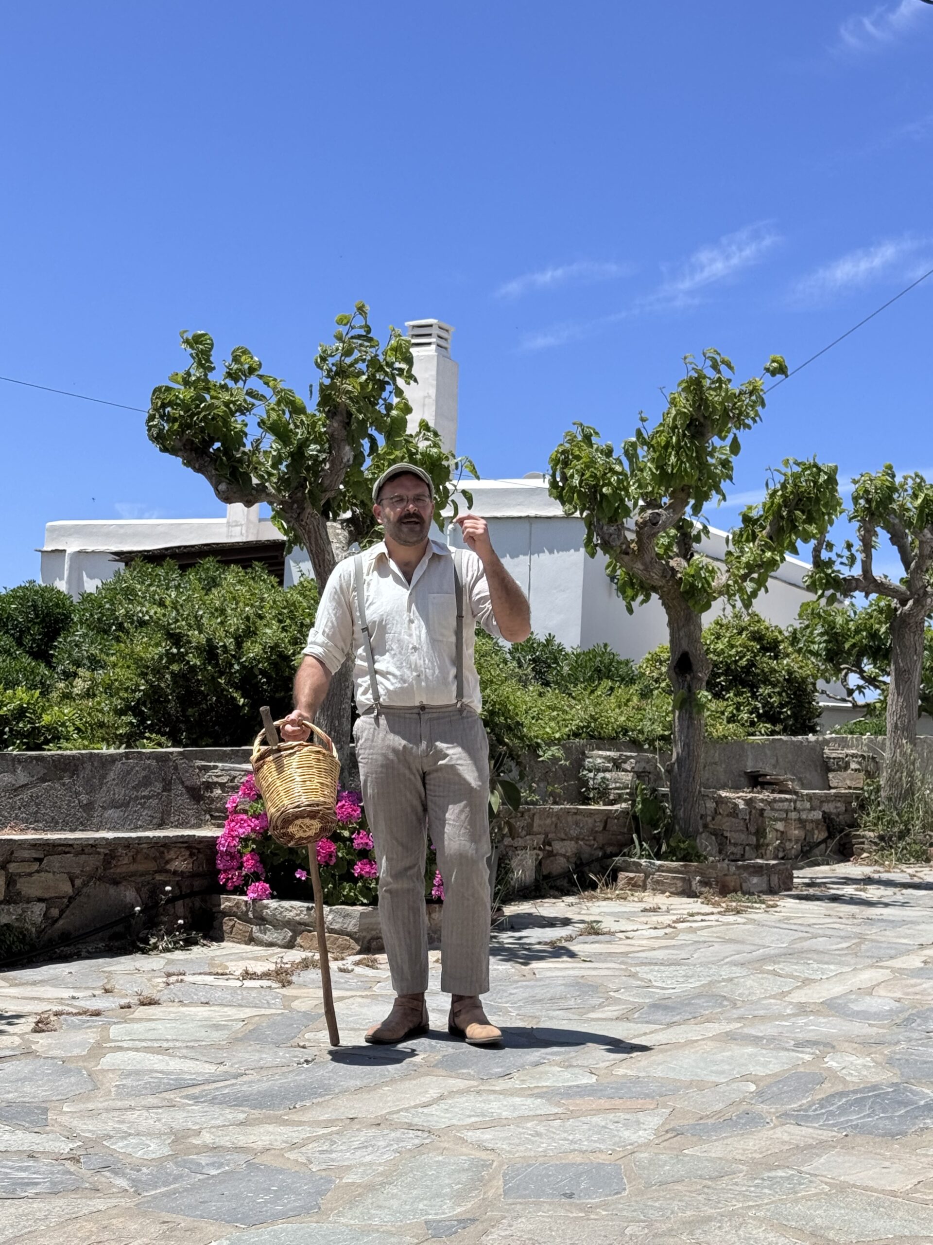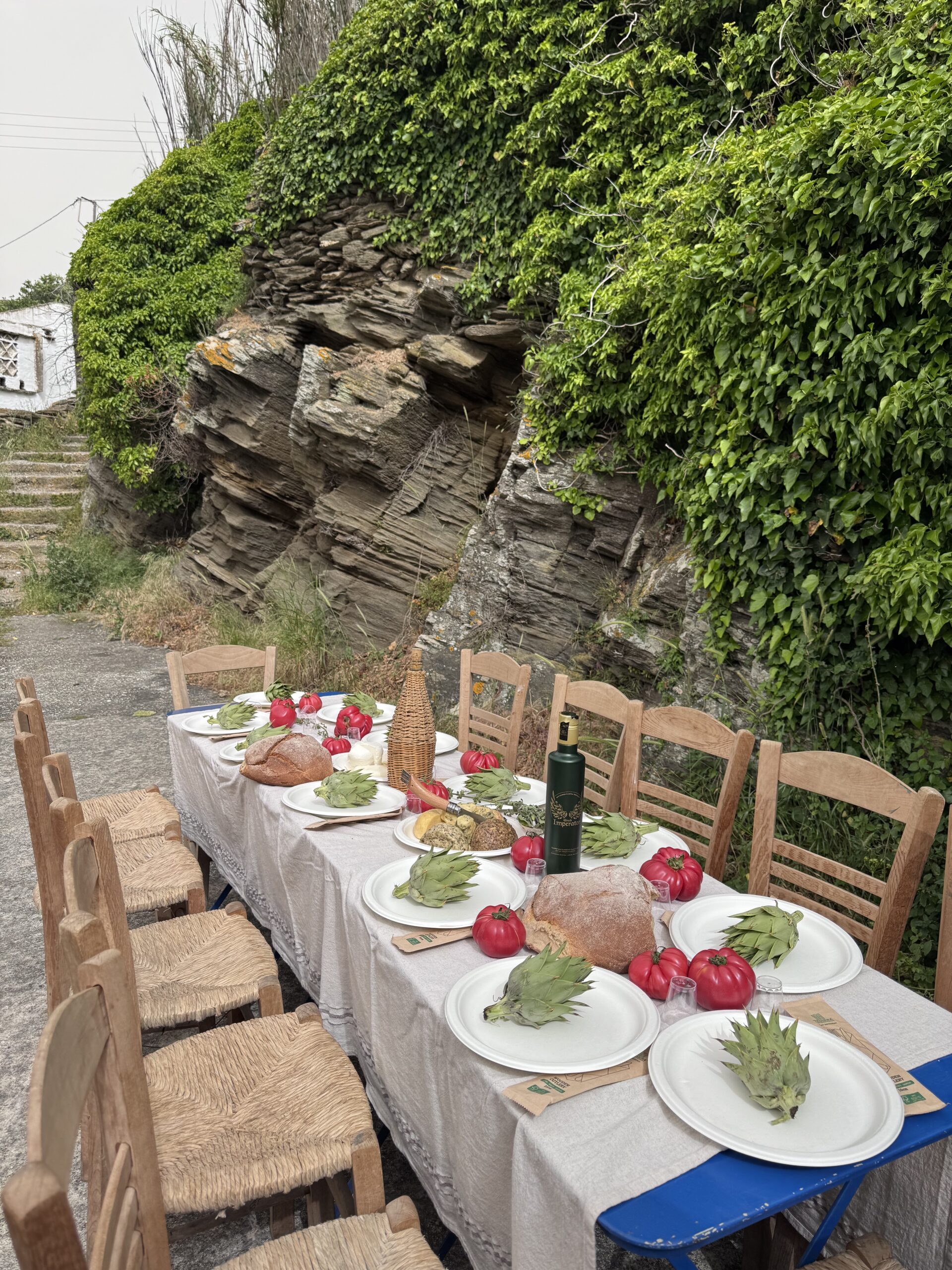 Λίγο πιο κάτω, σε μια γωνιά όπου η φύση πραγματικά οργίαζε, πάνω από ένα παλιό υδραγωγείο και δίπλα σε ένα μικρό πέτρινο γεφύρι, ο Ευριπίδης Αποστολίδης, συνεργάτης των αδερφών Σουράνη, είχε στήσει ένα υπέροχο πικνίκ γεμάτο ντόπια καλούδια: καταπληκτικές πρώιμες ντομάτες -φουλ ζουμερές-, βολάκι, καρίκι, παλαιωμένη γραβιέρα, τα διάσημα αγκιναράκια της Τήνου, άγρια και ήμερα, πικλαρισμένα αλλά και φρέσκα, και φυσικά, άφθονη ρακή και κρασί.