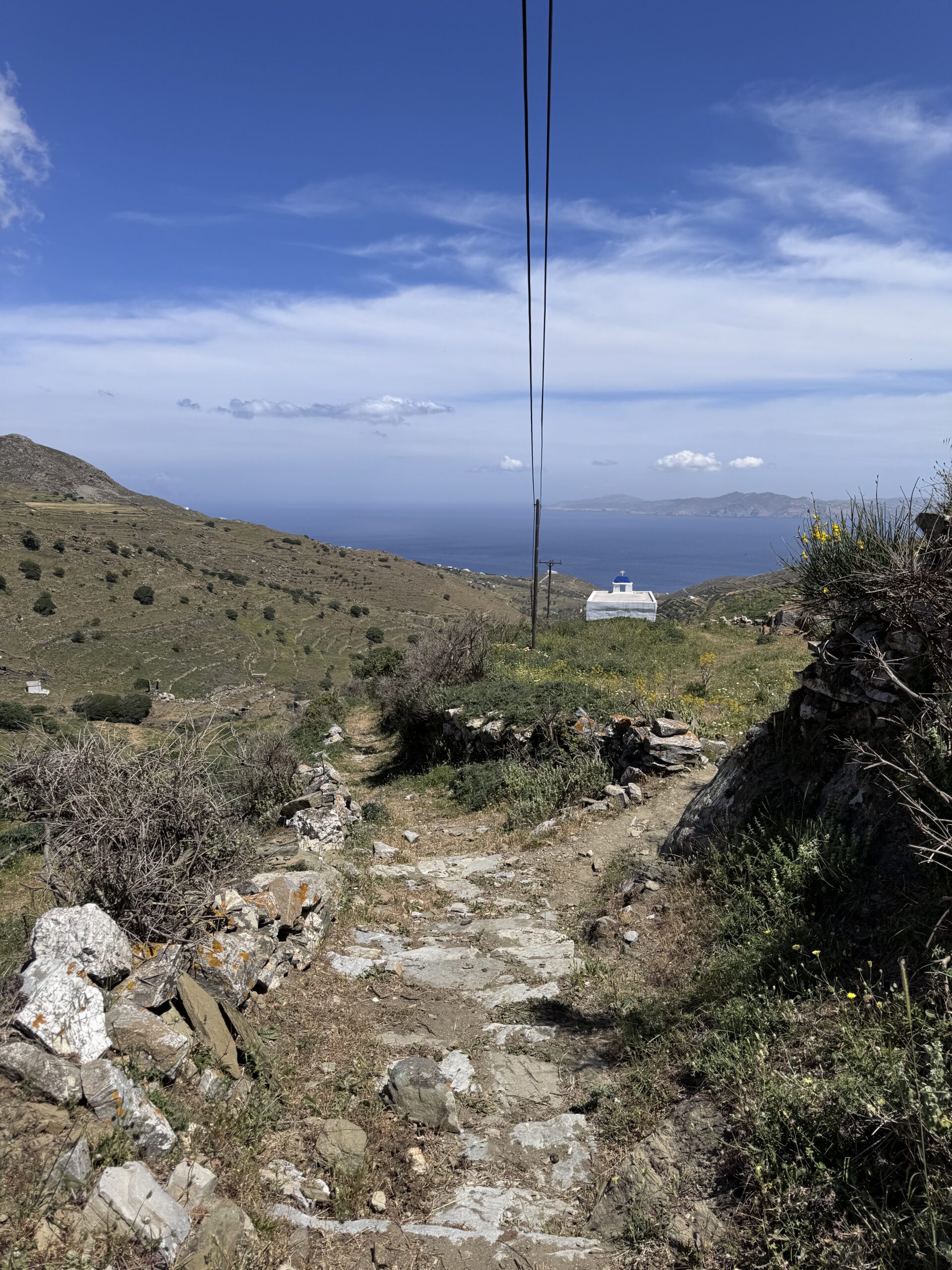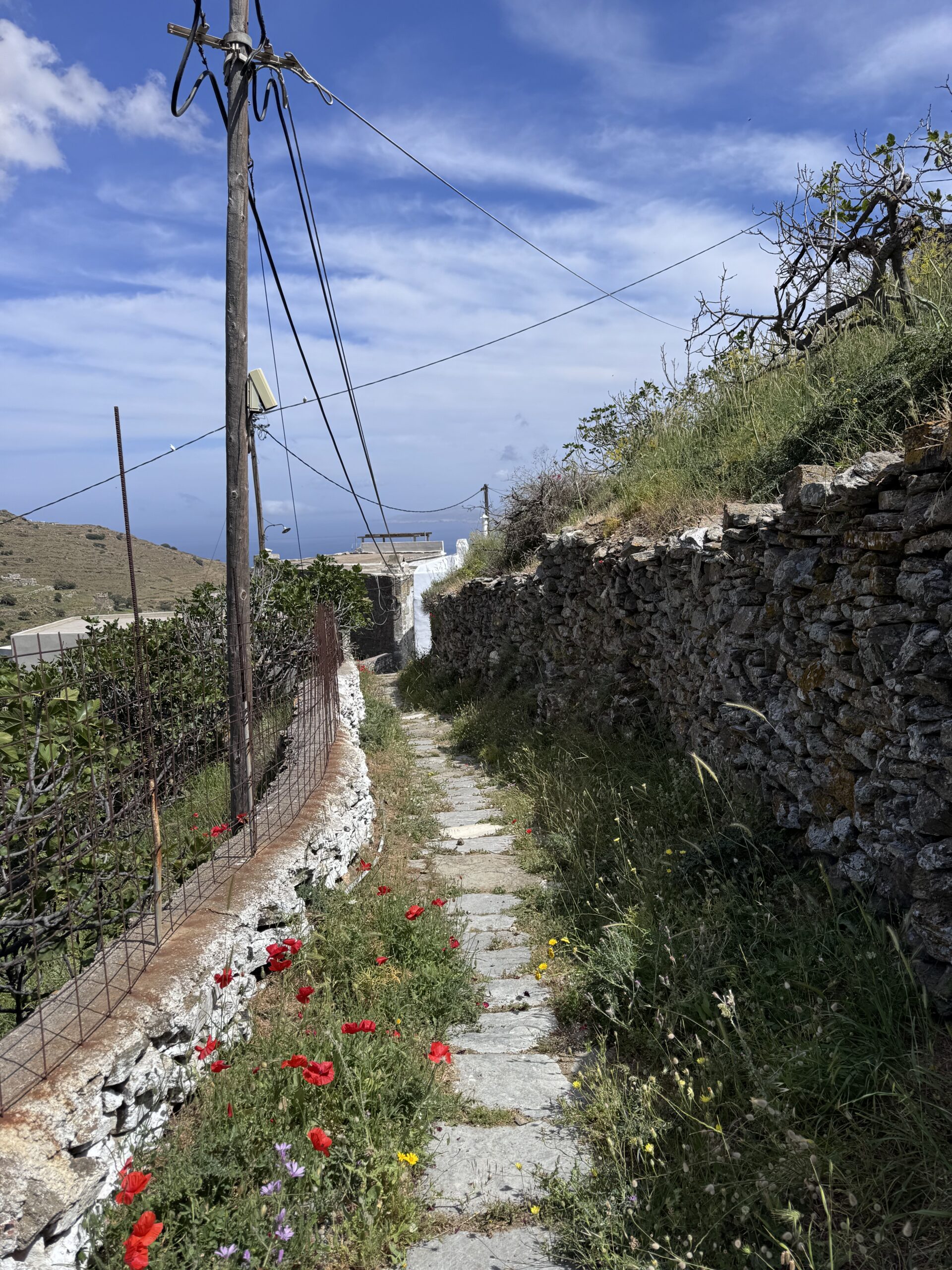 Αποχαιρετώντας τις ξεναγούς μας στη Μονή, κατευθυνόμαστε προς τον Φαλατάδο. Εκεί έχουμε δώσει ραντεβού, στη μικρή πλατεία της Αγίας Τριάδας, με τον Μάρκο, έναν καθηγητή φιλολογίας, γεννημένο στο Παγκράτι, με καταγωγή από το νησί, ο οποίος παράτησε τη ζωή του στην Αθήνα για να επιστρέψει στην Τήνο και να ασχοληθεί με τα μονοπάτια της.