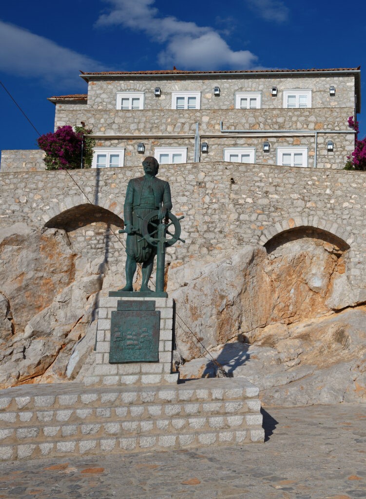 Φτάνοντας με το καΐκι στο λιμάνι, το πρώτο πράγμα που αντικρίζει κανείς είναι η αμφιθεατρική διάταξη των σπιτιών που απλώνονται σαν κέλυφος γύρω από τα γαλήνια νερά. Περπατώντας στον κεντρικό παραλιακό δρόμο Παύλου Κουντουριώτη, που ολοκληρώθηκε το 1912, ο επισκέπτης συναντά τον ανδριάντα του Μιαούλη, του γενναίου ναυάρχου της Ελληνικής Επανάστασης, του οποίου η ταριχευμένη καρδιά φυλάσσεται σε ασημένια λήκυθο στο Ιστορικό Αρχείο-Μουσείο.