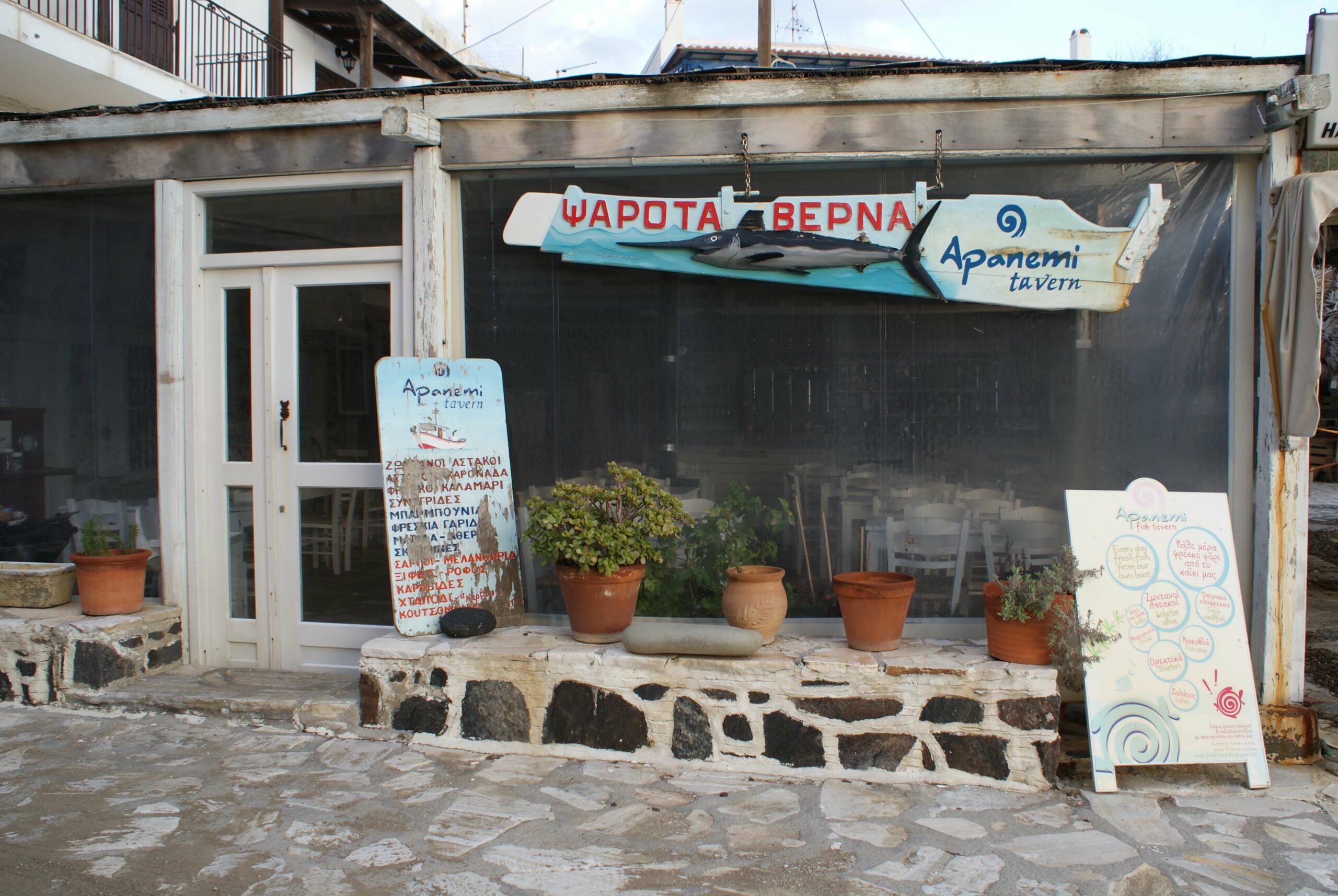 Ακόμη και το χειμώνα, είναι καθημερινά ανοιχτό το καφέ Jax, όπου η Κυριακή σερβίρει μερακλίδικο καφέ, νόστιμα σαντουιτσάκια και τα διάσημα αφράτα ντόνατς της. Ακριβώς μπροστά στο λιμανάκι, τα Σαββατοκύριακα αλλά και κάποιες επιλεγμένες μέρες, η πιο διάσημη ταβέρνα της ανατολικής Νάξου, η Απανέμη, σερβίρει θεϊκό καρπάτσιο ολόφρεσκων ψαριών, βραστά χόρτα, μακαρονάδες με θαλασσινά, διάσημες σε όλες τις Κυκλάδες και ζουμερά παϊδάκια από δικά τους ζώα. Τηλεφωνήστε πριν καταφτάσετε για να τσεκάρετε αν είναι ανοιχτή.