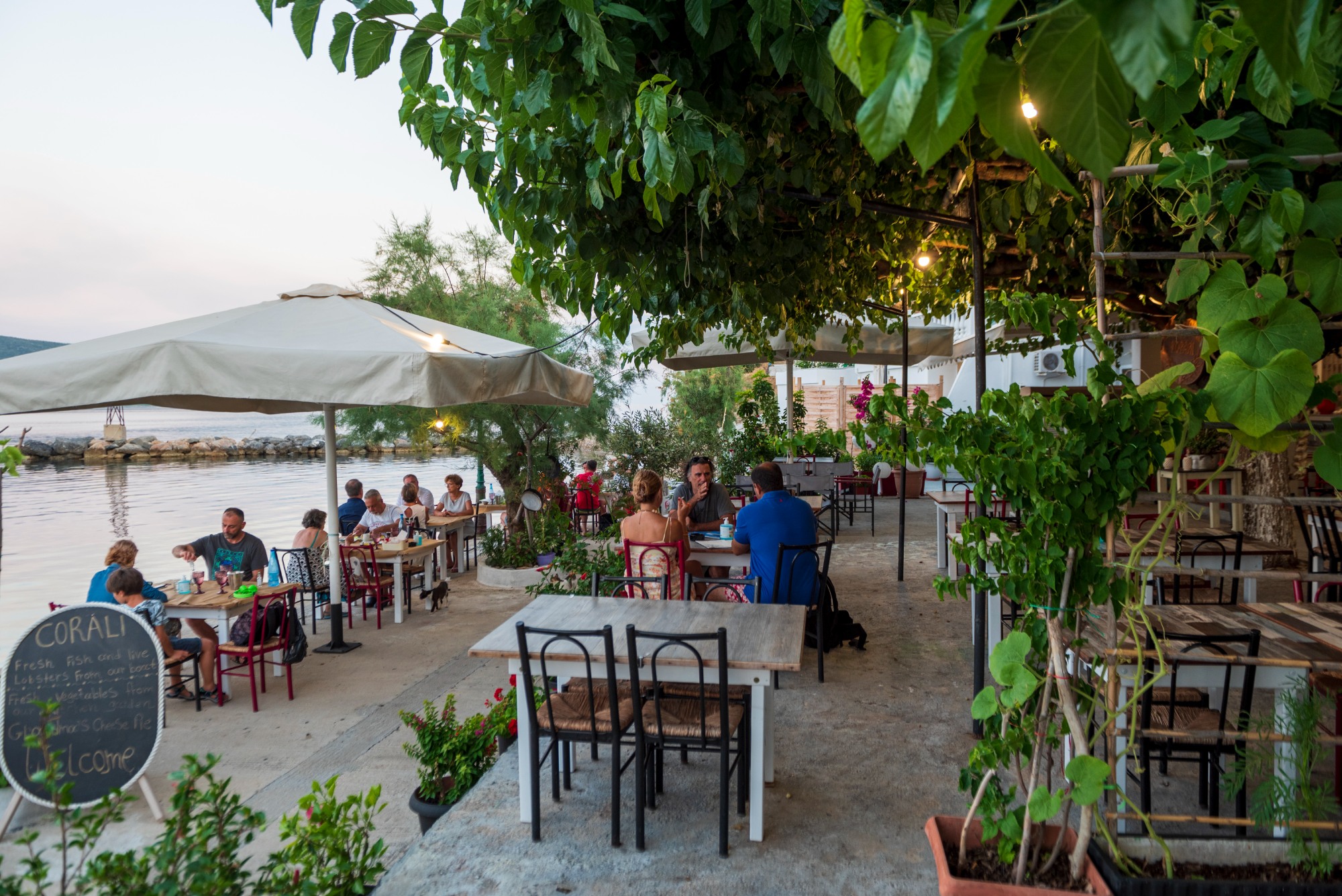 Ο παραθαλάσσιος οικισμός, Καλαμάκια, βρίσκεται στο μέσο ακριβώς της ανατολικής πλευράς της Αλοννήσου, αποτελώντας τον απόλυτο προορισμό για ντόπιους και επισκέπτες που έχουν αδυναμία στα φρέσκα ψάρια και τους ψαρομεζέδες. Από τη μια μεριά τα δεμένα ψαροκάικα και από την άλλη οι ταβέρνες των ιδιοκτητών τους, με τα τραπεζοκαθίσματα στην προβλήτα. Καθίσαμε με την παρέα μας στο «Κοράλι». Τα χρώματα του δειλινού και η ησυχία, δίπλα στη θάλασσα, προκαλούν ευδαιμονία. Έγινε μεγαλύτερη, όταν κατέφθασαν οι ψαρομεζέδες και τα ουζάκια. Ο Σταμάτης Αναγνώστου, ιδιοκτήτης της ταβέρνας, που ψαρεύει με το τρεχαντήρι «Άγιος Ηλίας», μας κατατόπισε σχετικά: «Παλιότερα πήγαινα μέχρι τον Αη-Στράτη για ψάρεμα. Η περιοχή μας είναι καλός ψαρότοπος. Ανάλογα με την τοποθεσία που θα πας, θα βγάλεις και τα ψάρια που θέλεις. Εγώ ψαρεύω κυρίως, αστακούς, σκορπίνες και μπαρμπούνια». Εμείς πάντως δοκιμάσαμε έναν σαλούβαρδο λεμονάτο, παχύ ψάρι με υπέροχη γεύση, που μας ετοίμασε η μαγείρισσα κα Μάχη Αναγνώστου. Κι επειδή δεν ήθελε να μας αφήσει παραπονεμένους -καθώς δεν είχαμε φάει κατά την παραμονή μας στο νησί, την περίφημη, Αλοννησιώτικη πίτα- άπλωσε φύλλο επί τόπου, την έψησε και βέβαια θα την ευχαριστούμε για πάντα, τόσο για το ιδανικό «ξεψάρισμα» που μας πρόσφερε όσο κυρίως για τη χειρονομία.